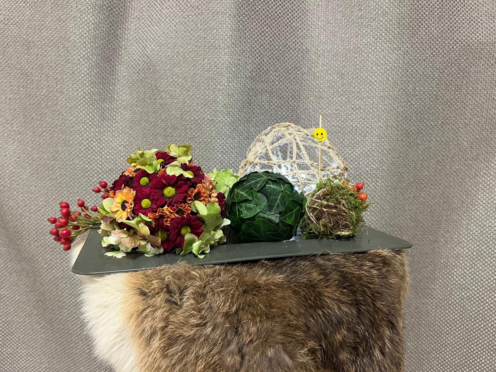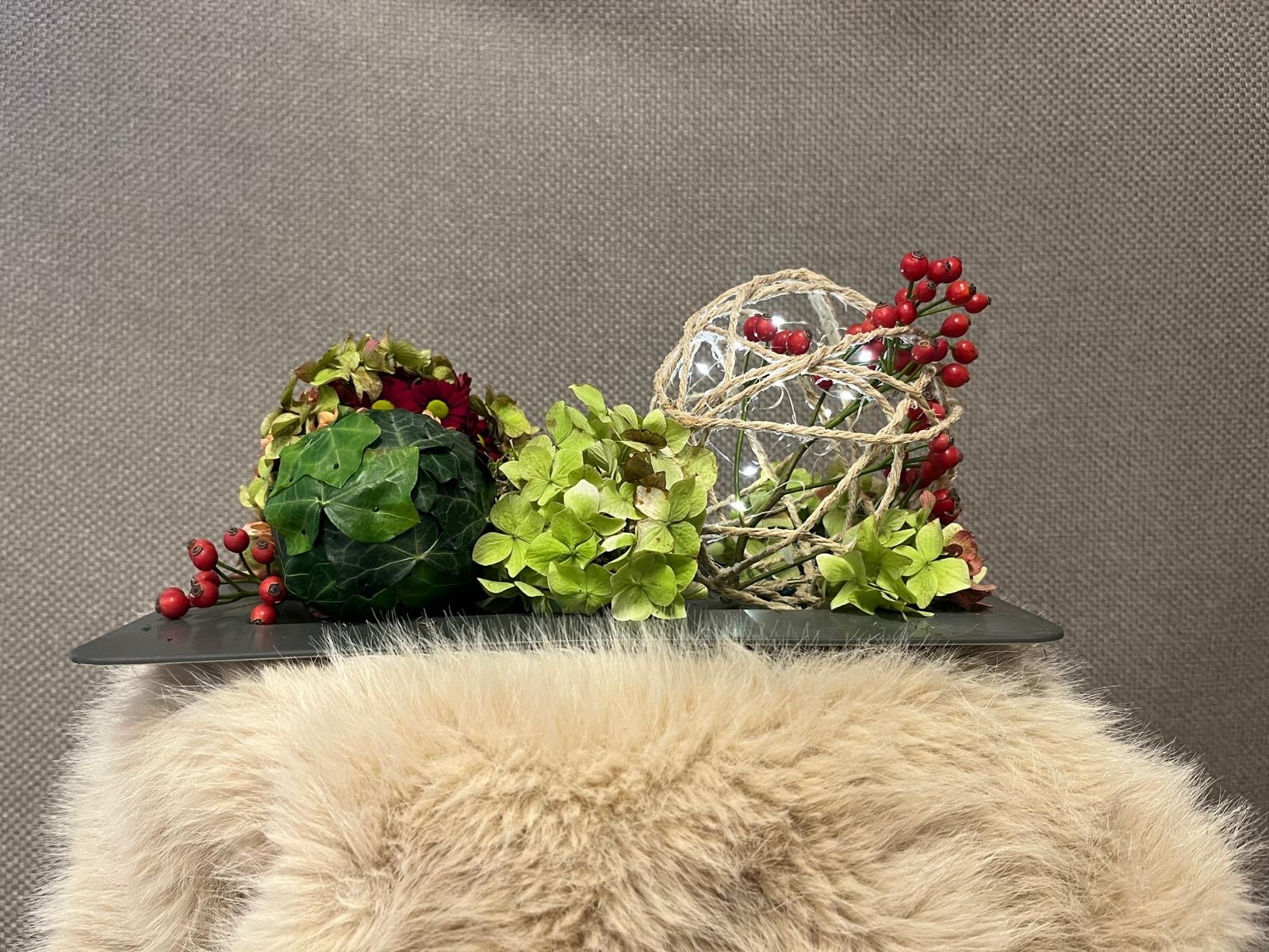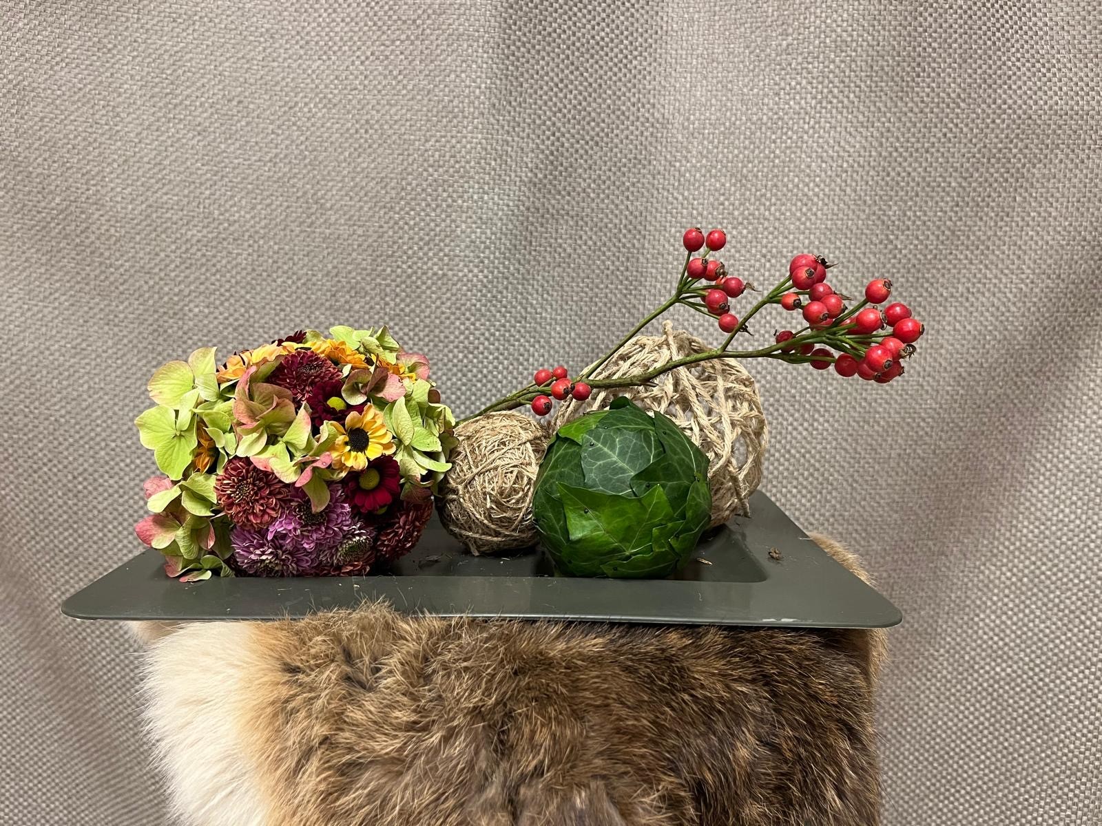 Mijn tip voor jou is om dit arrangement nu nog een keer te maken. Deze is al leuk geworden en nu heb je zulk mooi grijsblad en andere materialen wat leuk droogt.Ook op een ronde schaal erg leuk.