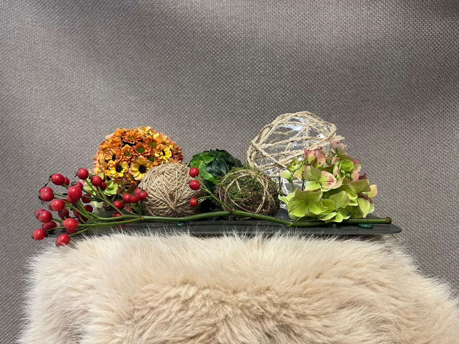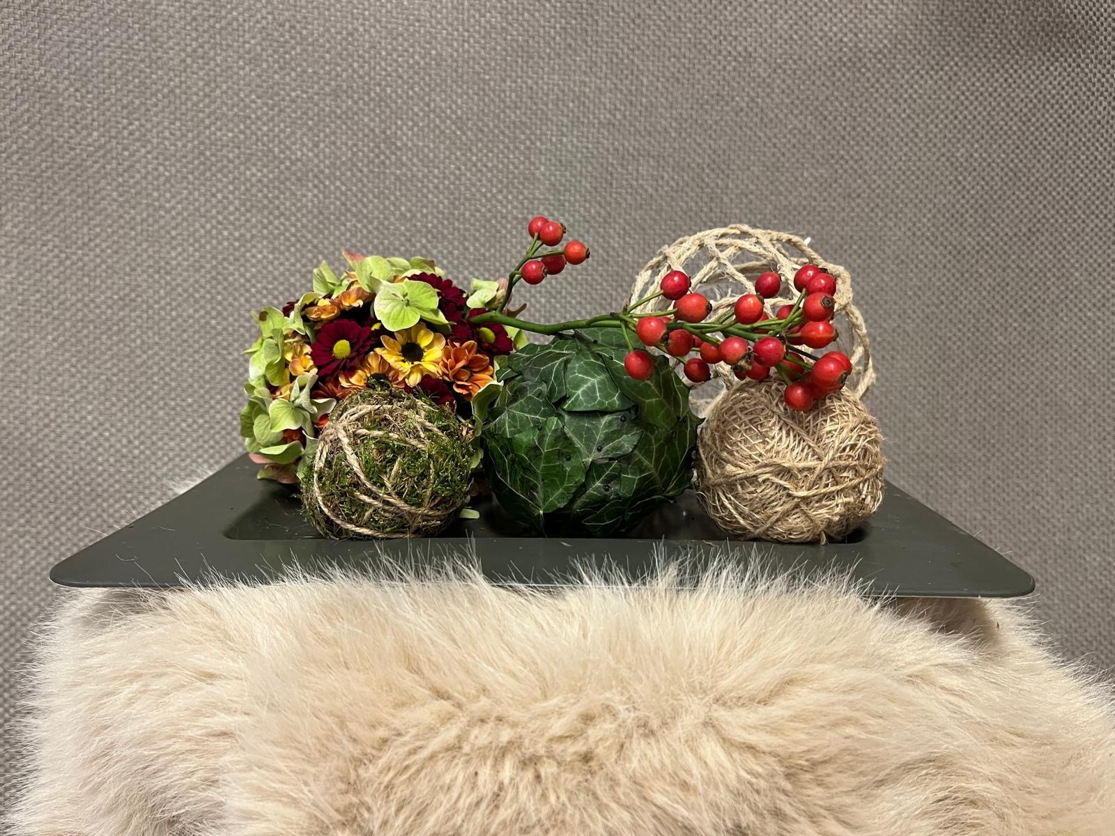 Het is een heel leuk en modern arrangement. Toevallig was ik zelf ook met het bekleden van ballen bezig. Een heb ik bekleed met heide en een met peulen van de Gleditsia, wel lastig om te doen maar het is wel leuk geworden en in een ander arrangement een kleine droogschuim bal met kleine appeltjes. groeten Peta
