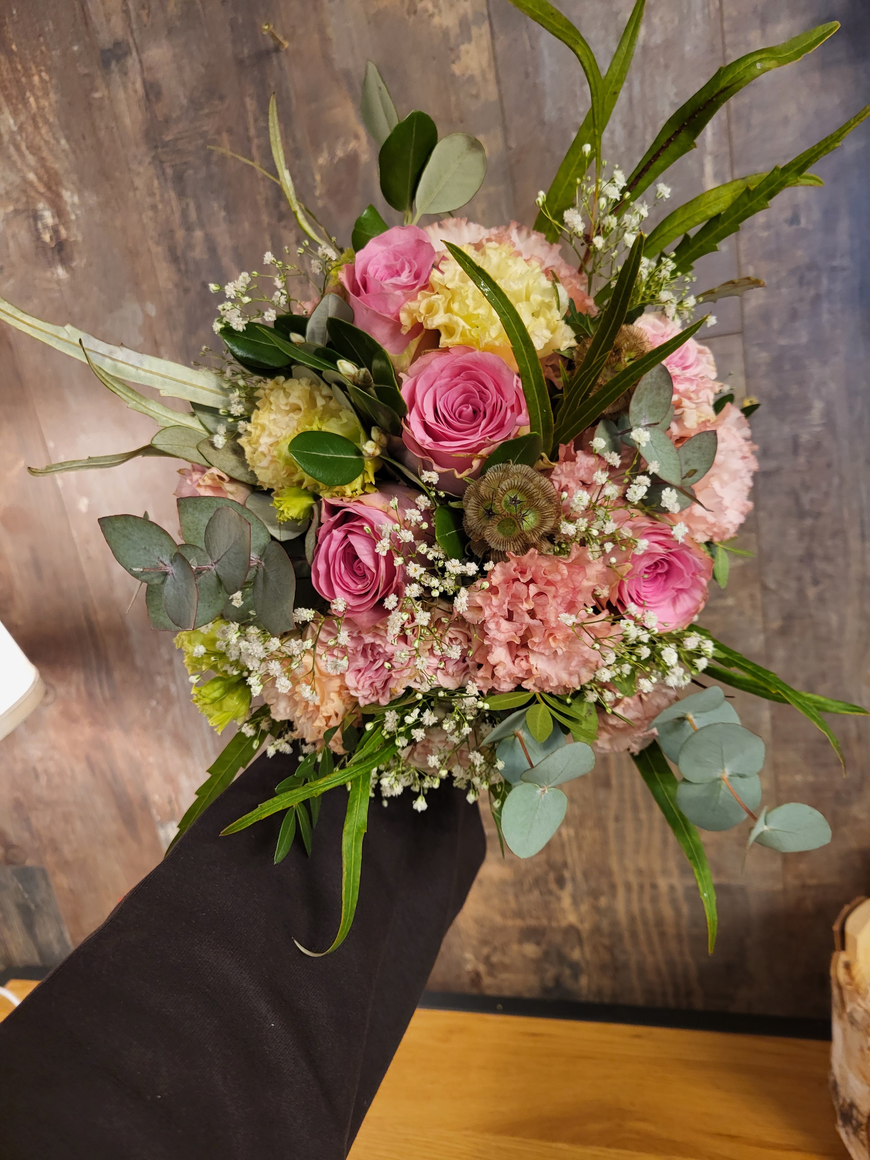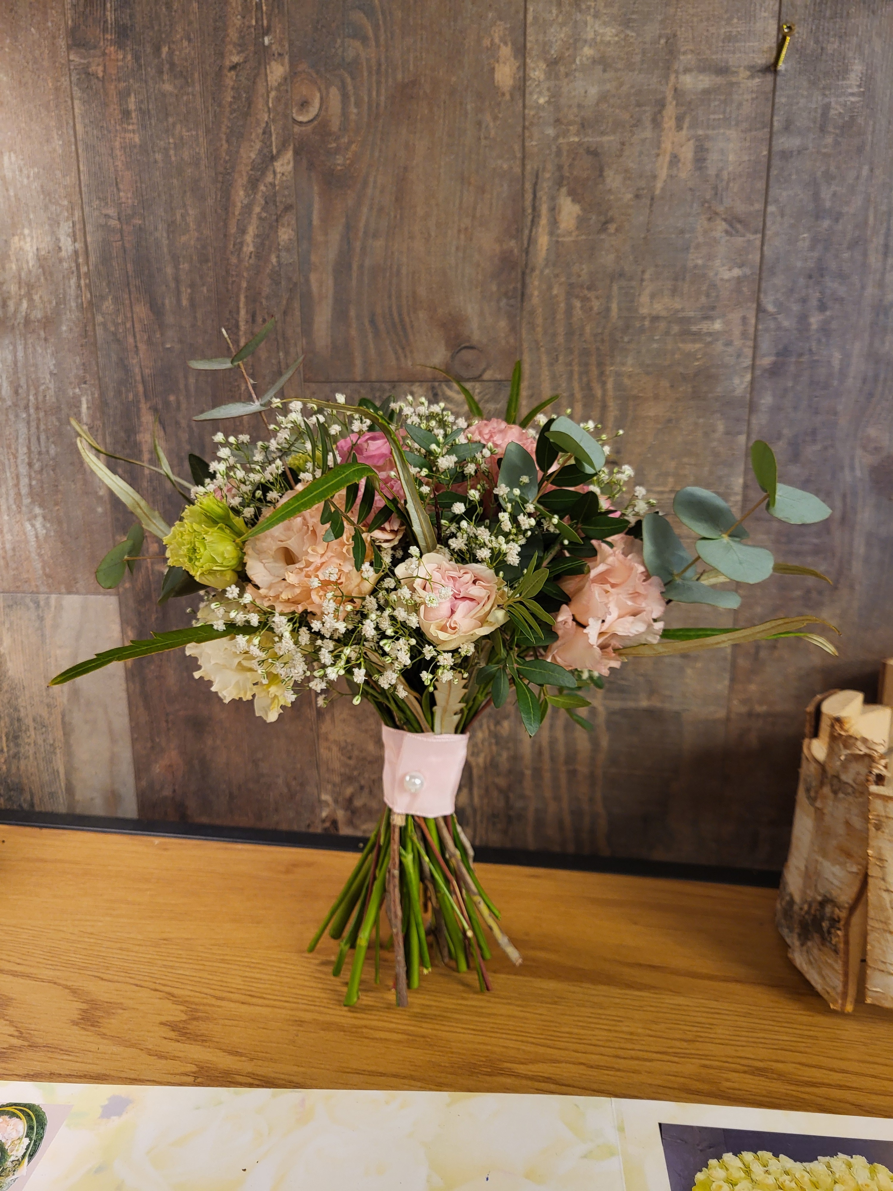 Mijn eerste biedermeier bruidsboeket. Graag hoor ik wat je er van vindt, vind zelf de eucalyptus niet mooi maar de vraag was gipskruid wit en pastelkleur en dat is wel lastig. Vandaar dat grijze blad ook aan de onderkant.