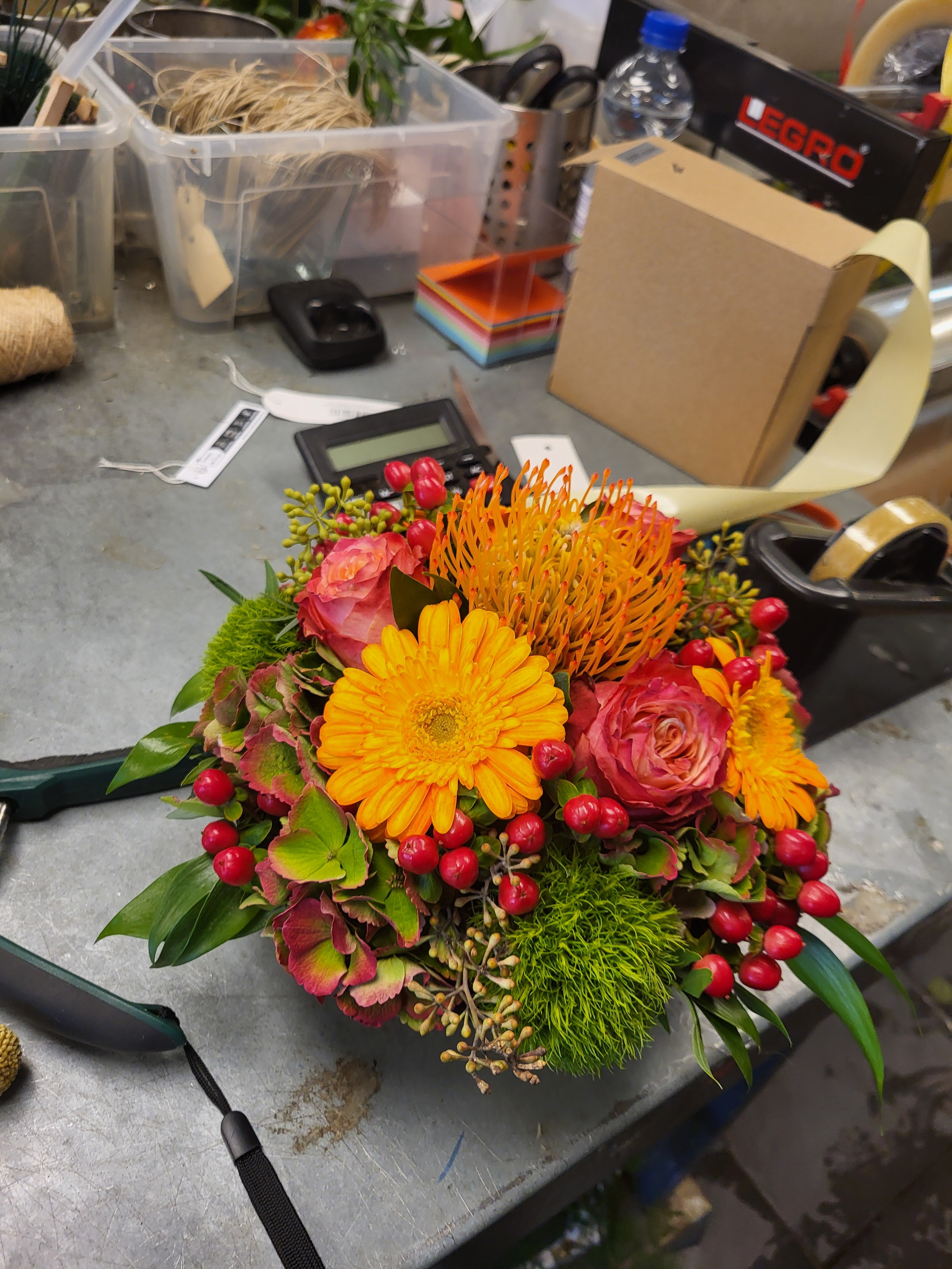 Het is een prachtige Biedermeier geworden! Vooral met deze herfstkleuren wordt je er vrolijk van. Je vorm is hartstikke goed en ook de verdeling is keurig gegaan. Vooral van boven af kan ik dat goed zien. Grappig dat je één Leucaspermum in het midden hebt gebruikt. Zo is hij meteen meer waard. Ik denk dat hij snel verkocht was.