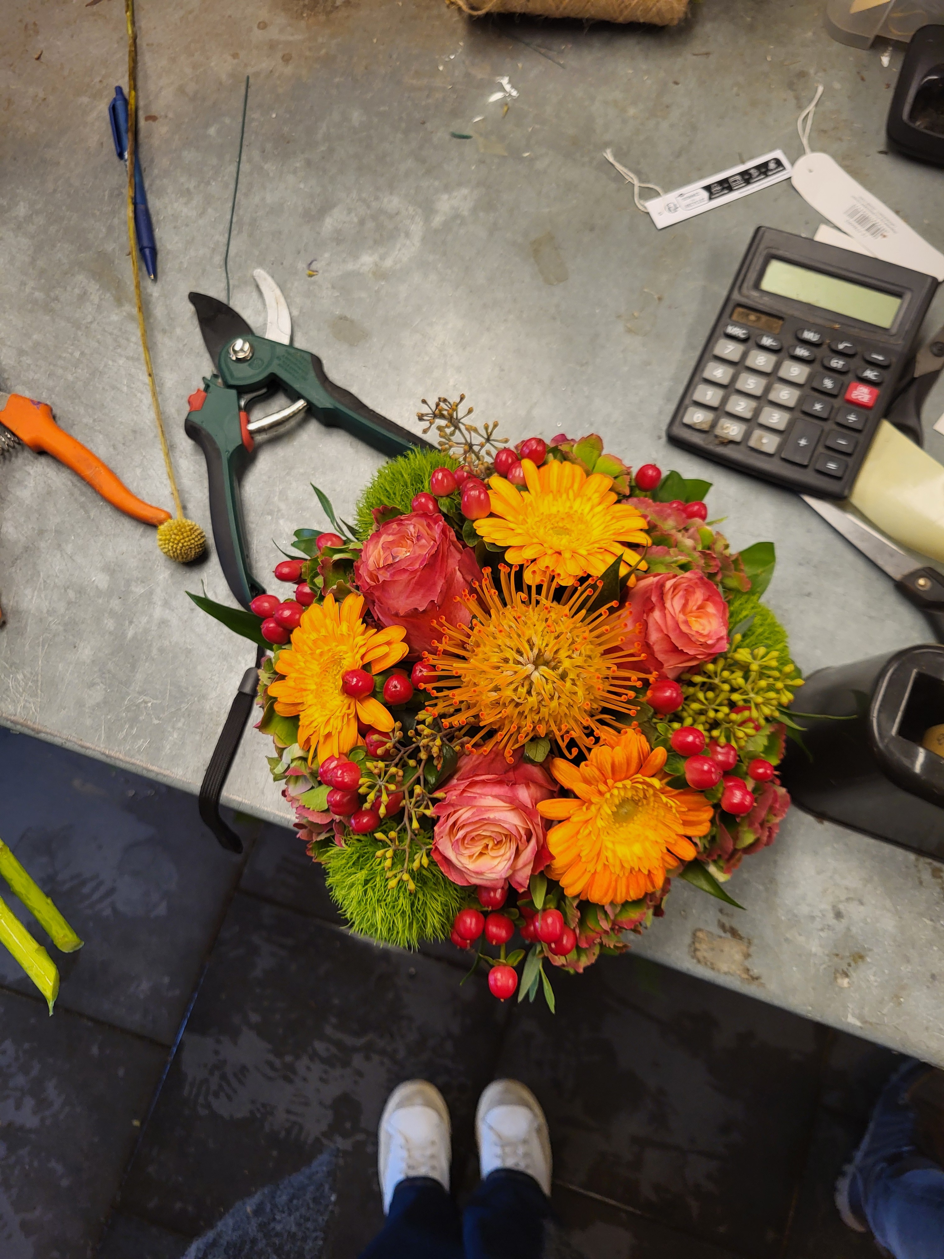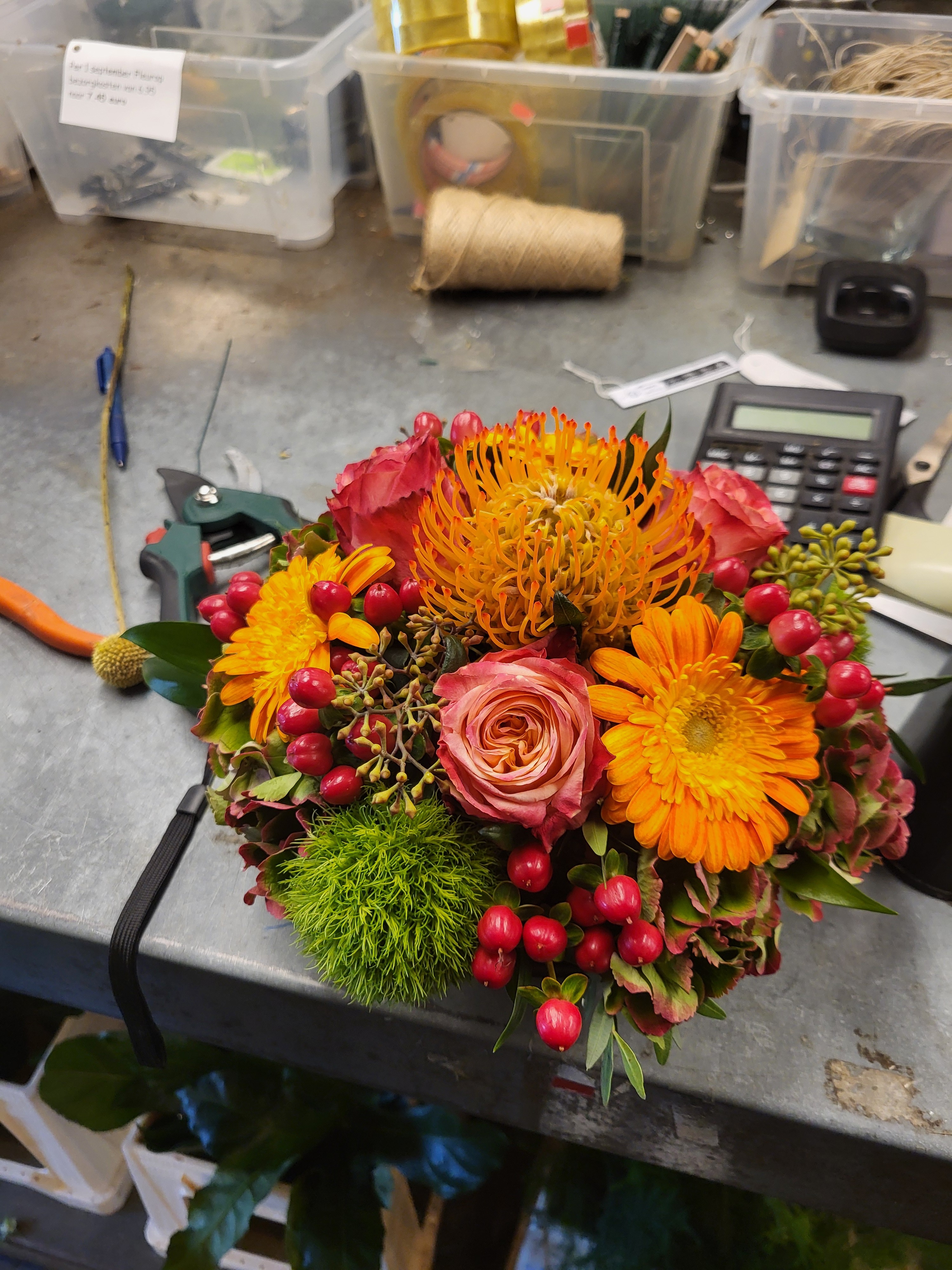Dit bloemstuk wordt natuurlijk met verse bloemen 'gestoken', maar staat vaak toch minimaal twee weken.