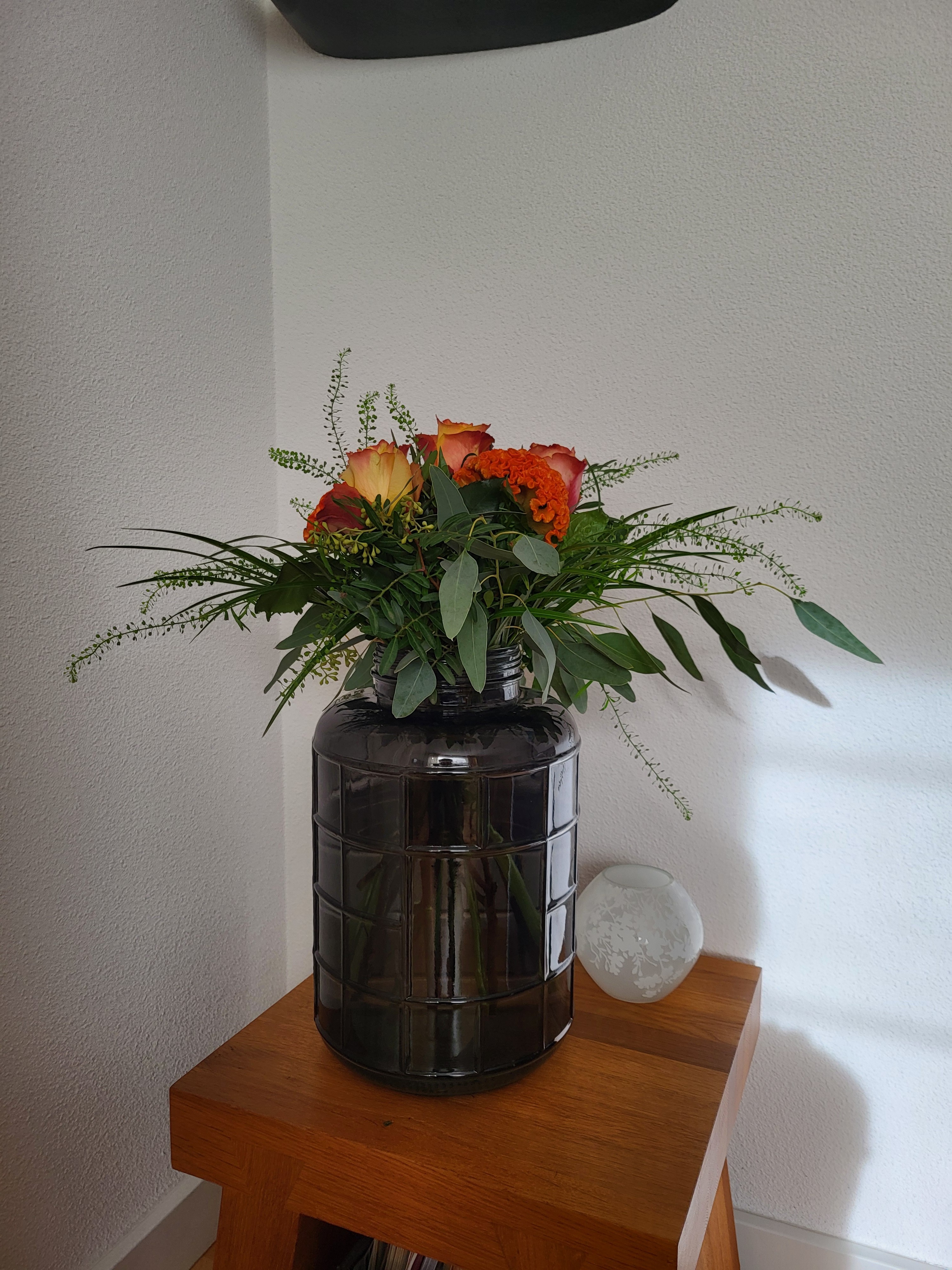 Ik heb dit boeket gemaakt met dezelfde, maar minder bloemen en met Eucalyptus, Pistache, Palmbladeren en Lepidium.