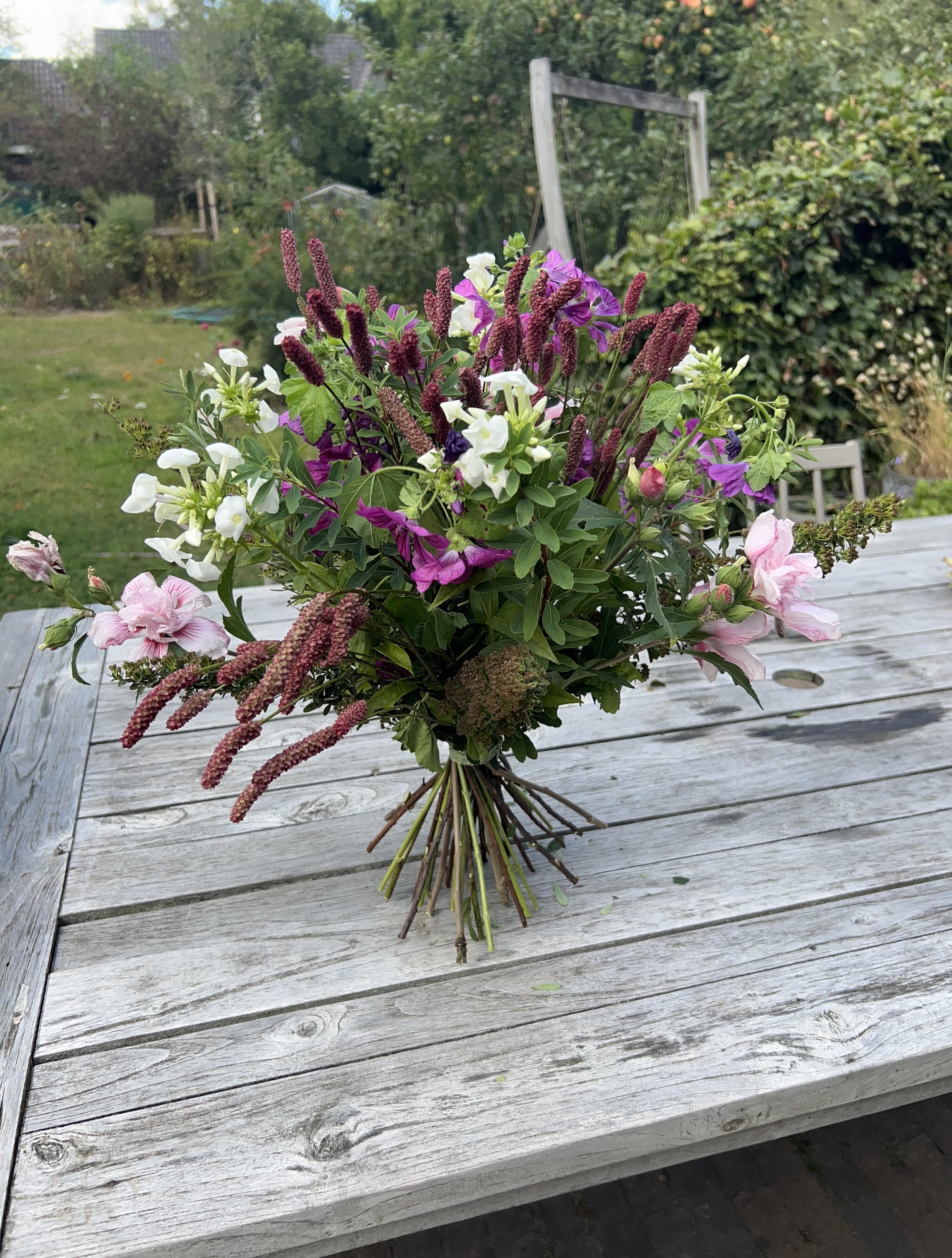 ik heb bloemen uit de tuin gecombineerd met bloemen van de markt. In beginsel stonden die tuinbloemen prima (op voedingswater) maar toen ik er mee ging werken gingen ze toch snel hangen.