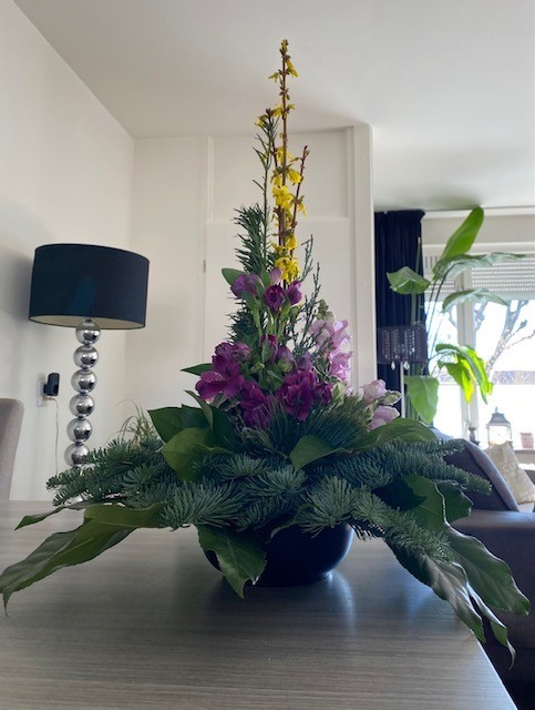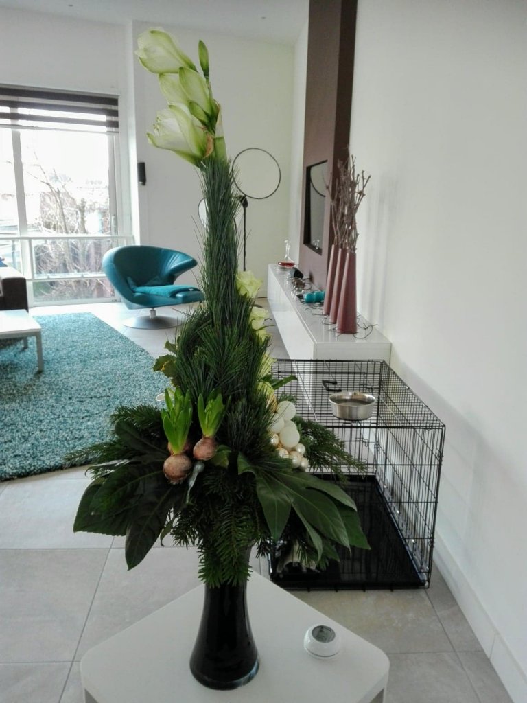 Ik vind hem prachtig Patricia! Daar mag je echt trots op zijn. Door de vaas en de hoogte is hij echt elegant geworden en past hij mooi bij je interieur. Vind je het goed als ik een foto gebruik om op Facebook te delen? Hier wil ik natuurlijk graag even mee pronken. Hele fijne dagen, geniet van je arrangement. Nicolle