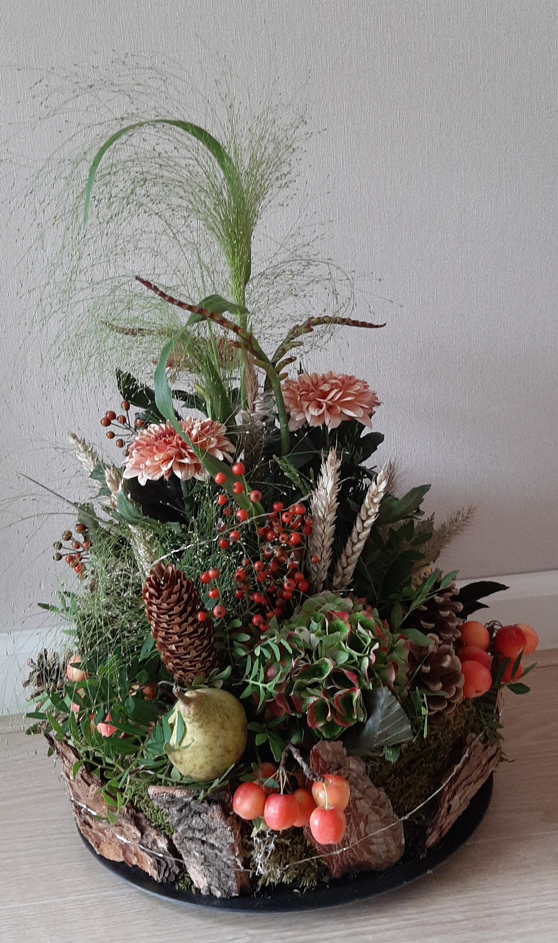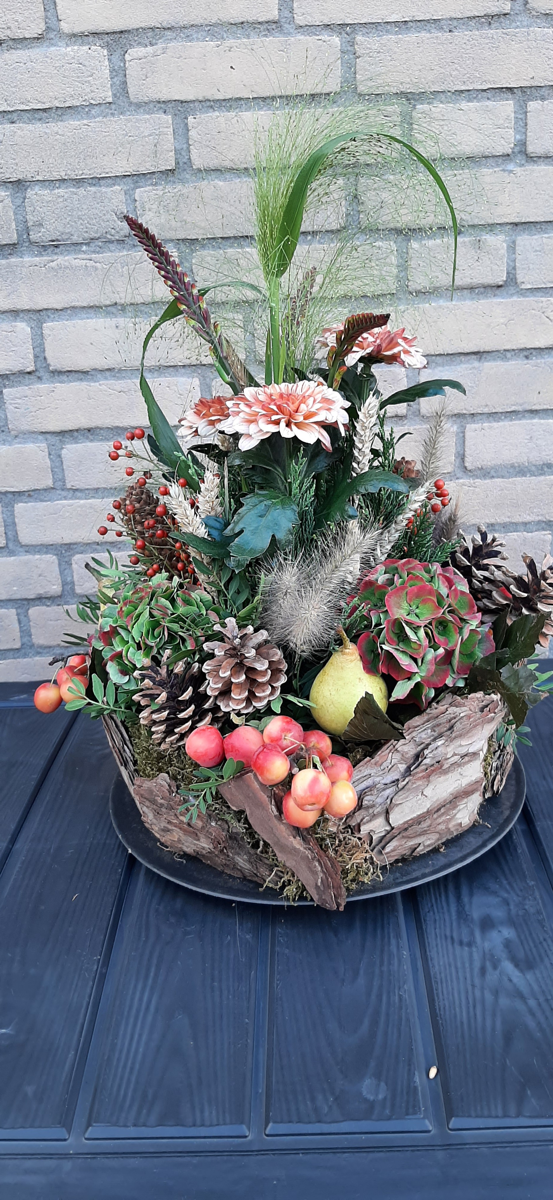 Ja, soms komt er iets heel anders uit je handen dan je oorspronkelijk had gedacht. Als je het niet had gezegd dan had ik gedacht dat je ondergrond een oasis taart was. Ik vind hem erg mooi! Maakt niet uit hoe we de stijl noemen. Als je wilt dat hij een holle lijn krijgt, hoef je er alleen maar wat langere slanken materialen in het midden erbij te steken. Dan klopt je verhouding hoogte\breedte en zal hij slanker lijken. Zo is hij ook mooi en kan je genieten van alle herfstmaterialen.