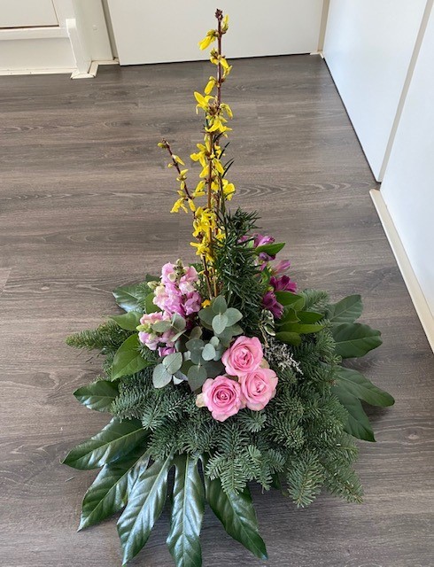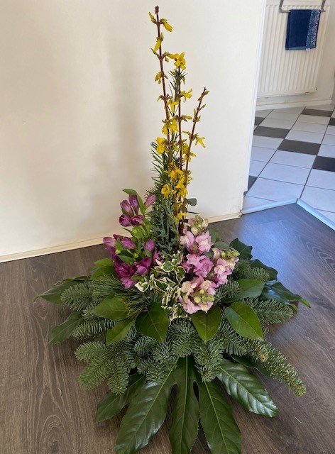 Lineair alzijdig kan je het hele jaar door maken. Leuk dat je jouw eigen draai er aan hebt gegeven. Je holle lijn en de afstand tussen je hoogtes is goed gelukt. Ik weet niet hoeveel ervaring je hebt en of je al vaker een lineaire vaas schikking hebt gemaakt, maar je horizontale lijn mag maximaal de helft van de hoogte zijn. Als ik het op de foto zo zie, is hij net zo hoog als dat hij breed is. Daardoor vind ik dat het groen erg veel aandacht vraagt en je bloemen een beetje wegvallen. Ook als je wat bloemen horizontaal had gestoken was het meer één geheel geworden. Neemt niet weg dat het een mooi stuk is geworden en ik hoop dat je iets aan mijn tips hebt.