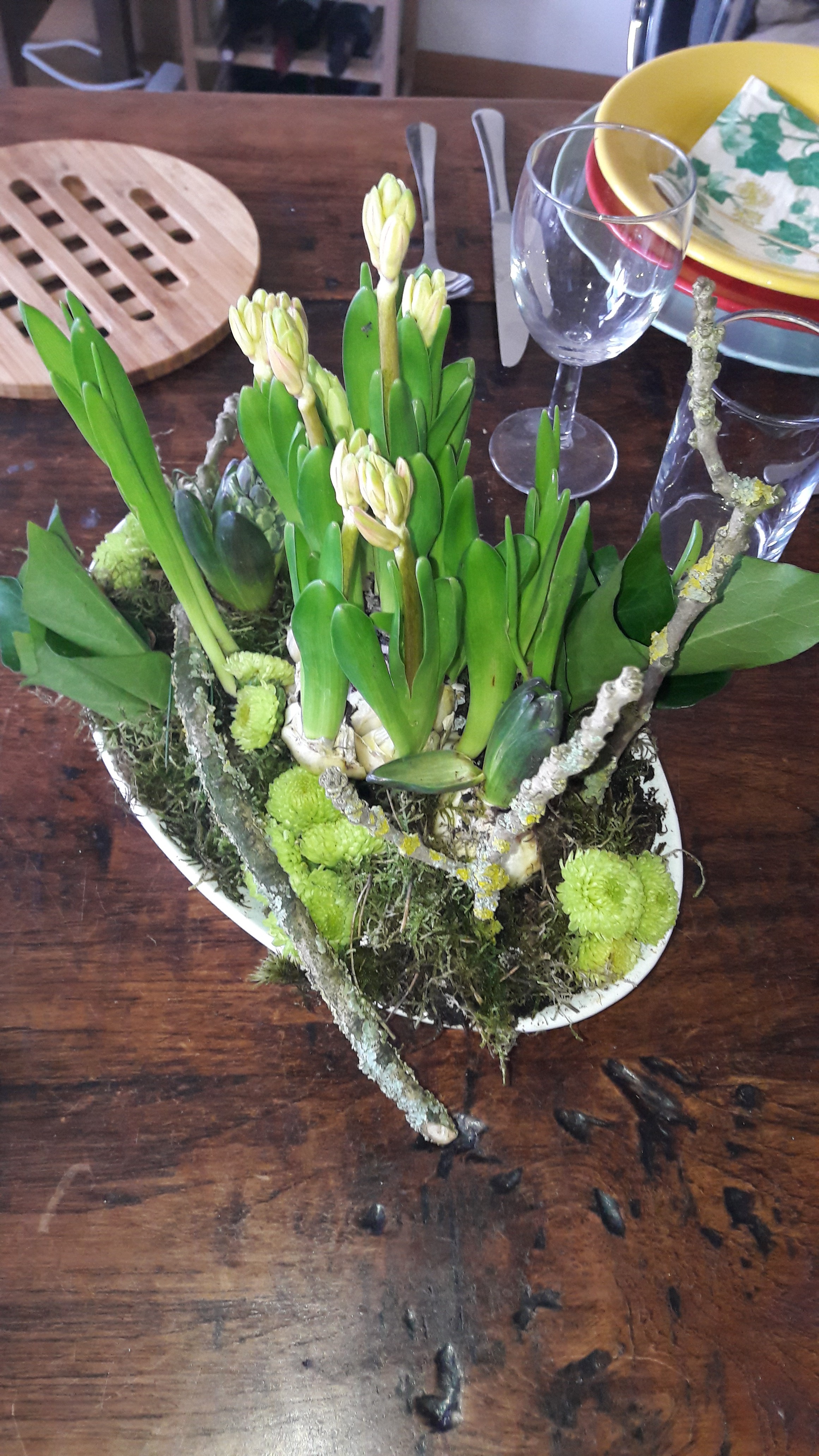 Leuk dat je er meteen mee aan de gang bent gegaan. Je hebt er vast iemand erg blij mee gemaakt. Bij ons kwamen de Hyacinten per kleur na elkaar uit. Zo hebben we er heel lang plezier van. Na de storm van vandaag kan je vast weer mooie takken vinden voor je volgende schaal. Alvast fijn weekend en bedankt voor het delen van je arrangement.