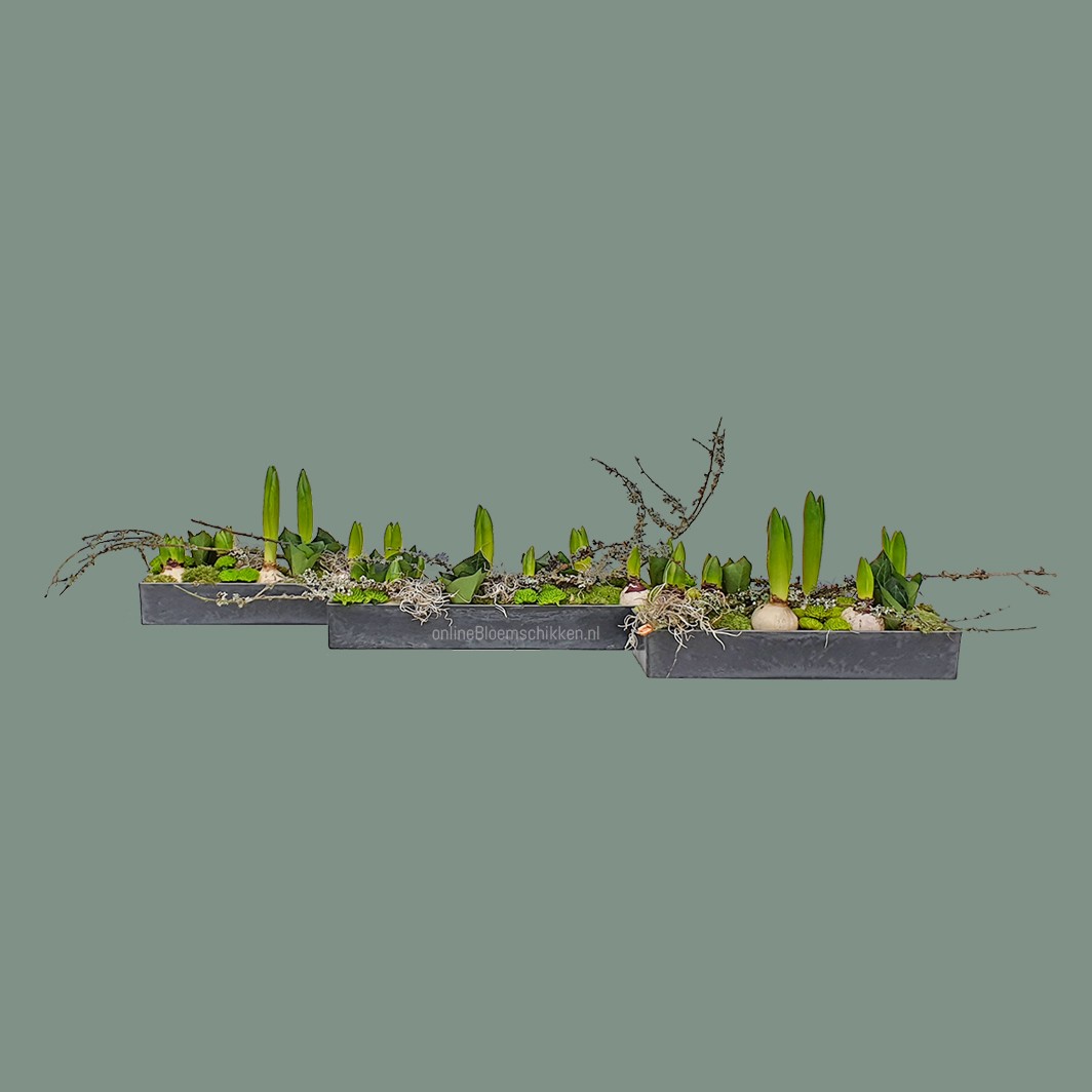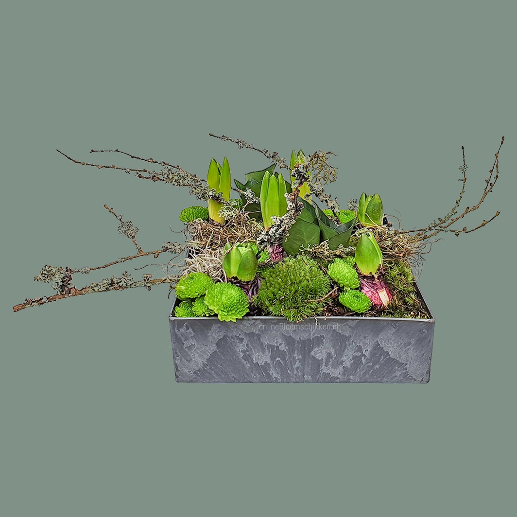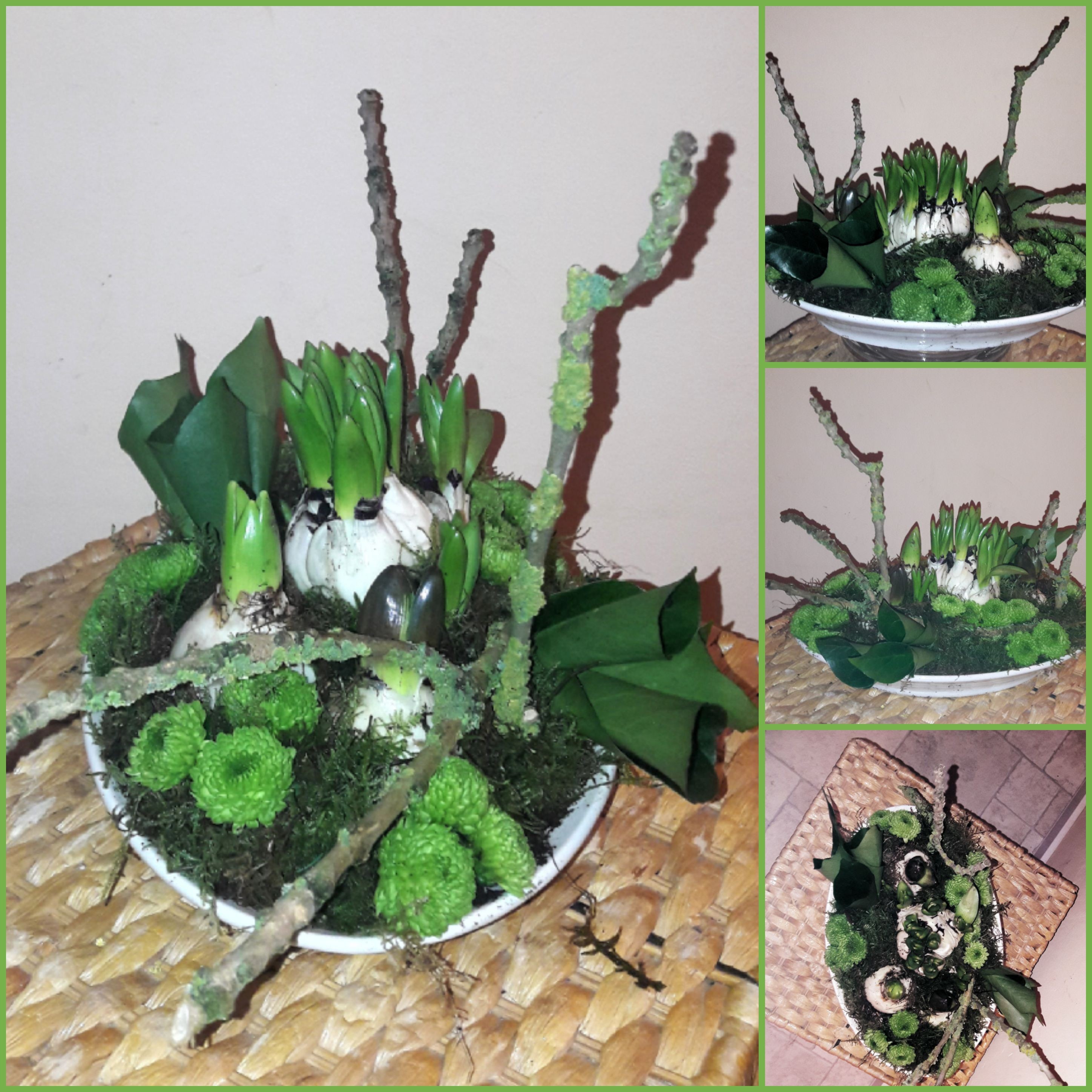 Natuurlijk kan je deze schikking leuk neerzetten met de Paasdagen. Maak hem dan wel ruim twee weken vantevoren, zodat de Hyacinten al een beetje open zijn.