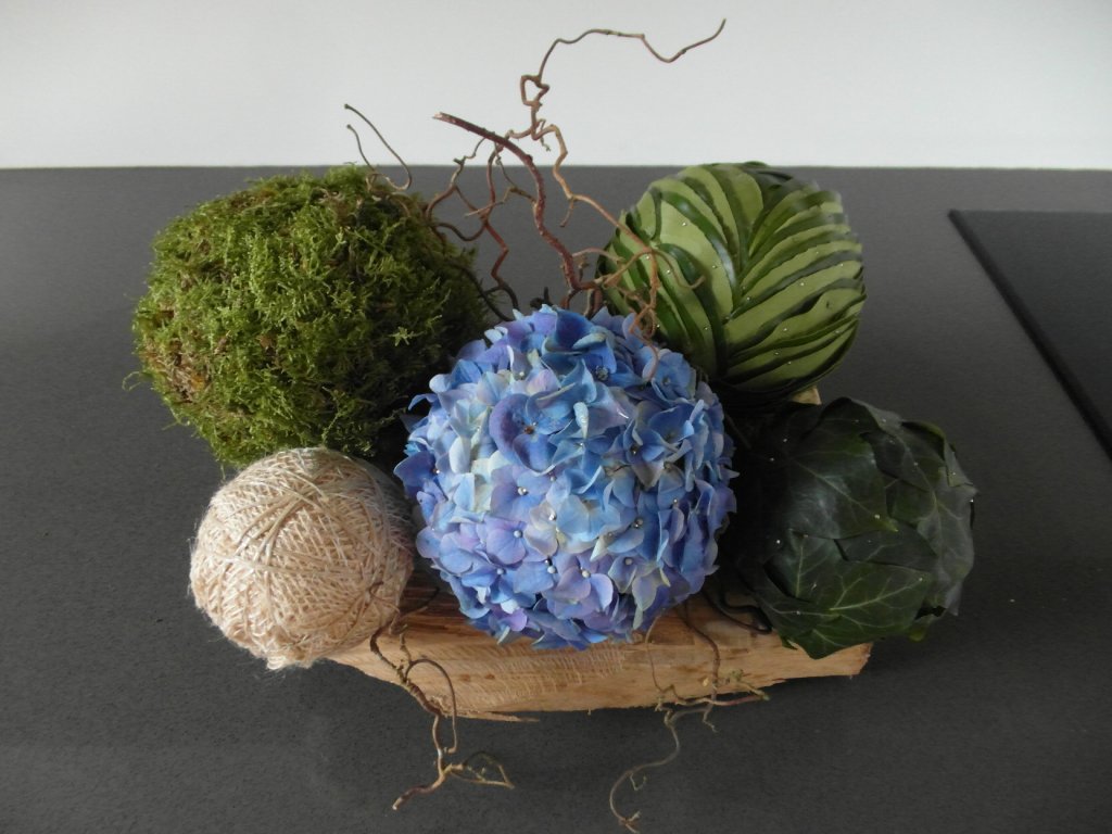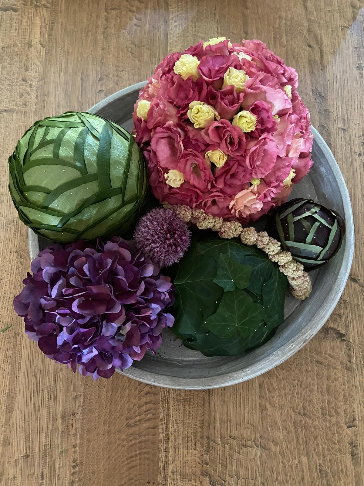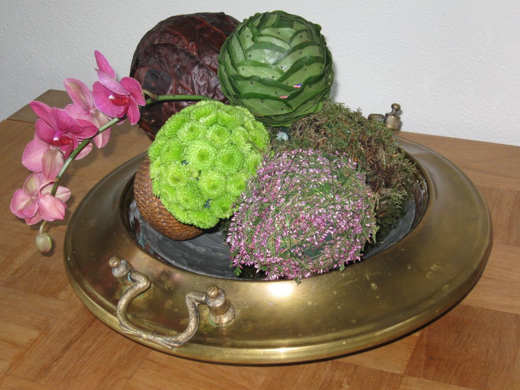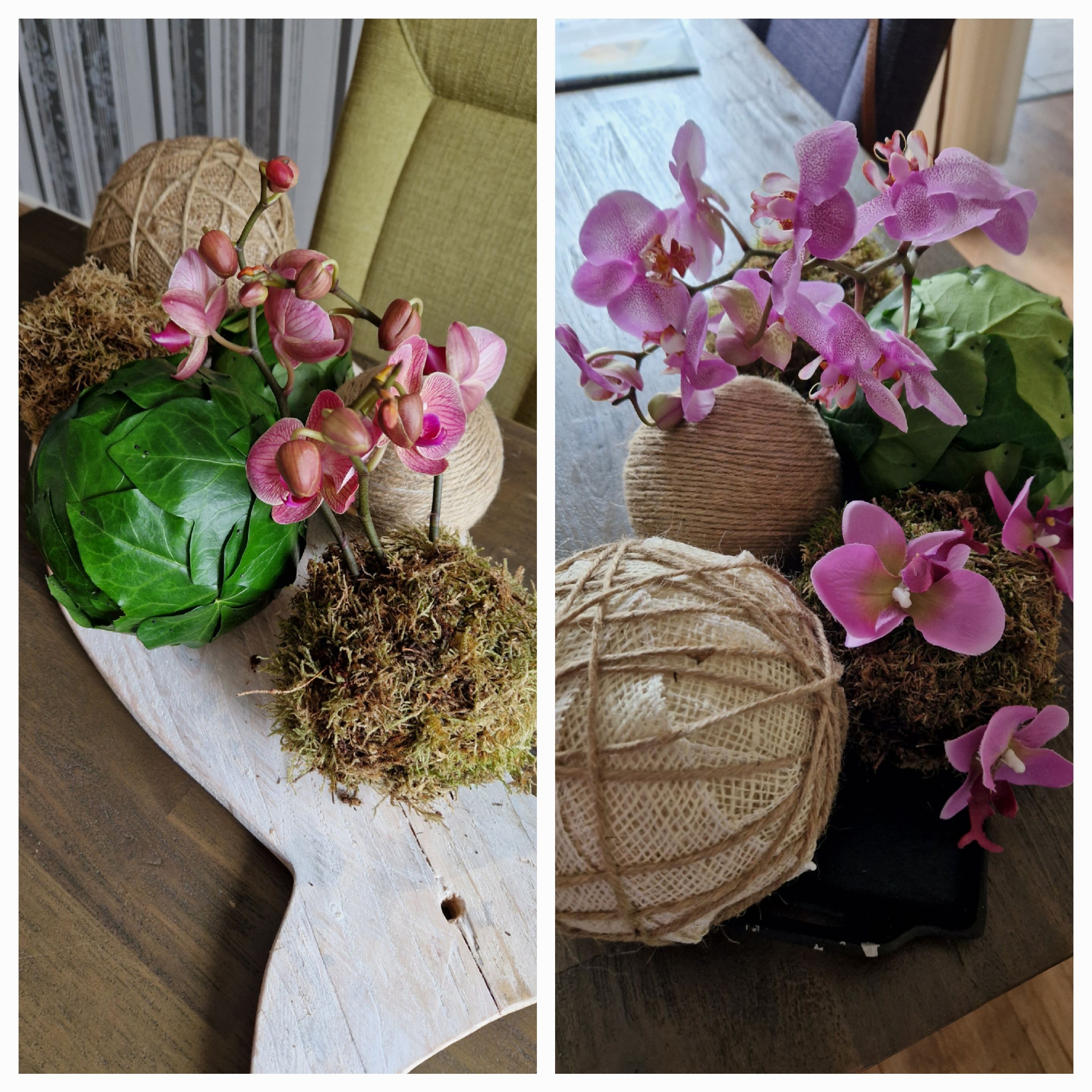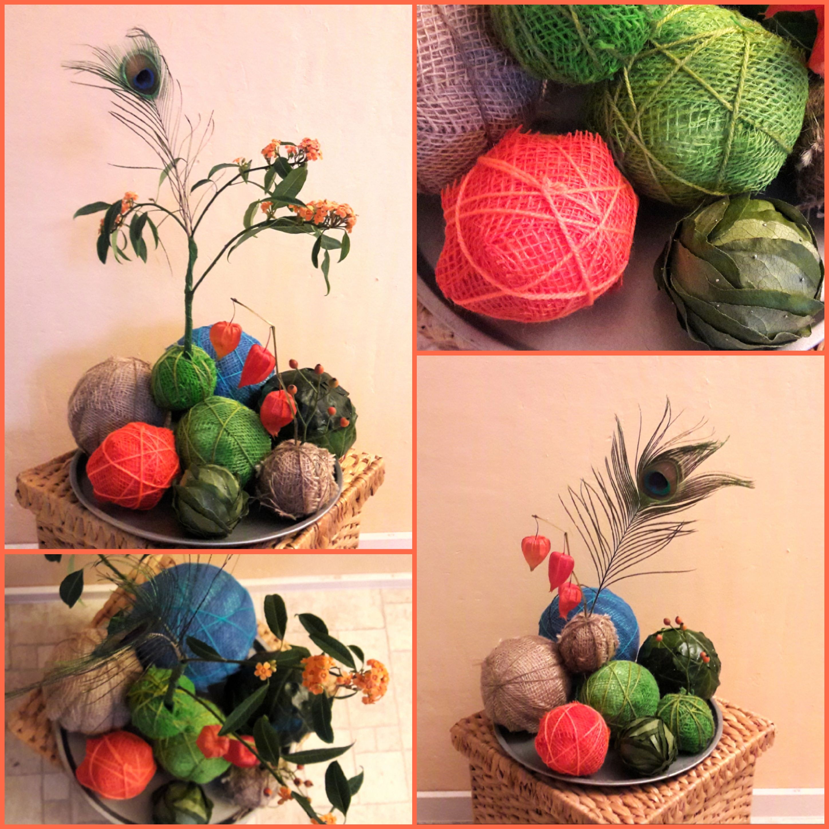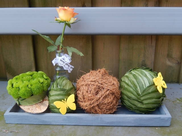 Het is een heel leuk en modern arrangement. Toevallig was ik zelf ook met het bekleden van ballen bezig. Een heb ik bekleed met heide en een met peulen van de Gleditsia, wel lastig om te doen maar het is wel leuk geworden en in een ander arrangement een kleine droogschuim bal met kleine appeltjes. groeten Peta