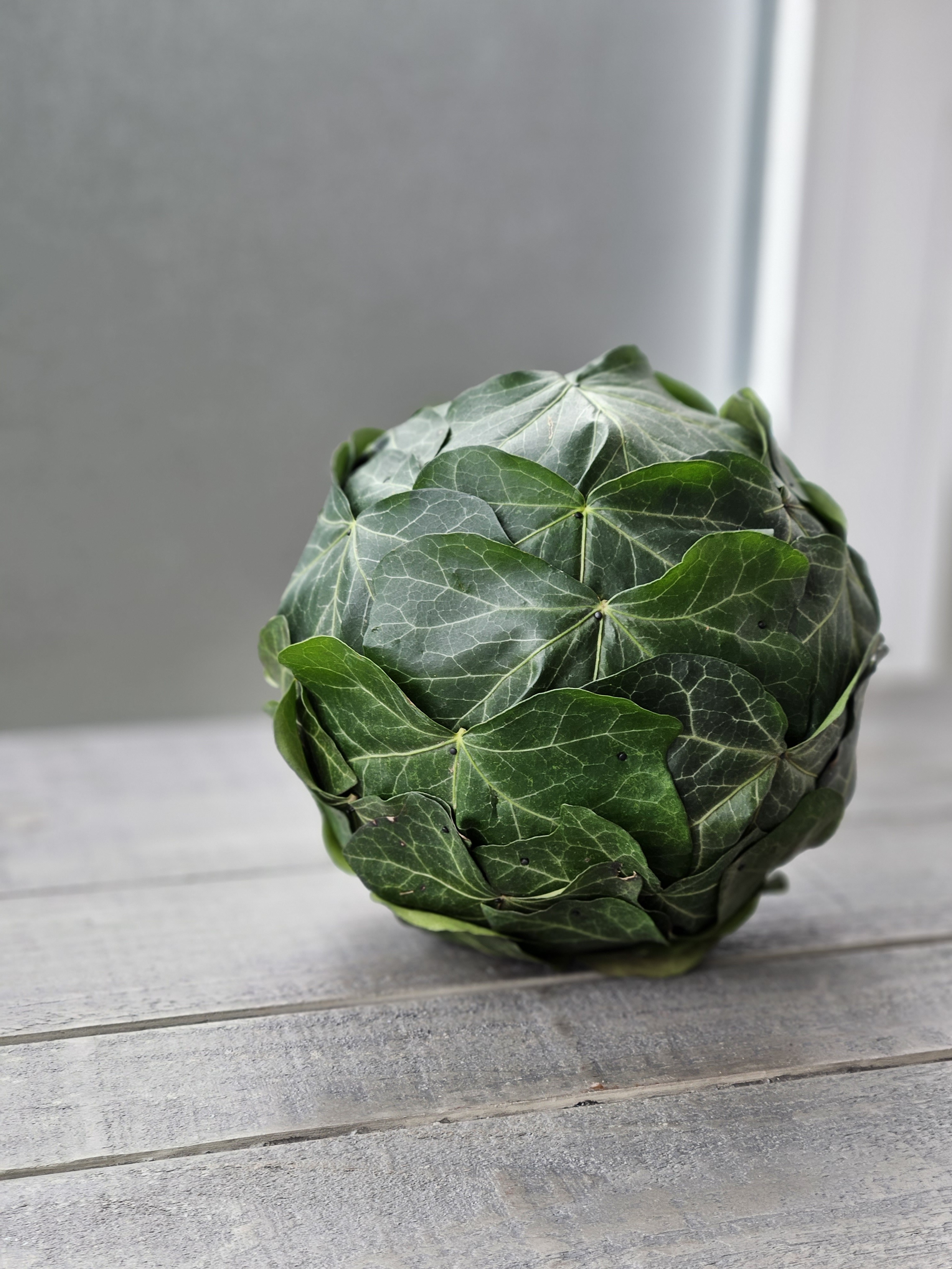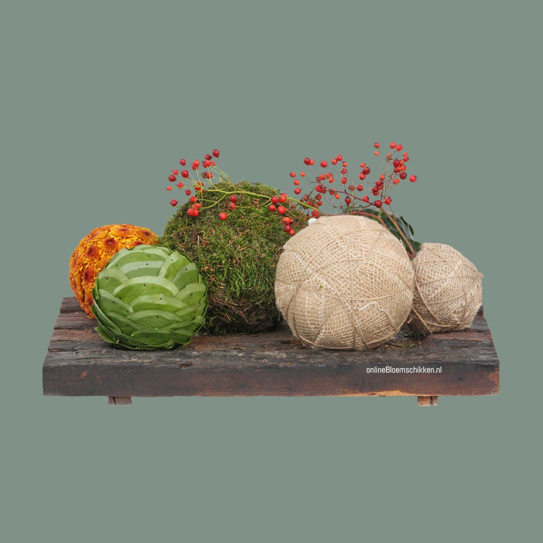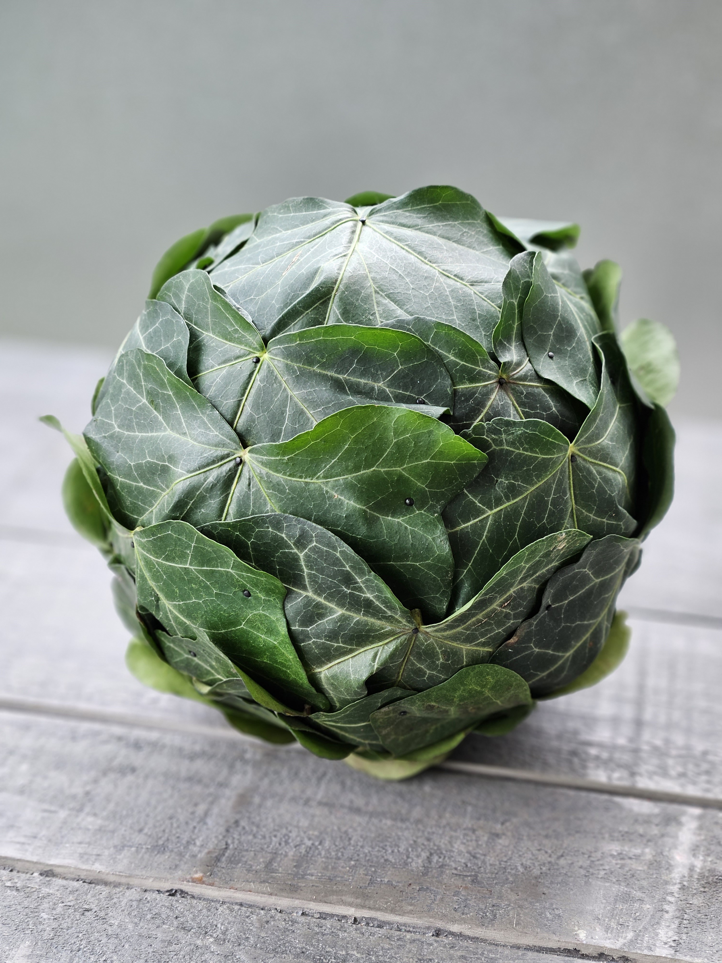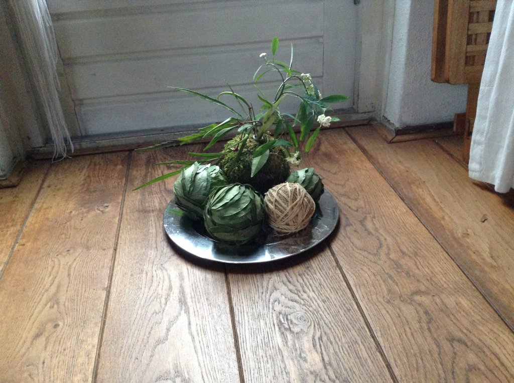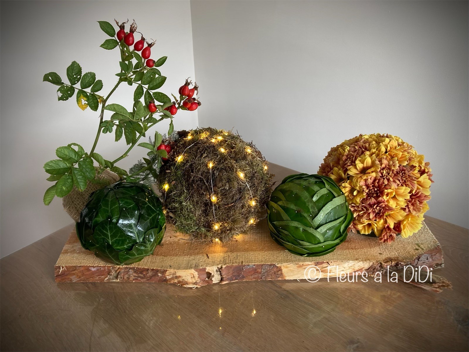 Het is een heel leuk en modern arrangement. Toevallig was ik zelf ook met het bekleden van ballen bezig. Een heb ik bekleed met heide en een met peulen van de Gleditsia, wel lastig om te doen maar het is wel leuk geworden en in een ander arrangement een kleine droogschuim bal met kleine appeltjes. groeten Peta