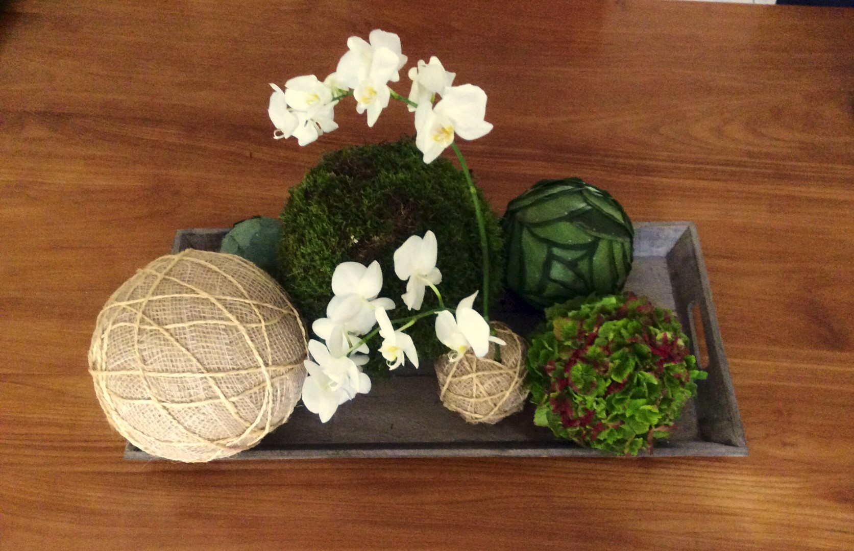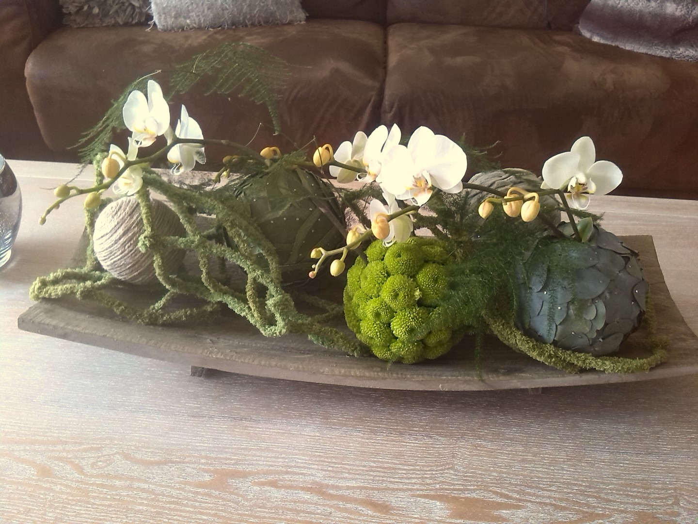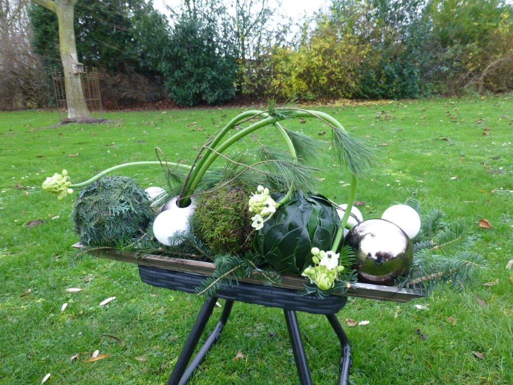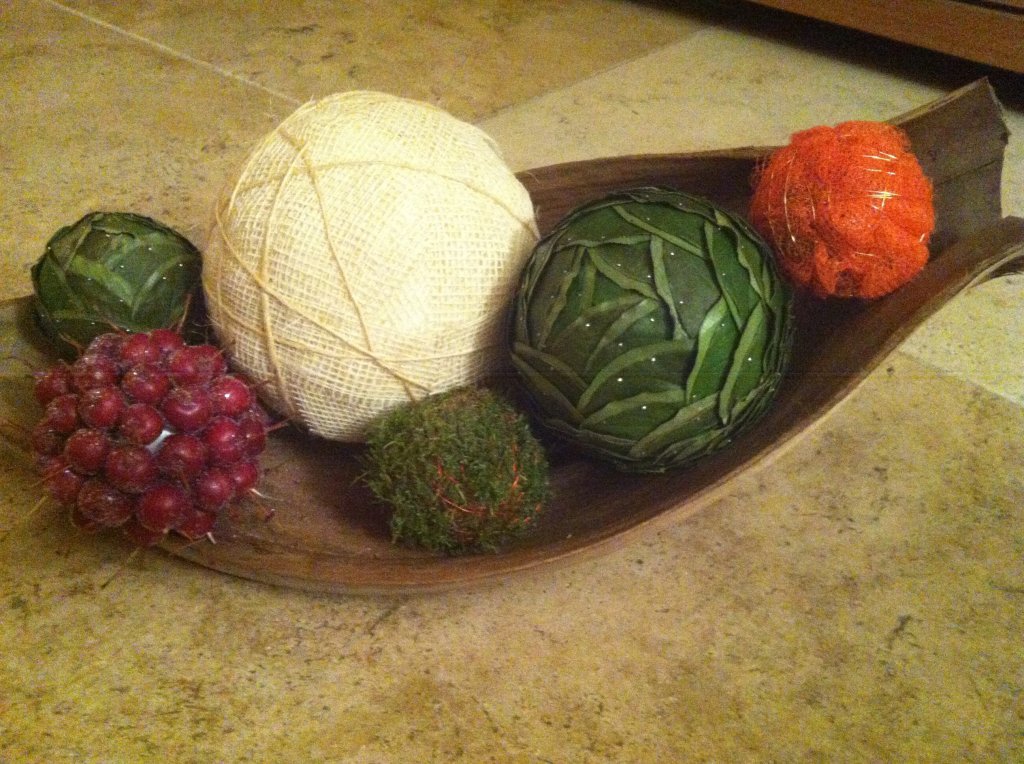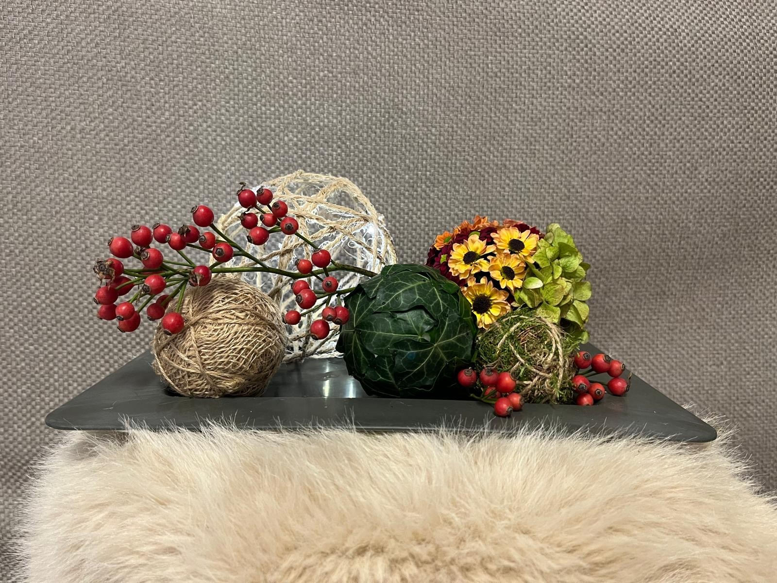 Het is een heel leuk en modern arrangement. Toevallig was ik zelf ook met het bekleden van ballen bezig. Een heb ik bekleed met heide en een met peulen van de Gleditsia, wel lastig om te doen maar het is wel leuk geworden en in een ander arrangement een kleine droogschuim bal met kleine appeltjes. groeten Peta