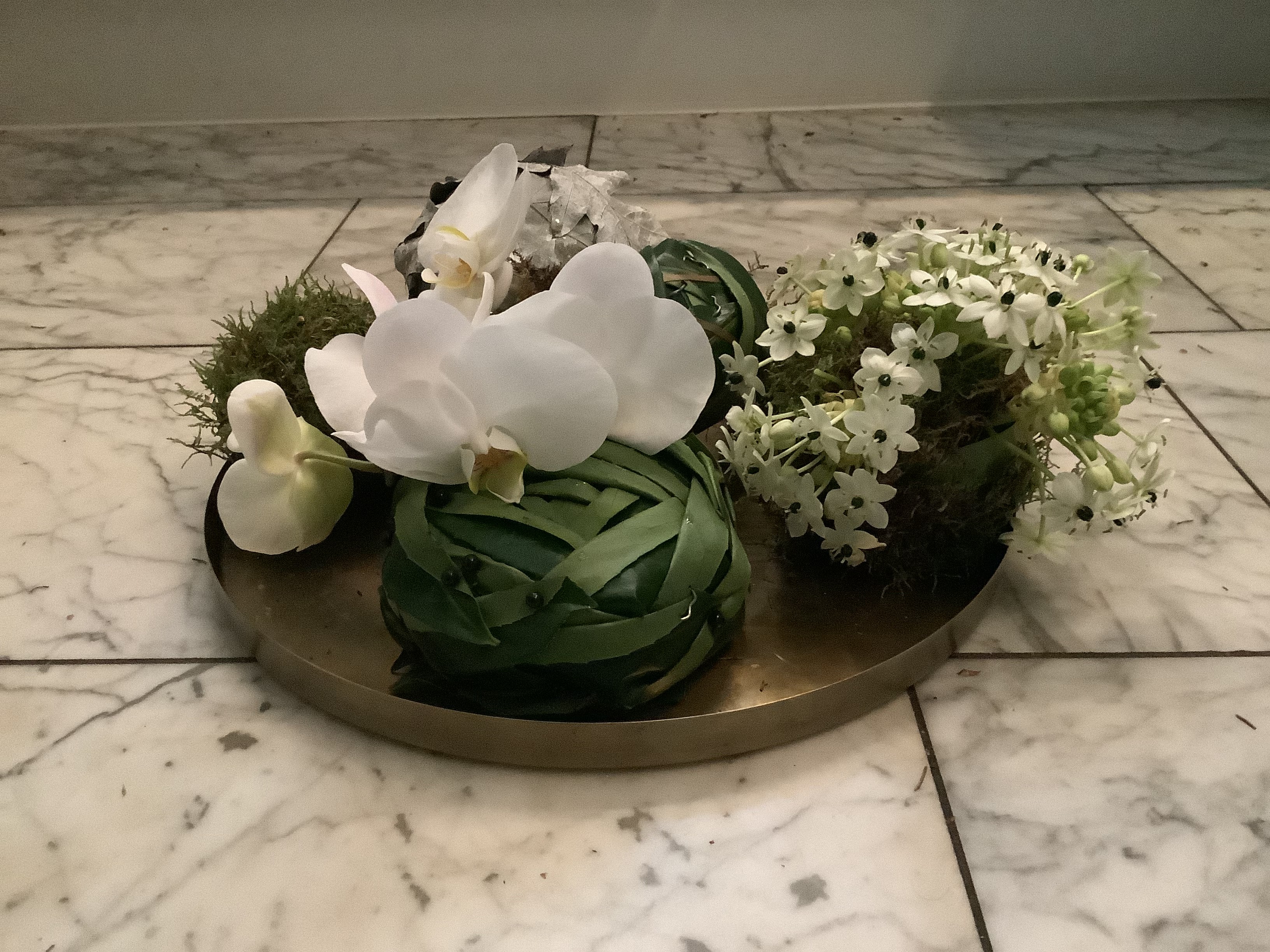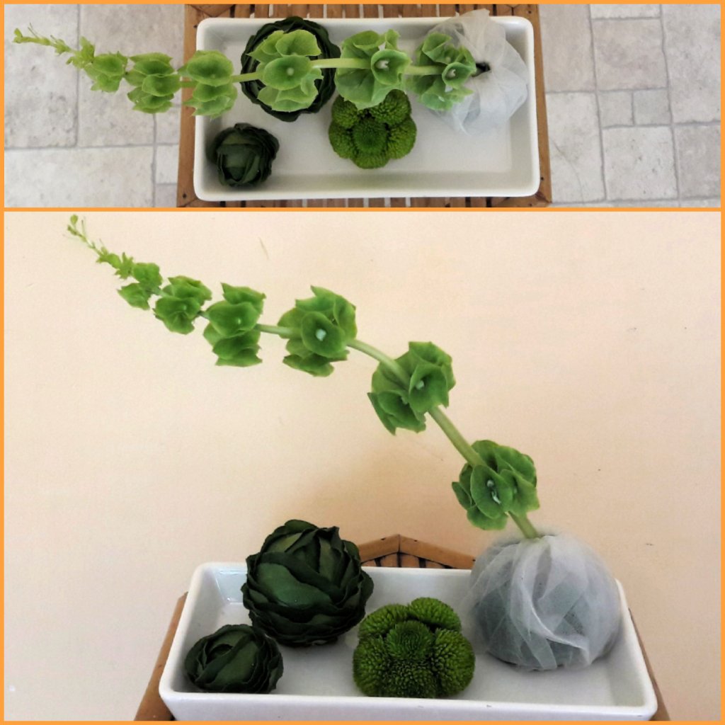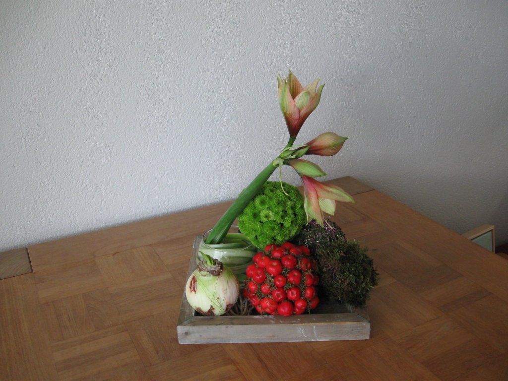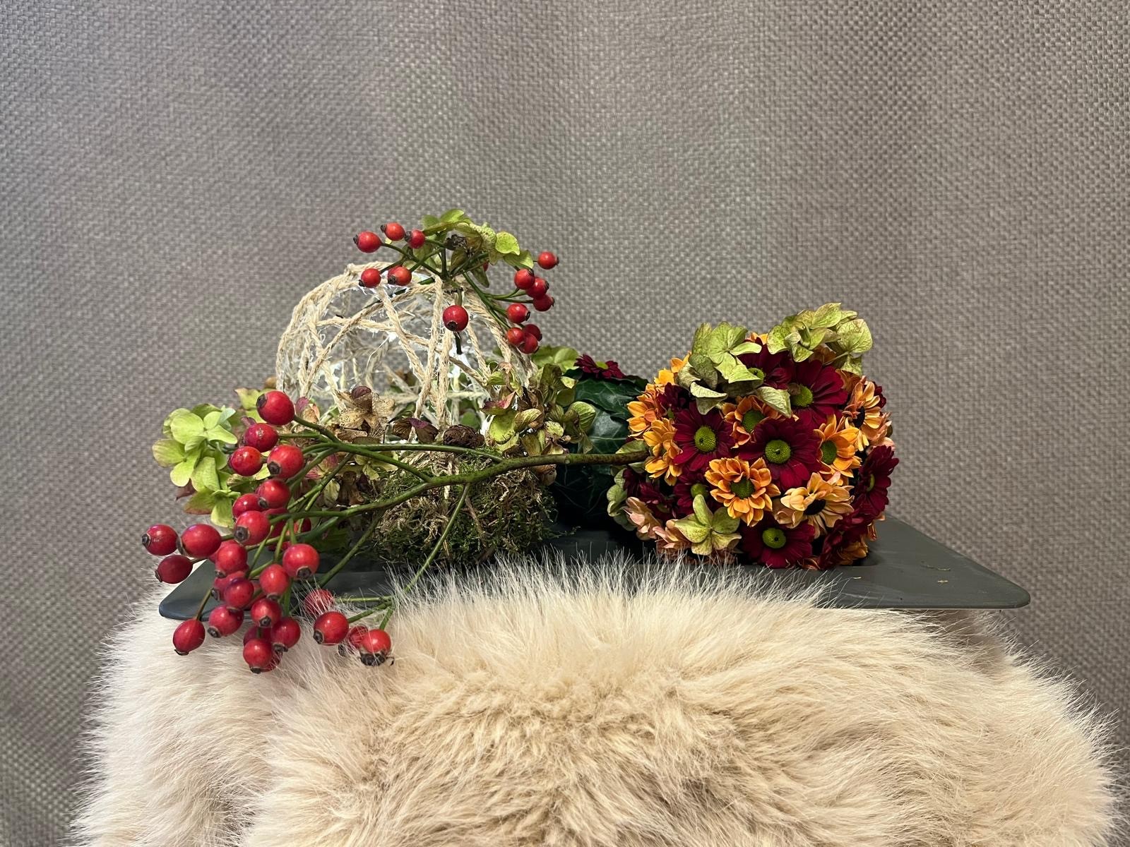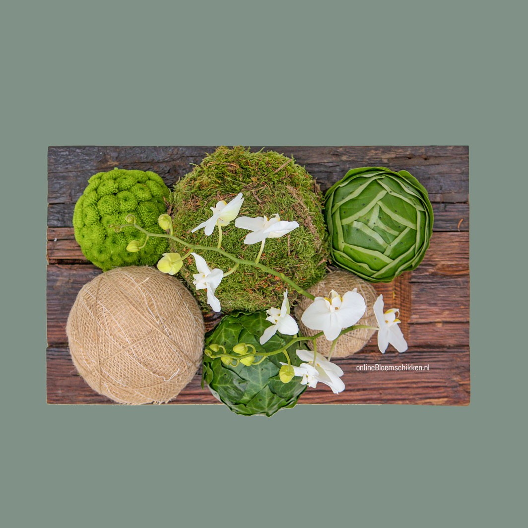 Het is een heel leuk en modern arrangement. Toevallig was ik zelf ook met het bekleden van ballen bezig. Een heb ik bekleed met heide en een met peulen van de Gleditsia, wel lastig om te doen maar het is wel leuk geworden en in een ander arrangement een kleine droogschuim bal met kleine appeltjes. groeten Peta
