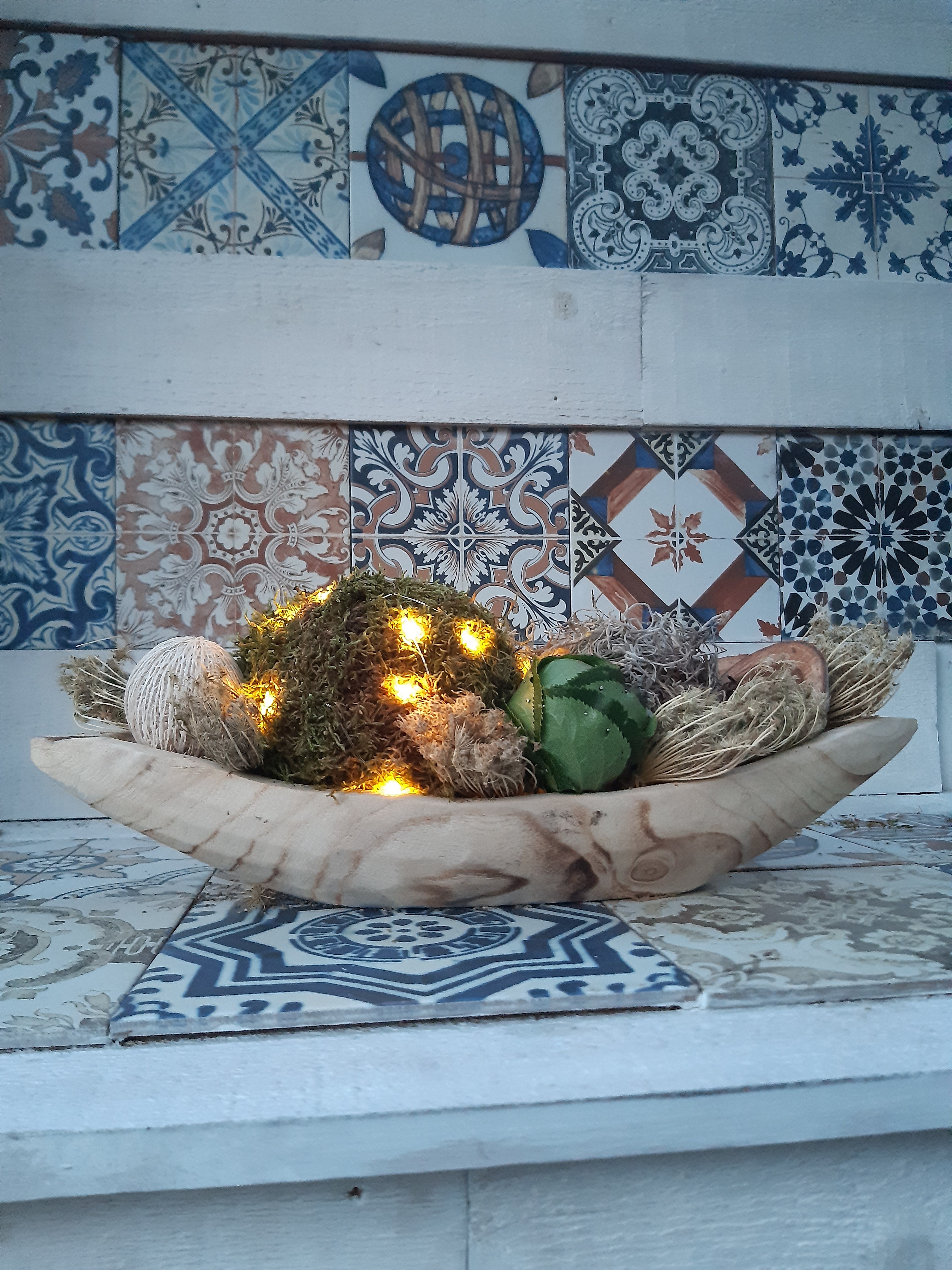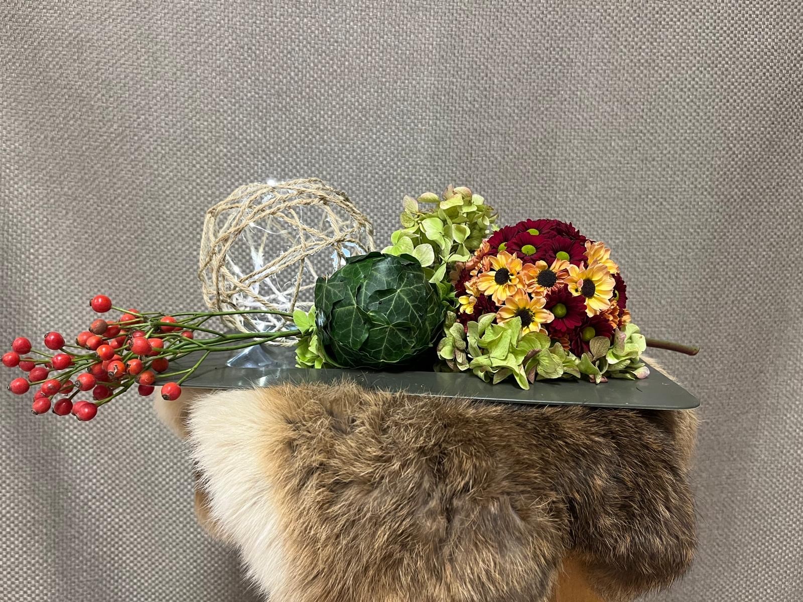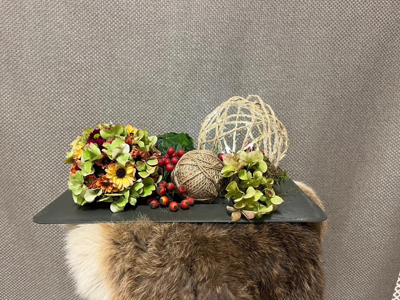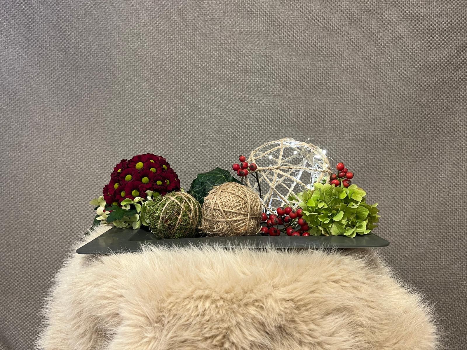 Mijn tip voor jou is om dit arrangement nu nog een keer te maken. Deze is al leuk geworden en nu heb je zulk mooi grijsblad en andere materialen wat leuk droogt.Ook op een ronde schaal erg leuk.