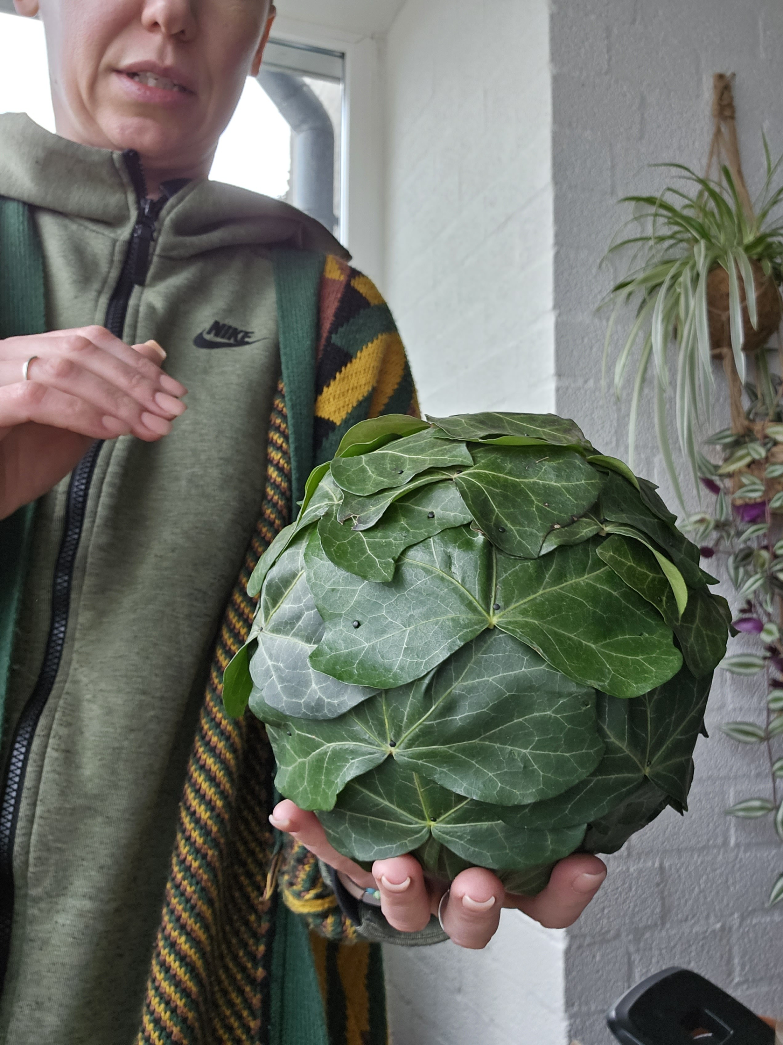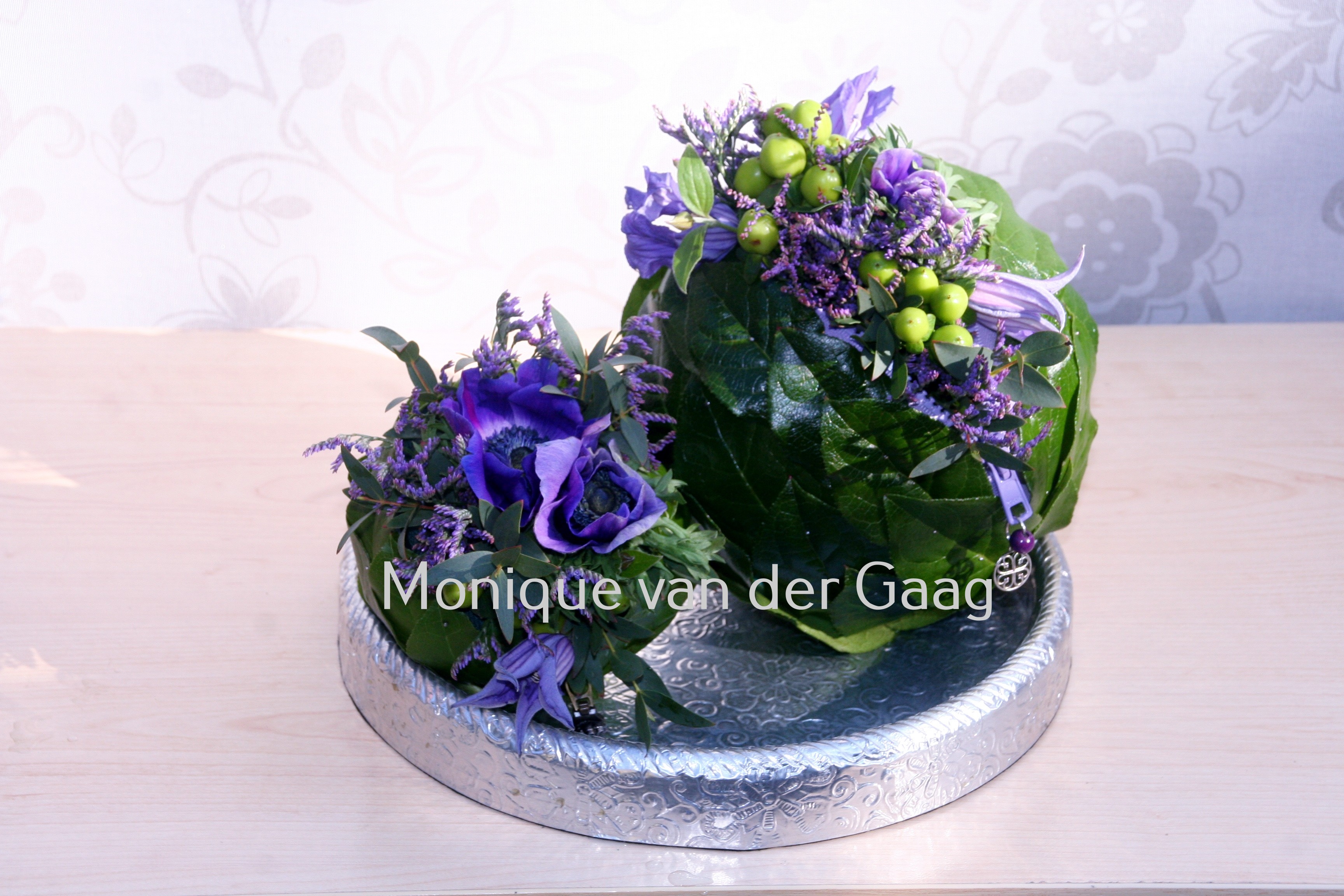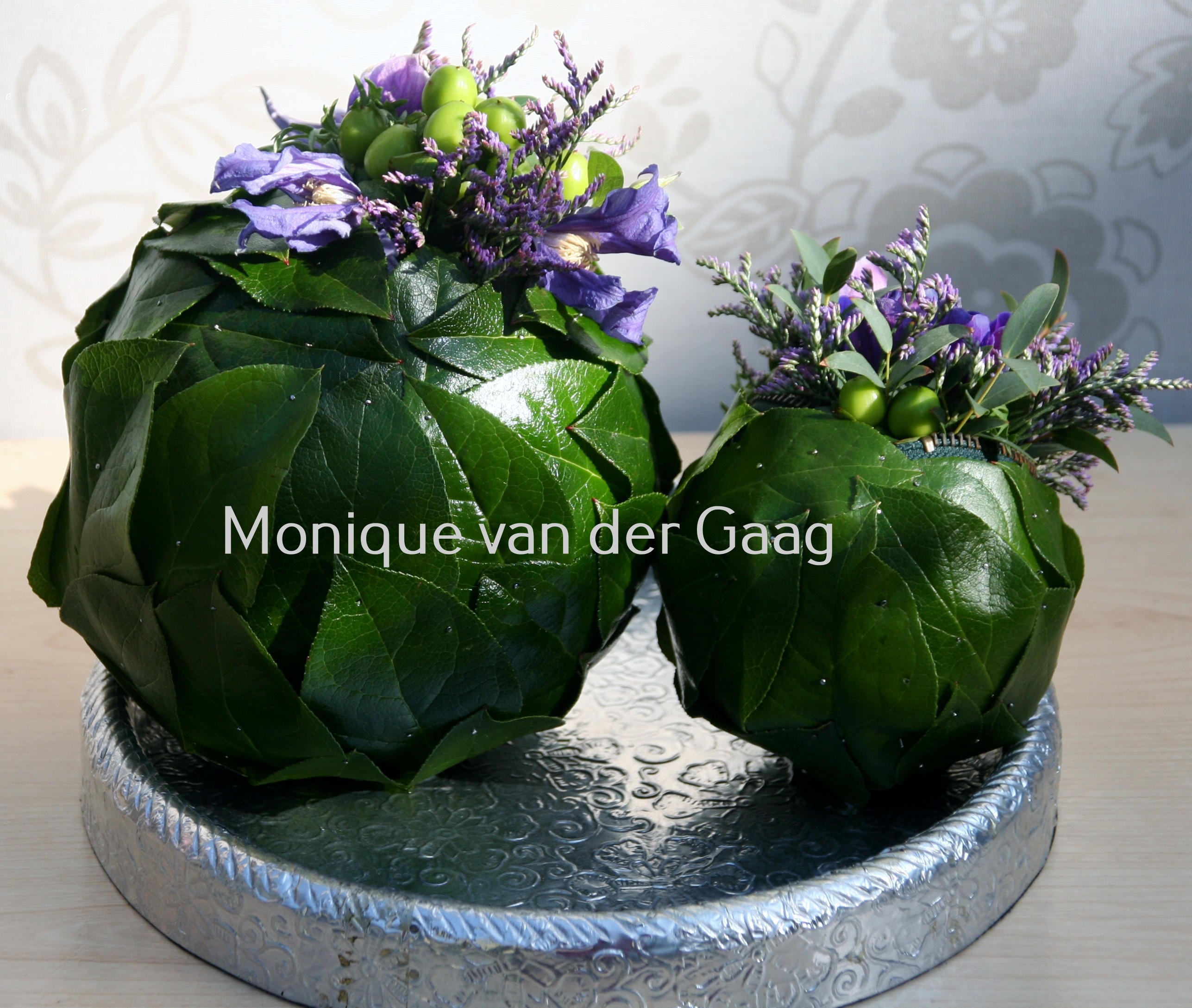 Hoi Nicolle, Het was erg leuk om de kleuren van het juteband te kiezen en dit arrangement te maken. Ook weer als litugische schikking voor mijn kerk, passend bij het thema 'Homo Ludens', Latijn voor 'De spelende mens'. Een orchideeëntak was boven het budget en in mijn eerste versie had ik nog een hangende tak met oranje bloemen. Maar die bleek topzwaar en mijn zelfgemaakte budgetvriendelijke steekschuimbal te klein: geen gelukkig combinatie. Dus in versie 2 alleen een pauwenveer gebruikt. Het oog lijkt wat op ons logo van de kerk. Ook dezelfde kleur, dus dat vond ik wel toepasselijk. Verder gaan er nog best wat meters juteband om zo'n grappige bal van 15 cm doorsnede! Ik had de bal vooraf met lichtblauwe verf bespoten, scheelt weer met wikkelen. Het lichtblauw schemert mooi door het juteband. Hedera ging op de piepschuim bal van 12 cm: vers geplukt uit eigen tuin. Het Appelblad was wel wat duurder, dus een kleinere bal genomen, want het effect is zo fraai. Hele arrangement kost aan materialen rond de 15 euro. Ik vind het super mooi. Heb je nog tips voor de bloemen die ik had kunnen gebruiken (als geld geen rol speelt) en een meer budgetvriendelijke bloemen-oplossing? Dankjewel alvast! Grtjs Vlijtig liesje