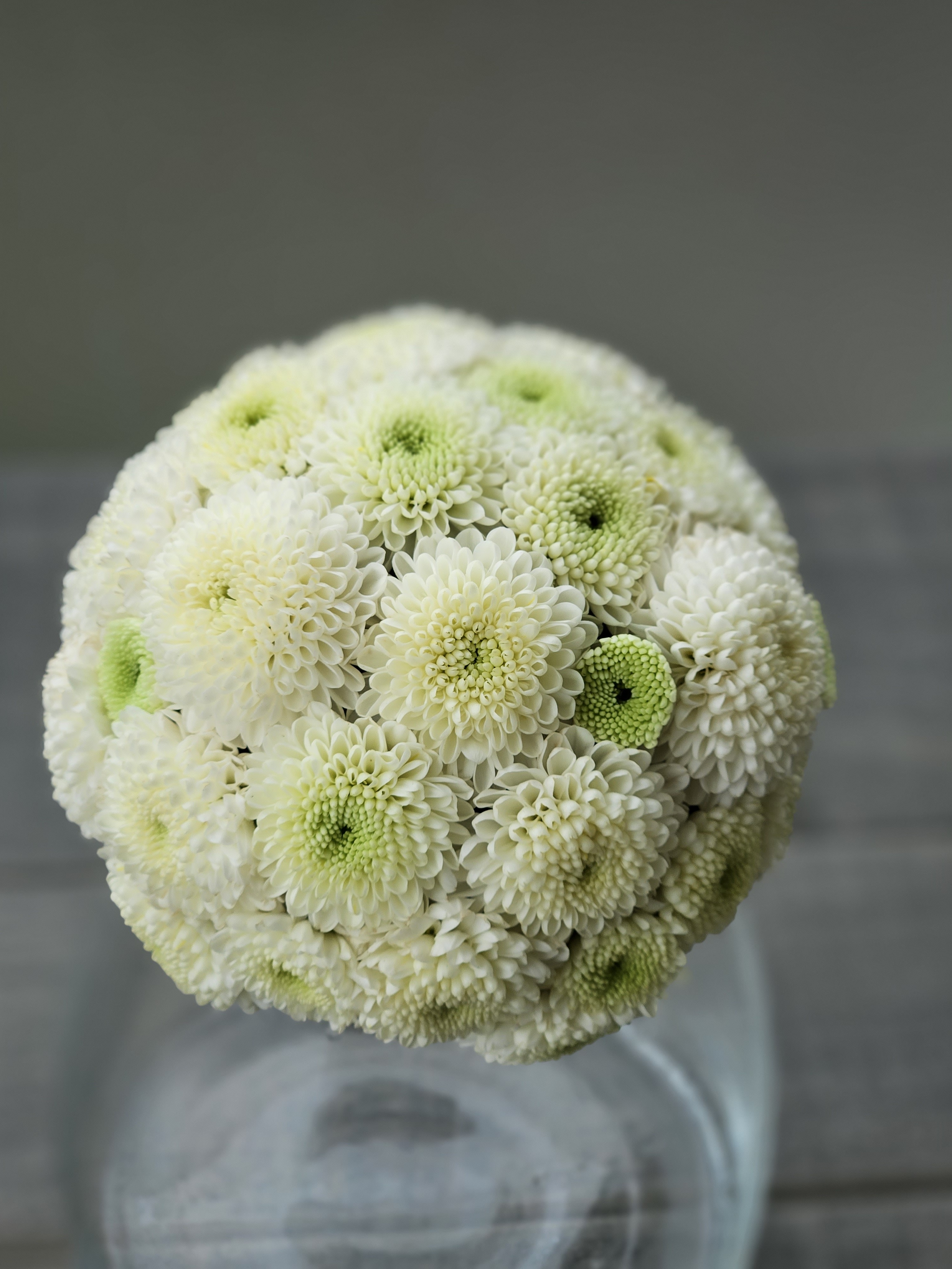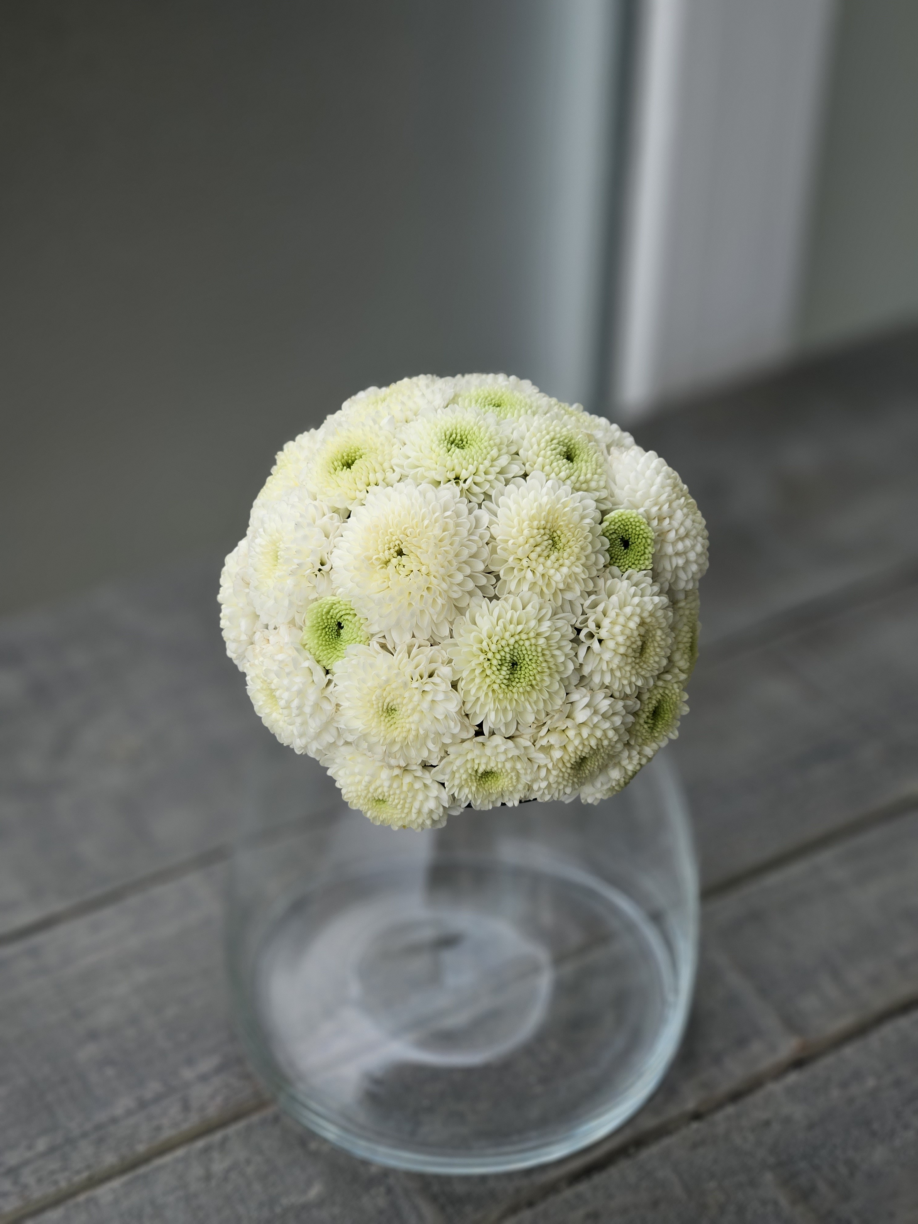 Als je de Oasis bal volprikt met kleine Chrysanthemum of trosroosjes krijg je weer een hele andere compositie.