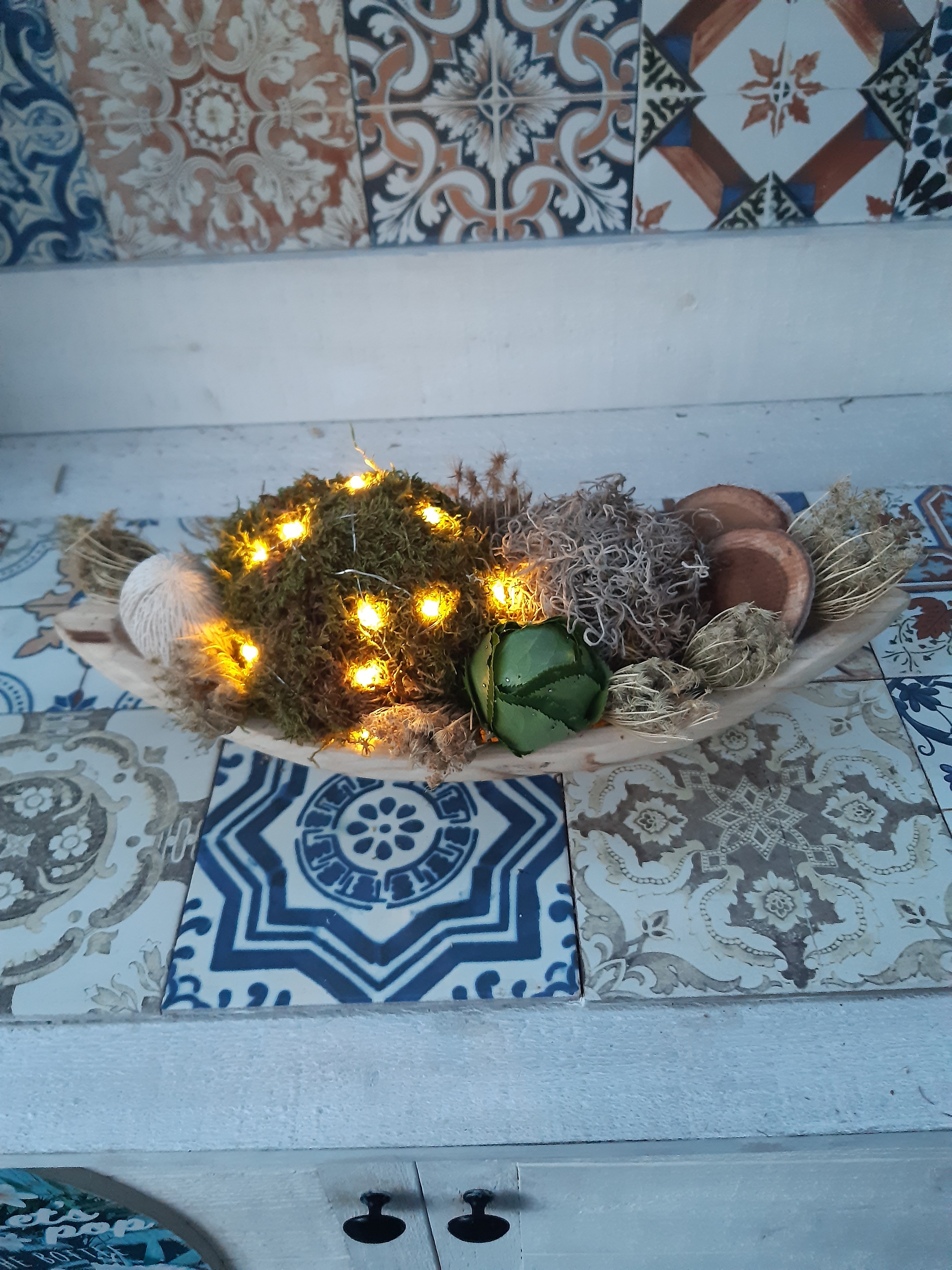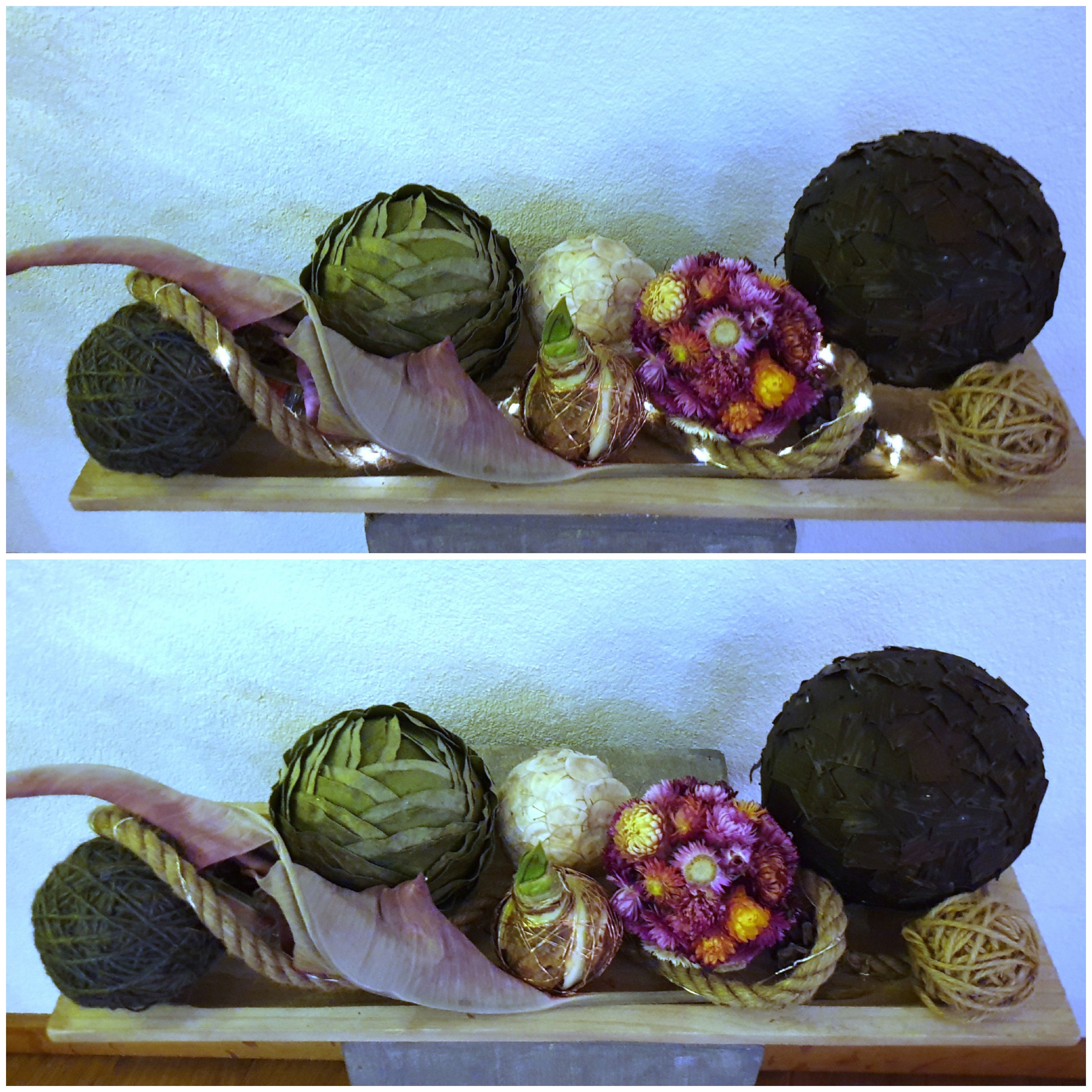 Hoi Nicolle, Hierbij mijn variatie met de ballen. Ik heb 1 bol beprikt met cordyline en 1 met appelblad. Verder 1 bol gelijmd met strobloemen en 1 met judaspenning. Verder heb ik nog 2 bollen omwikkelt met touw. Ter decoratie heb ik een amaryllisbol, een gedroogd straelitziablad en een touw met lichtjes erbij gelegd. Groetjes, Ine