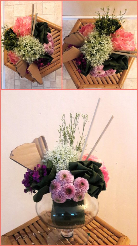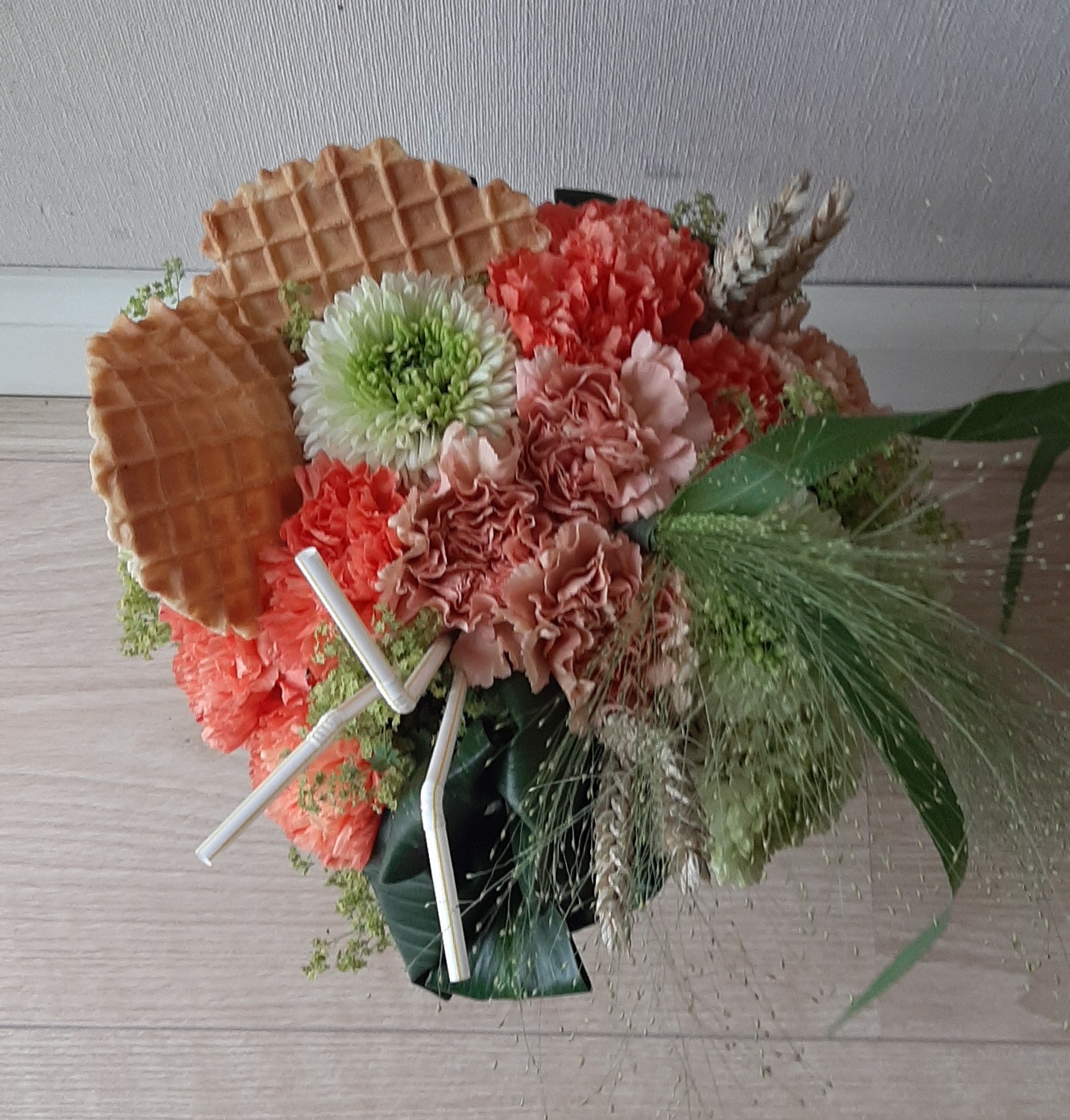 Het was weer een beetje improviseren met de bloemen: creatief hergebruik & budgetvriendelijk omgaan met mijn materaal. Zo smaken de ijswafeltjes naar karton.... Erg leuk om de Biedermeier weer eens te maken!