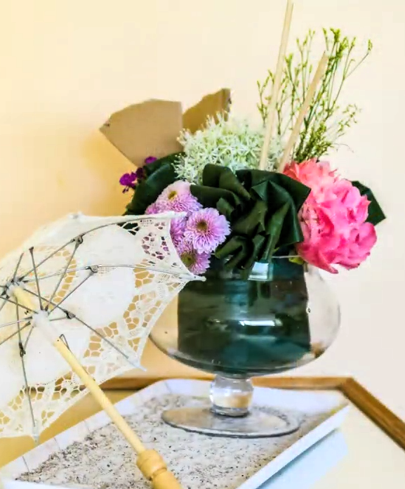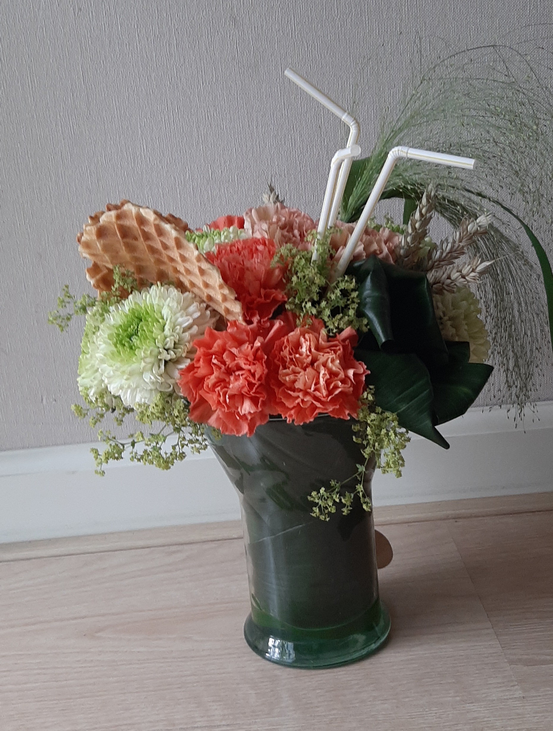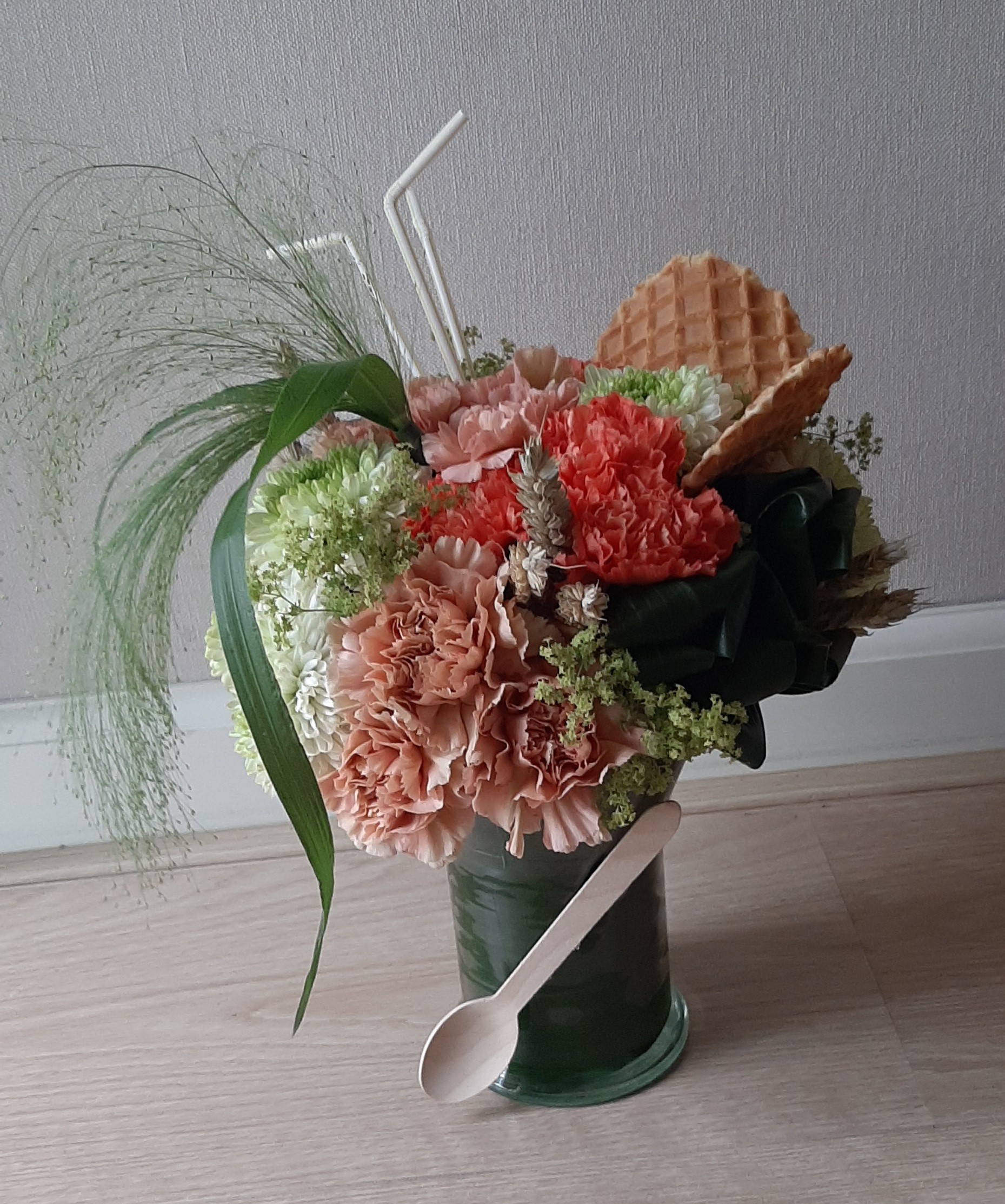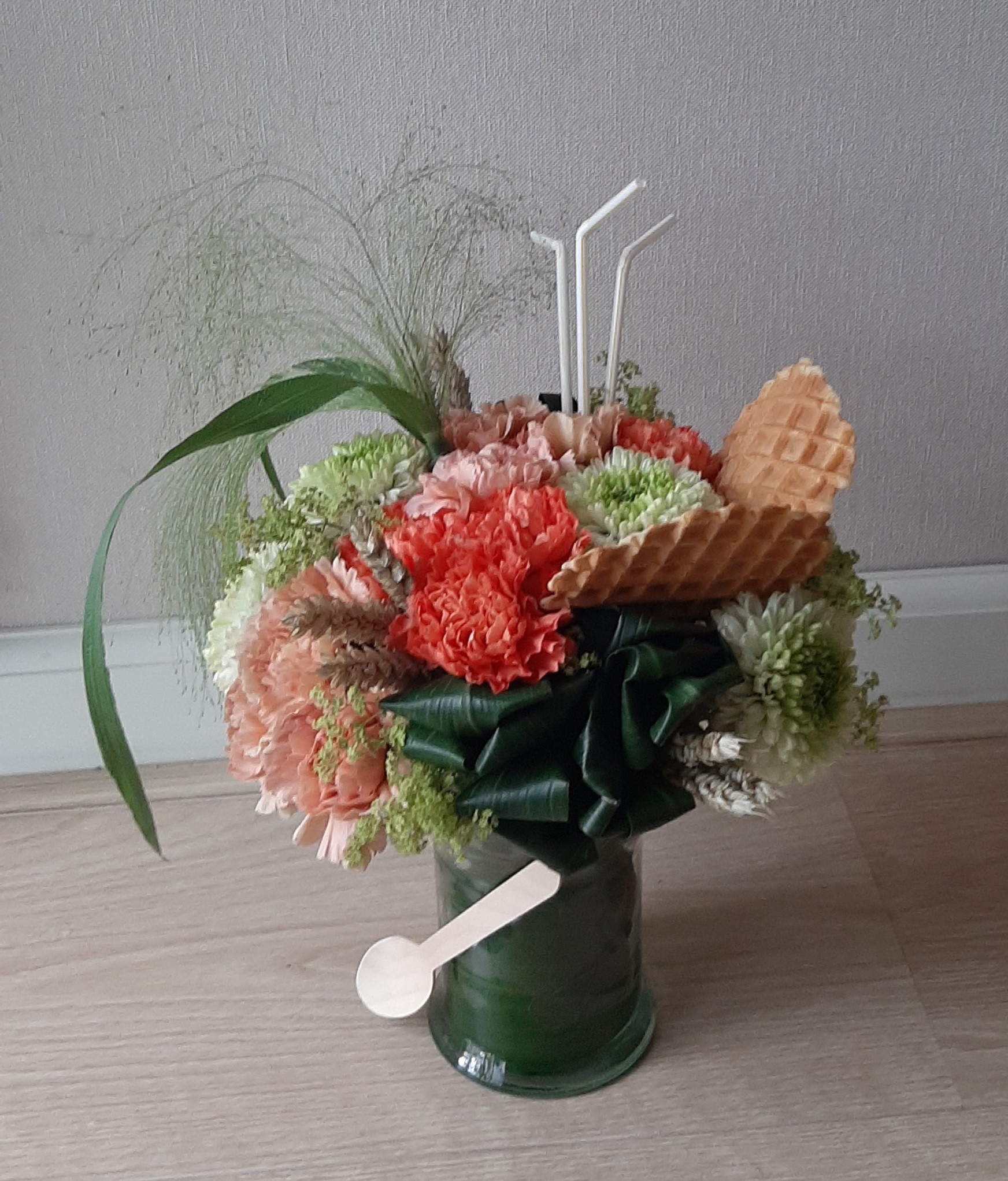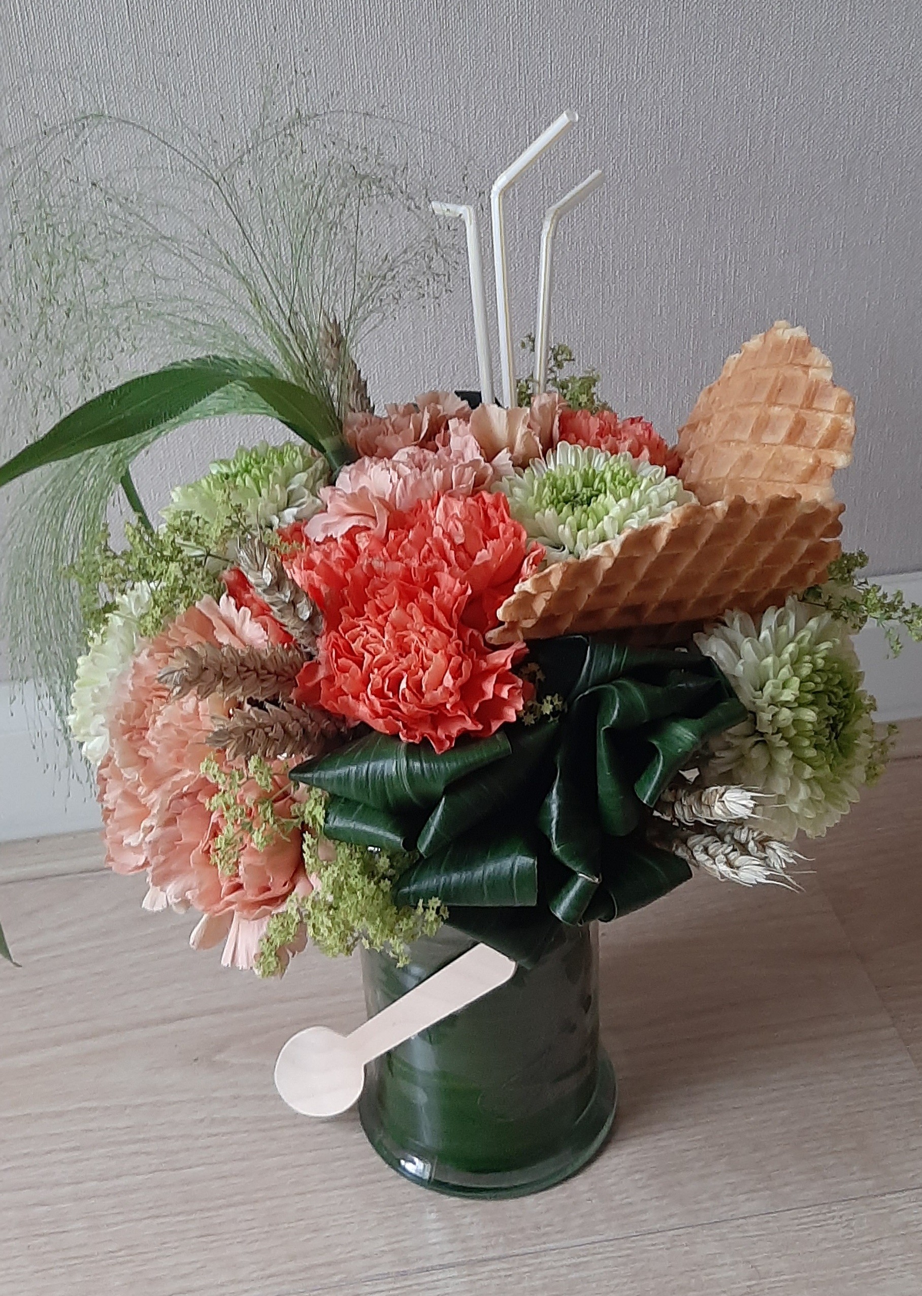 Hallo Nicolle, Wat een leuke zomerse inspiratie les deze ijscoupe biedermeier, dank je wel! Omdat het glazen vaasjes vrij hoog is had ik al 3 aspidistra bladeren nodig voor in het vaasjes en rondom de oase. Daarna nog 2 groepjes van 3 toefjes bladeren kunnen maken.Het vouwen van de bladeren was wel even een lastig klusje maar leuk om uit te proberen. Met 18 bloemen erin was de coupe wel bijna vol. Met wat koren uit eigen land wat kleine gaatjes opgevuld, wat ook weer een zomers effect geeft en nog een klein beetje Alchemilla voor de frisse groene tint gebruikt. Heb je nog tips? Fijne zomer verder!