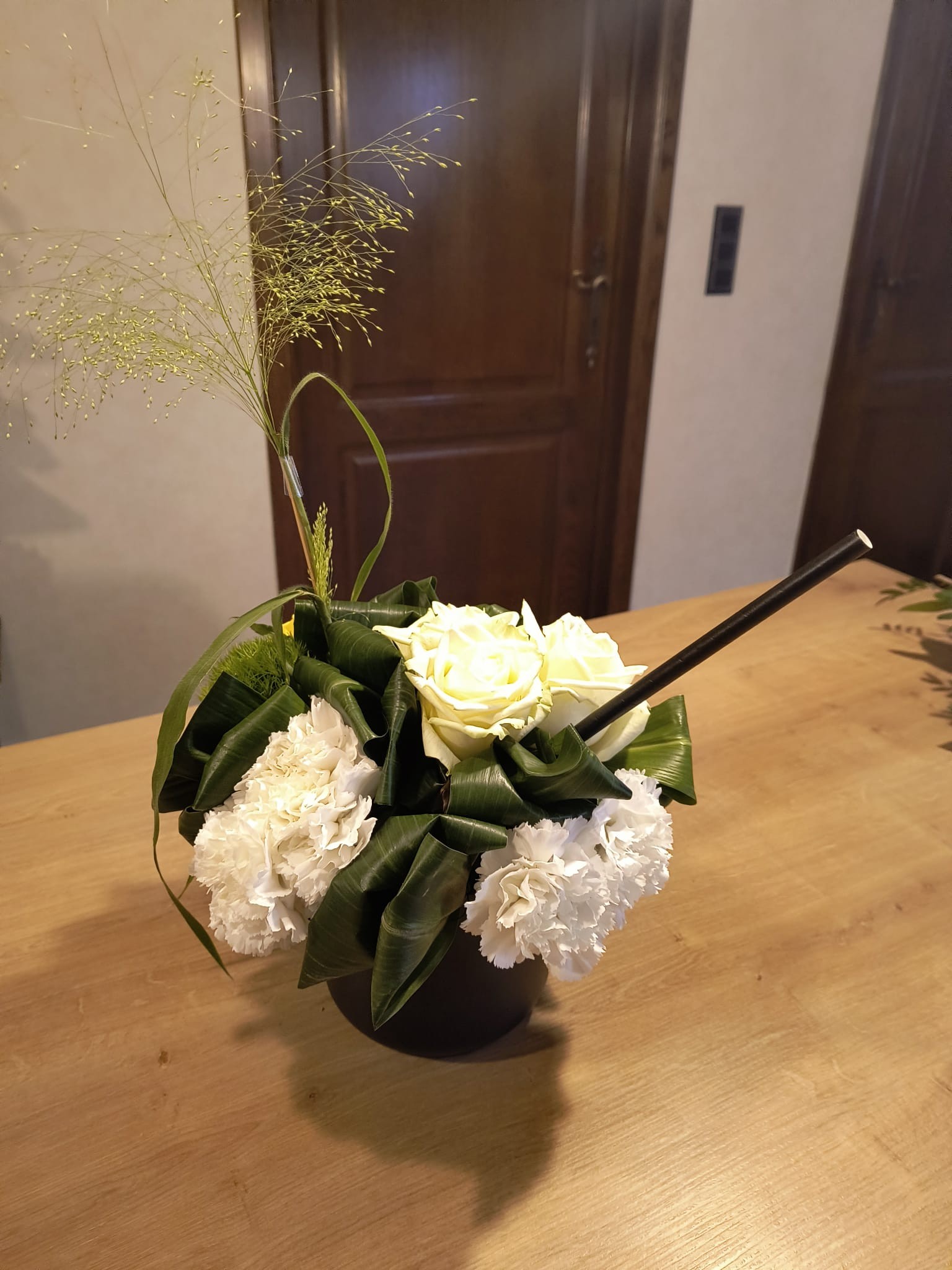 Eén tipje;Probeer volgende keer het Aspidistra blad met de bovenkant naar boven te gebruiken. Nu zit het blad soms op zijn kant of op zijn kop gebruikt. Het is misschien nog wat lastig te zien, maar kijk er eens is rustig naar. dan snap je vast wat ik bedoel. Als je het wat fijner wilt hebben kan je het blad ook eerst scheuren en er dan wat lussen van maken. Als je nog meer lessen gaat volgen kom je het vast een keer tegen.