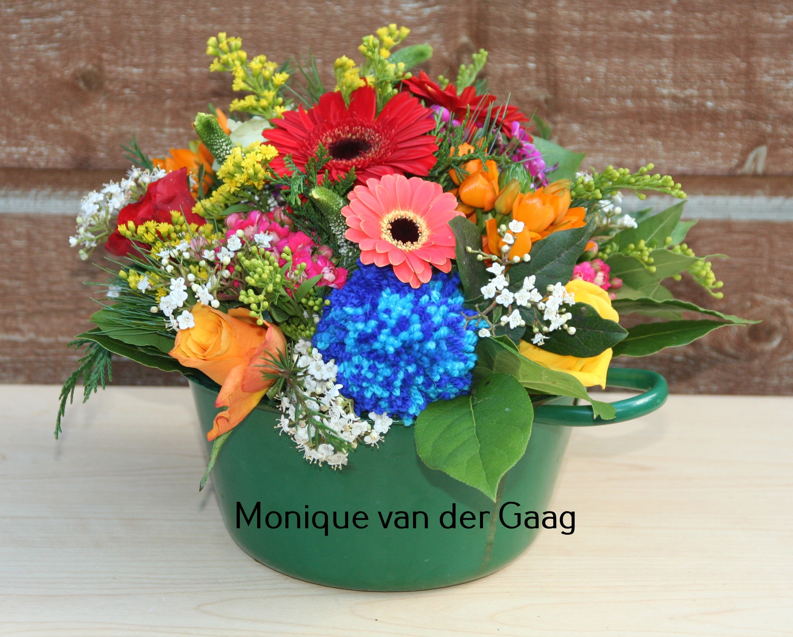 Als ik een rijkgevuld arrangement wil geven, kom ik toch vaak uit op de Biedermeier. Nu ook: weliswaar geen ijscoupe maar een pannetje vol bloemen. Jammergenoeg ben ik vergeten om ook een foto van boven te maken.