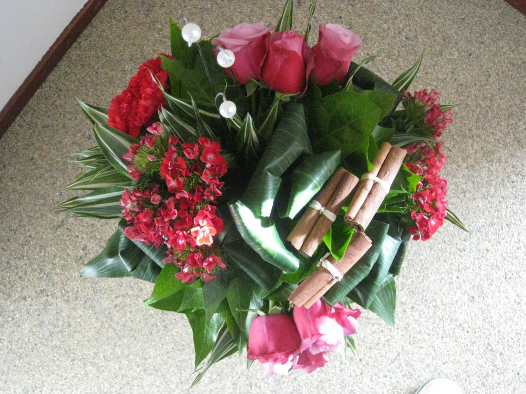 Hoi Vlijtig Liesje, Je Biedermeier in groepen ziet er goed uit. Let erop dat je het Aspidistra blad mooi met de bovenkant erin steekt. Zelf gebruik ik liever twee prikkers dan gaat je Oasis niet zo snel draaien en met zoveel materialen het liefst een half blok. Ik begrijp eigenlijk niet waarom je de twee stokjes hebt gebruikt heb je daarop soms de andere oasis gestoken? Groetjes, Nicolle