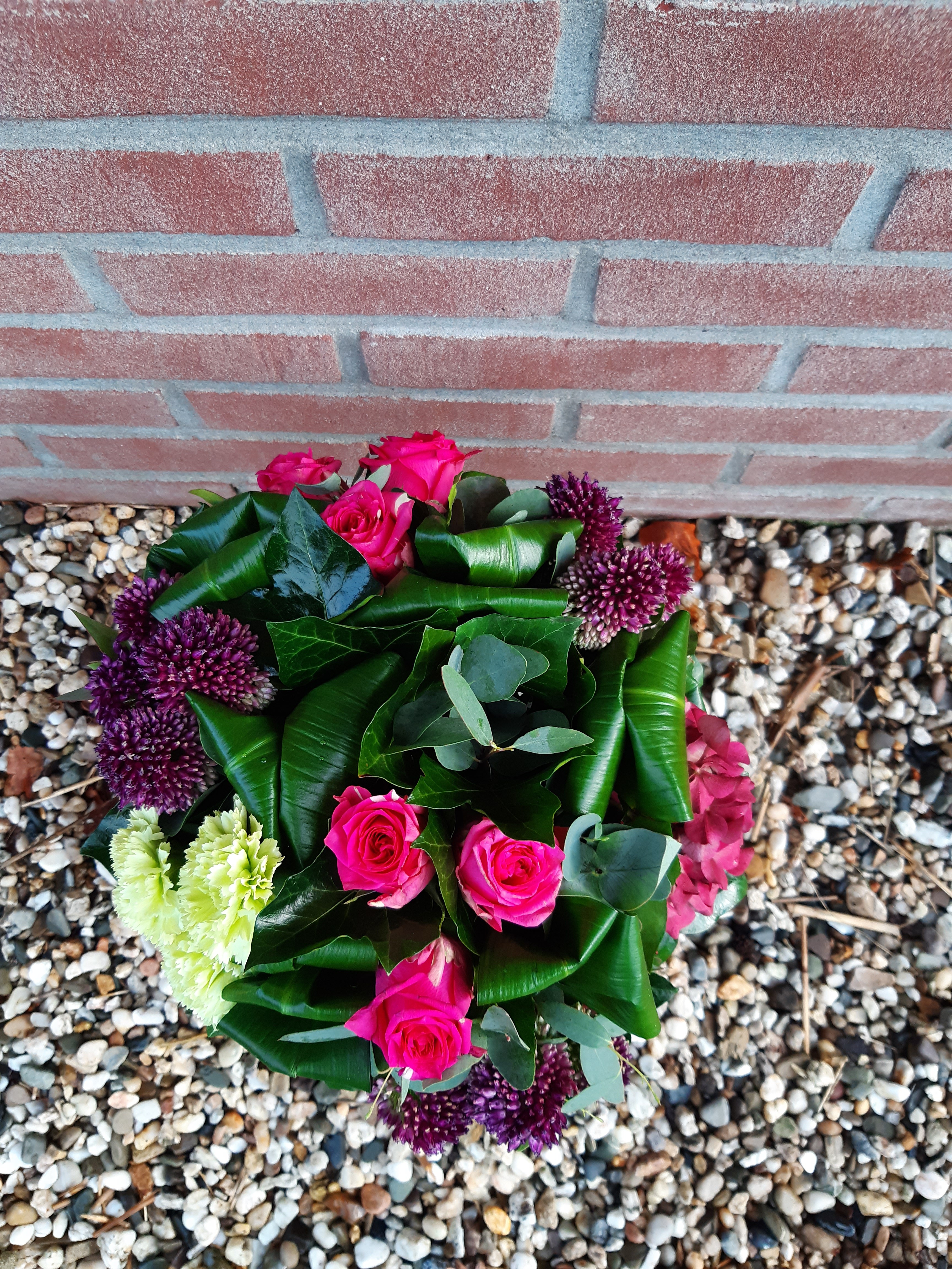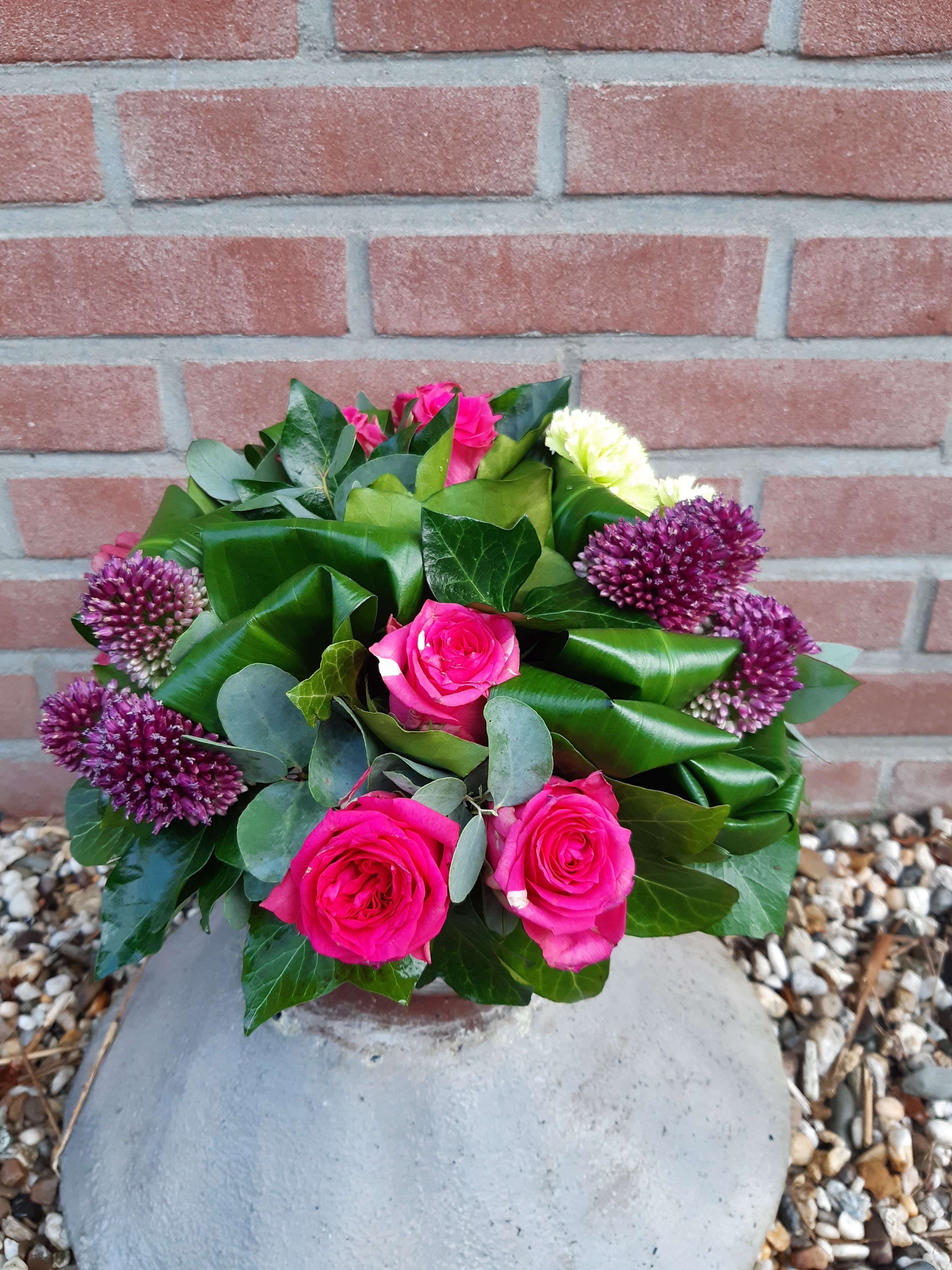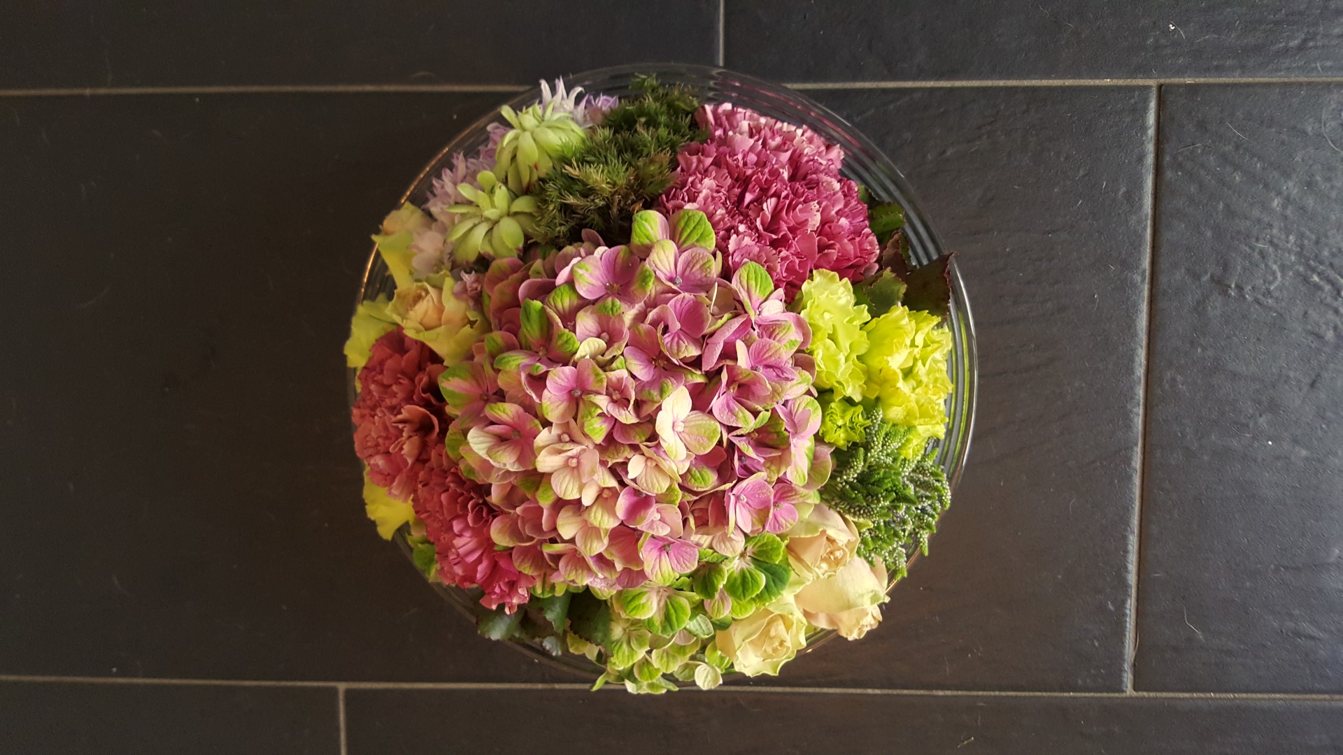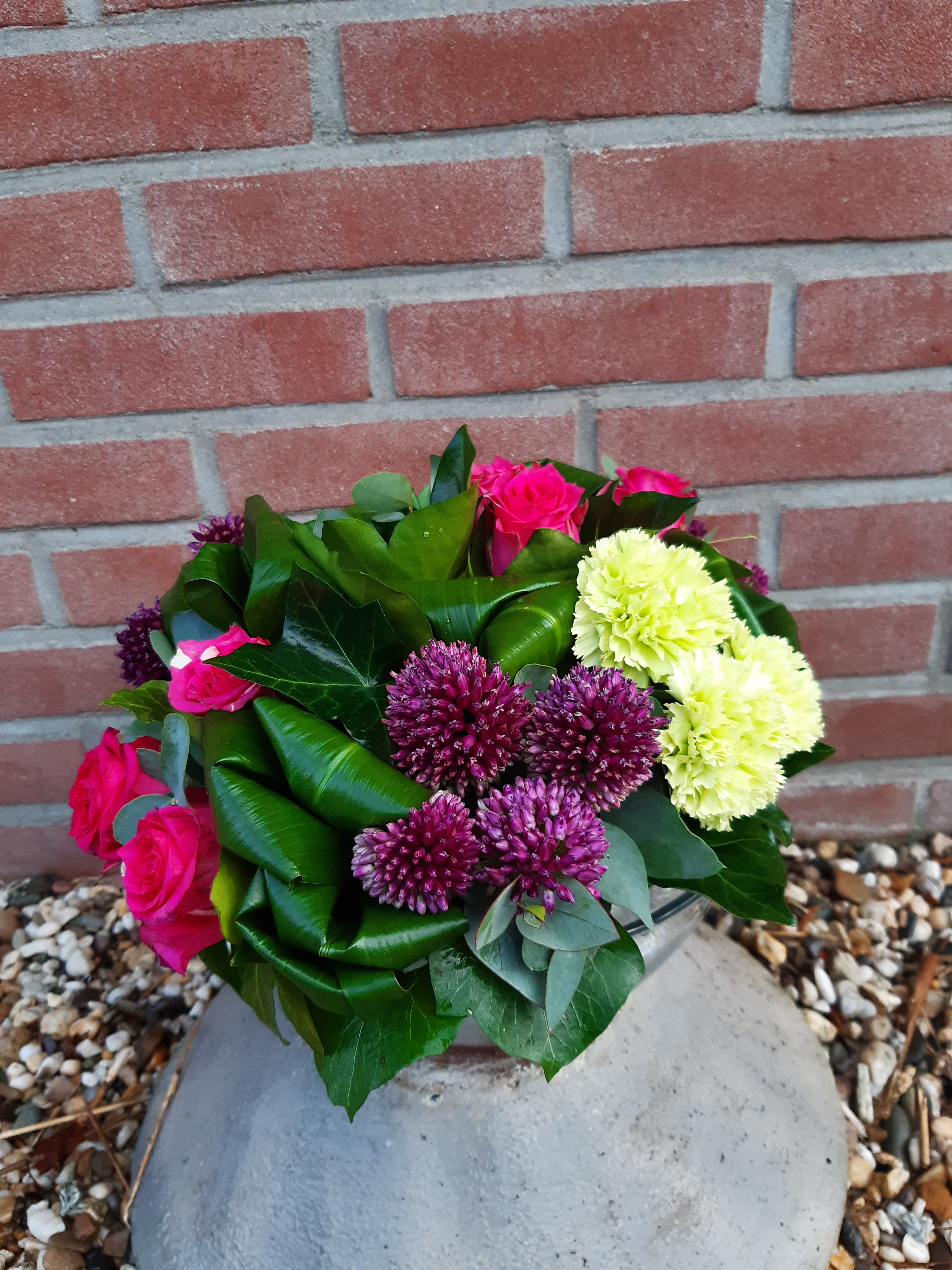 Hoi Rita, Wat heb je er een leuke schaal voor gevonden. Met deze schaal komt je biedermeier in groepen nog mooier uit. Hij is keurig rond en mooi verdeeld! Misschien dat je de 2 gerbera mini iets meer van elkaar af had kunnen steken, ze zitten wat krap. Dat is ook maar een heeeel klein puntje. Jij zal dat nu ook wel zelf hebben dat hoe perfecter je bloemwerk wordt je steeds kritischer wordt. Groetjes, Nicolle