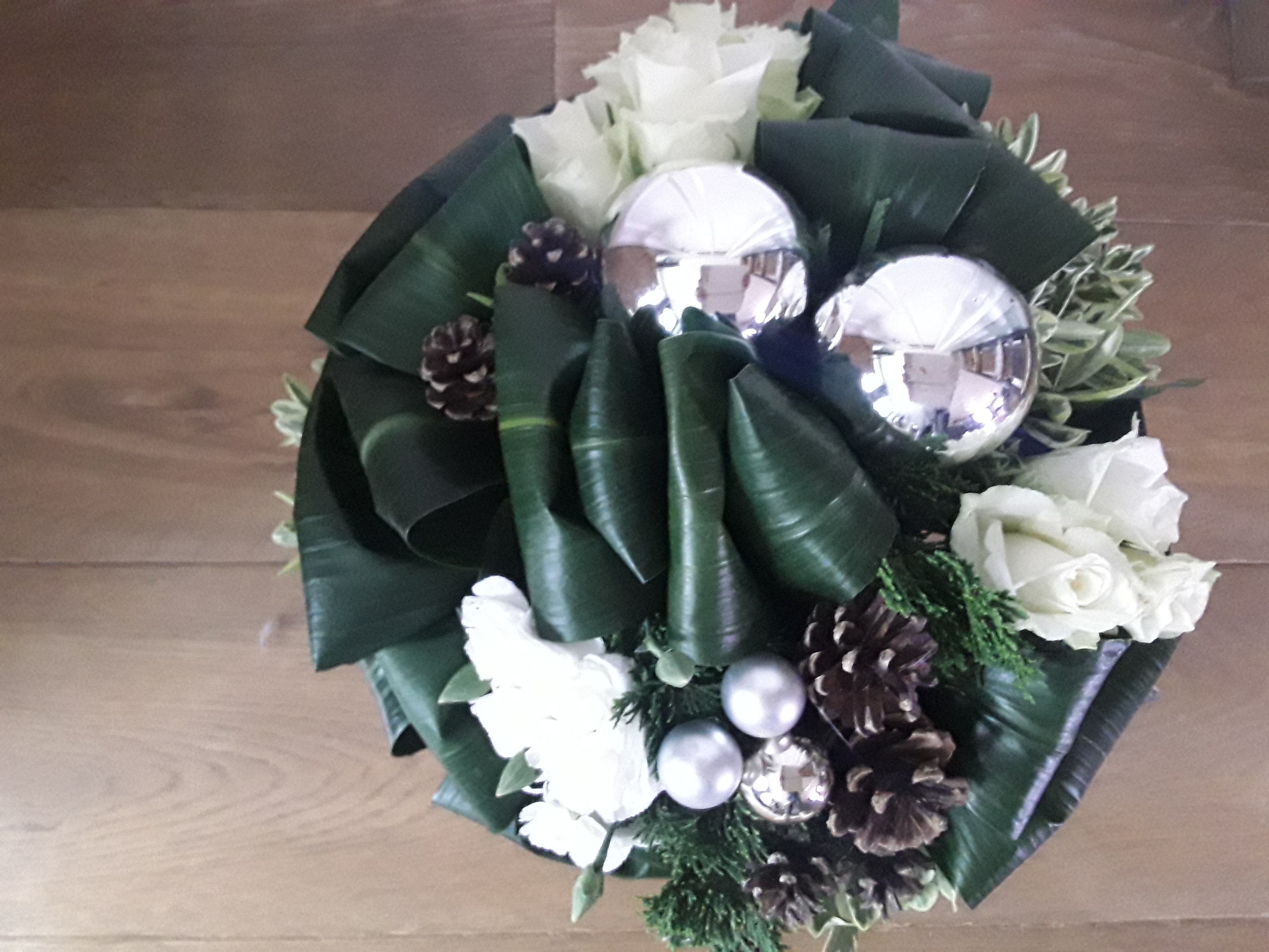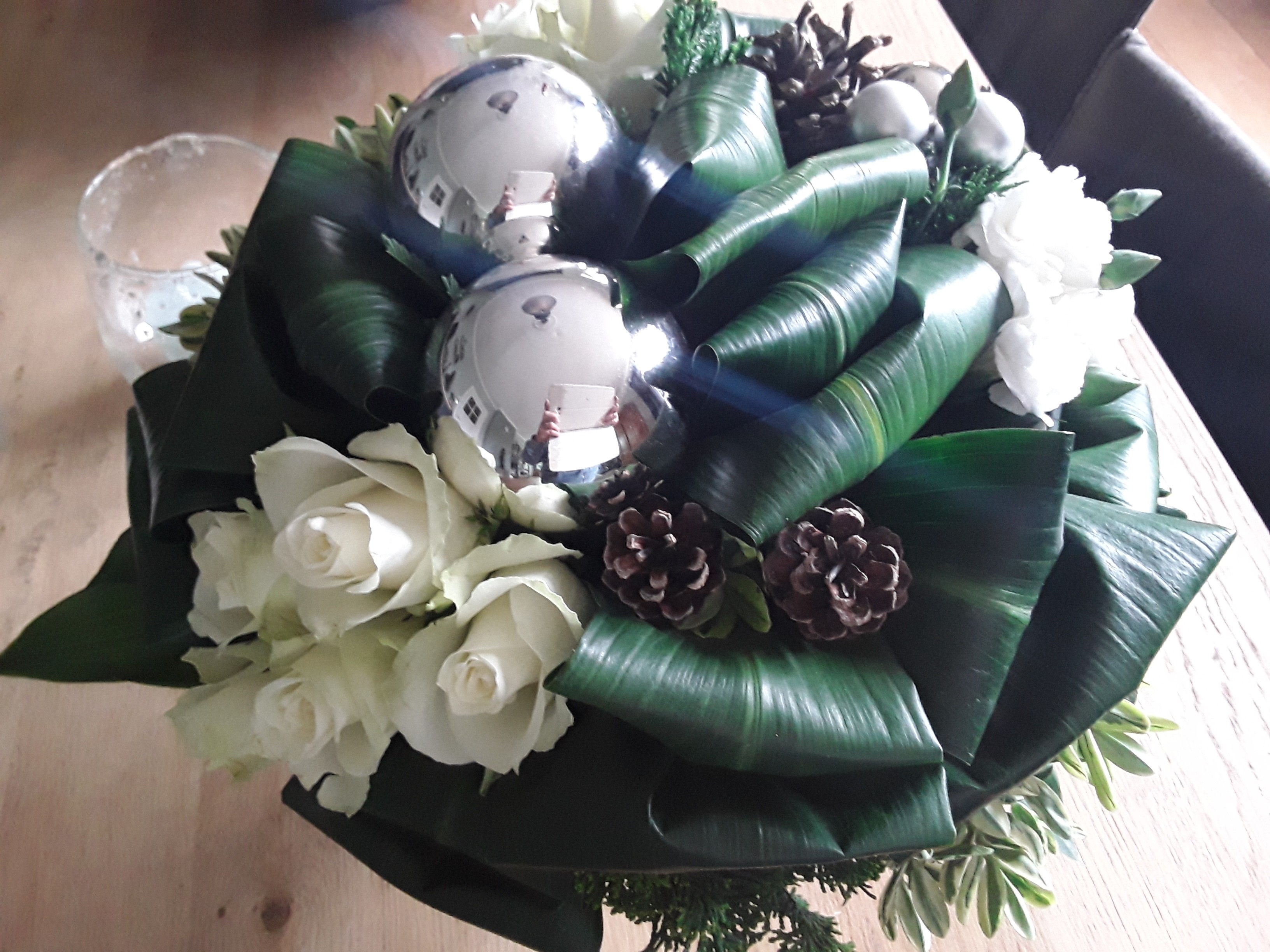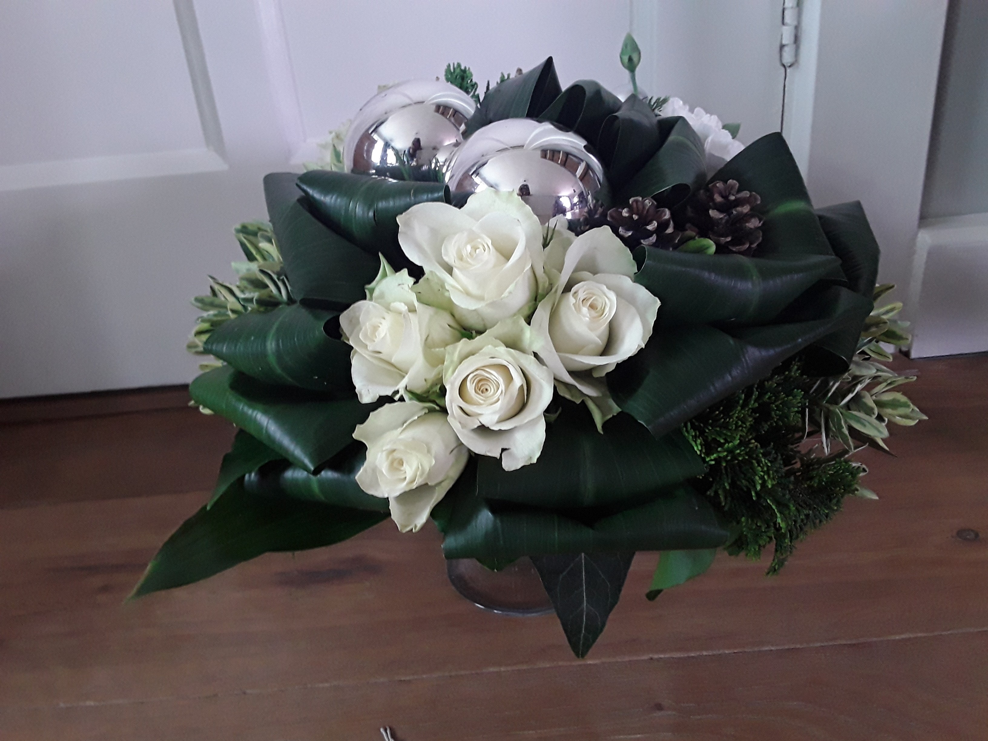 Hij is echt mooi rond geworden en de verdeling is ook keurig. Je zal de rozen even moeten verversen voor de kerst, maar als je de oasis goed nat houd haalt hij de kerst wel. Dank je wel voor de duidelijke foto's. Dat inspireert andere cursisten ook vast weer.