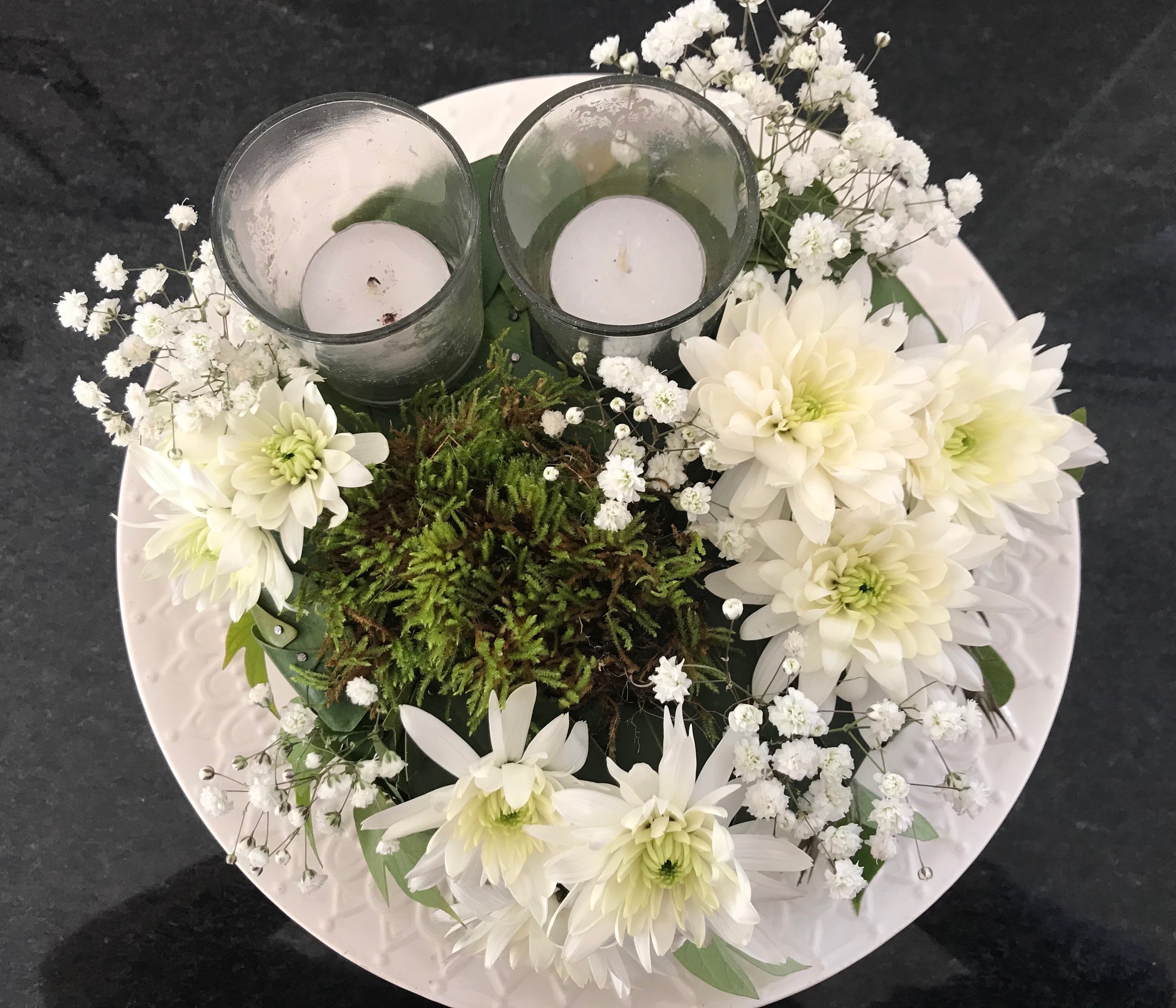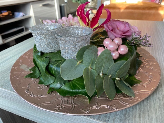 Vond het wel een leuke opdracht. Mijn waxinelichtjes zijn al stekers. Die had ik nog. Ik had geen geen hedra, daarom heb ik appelblad genomen. Onder het appelblad zit aan de zijkant 2 langwerpige bladen, zodat je helemaal geen oasis zit