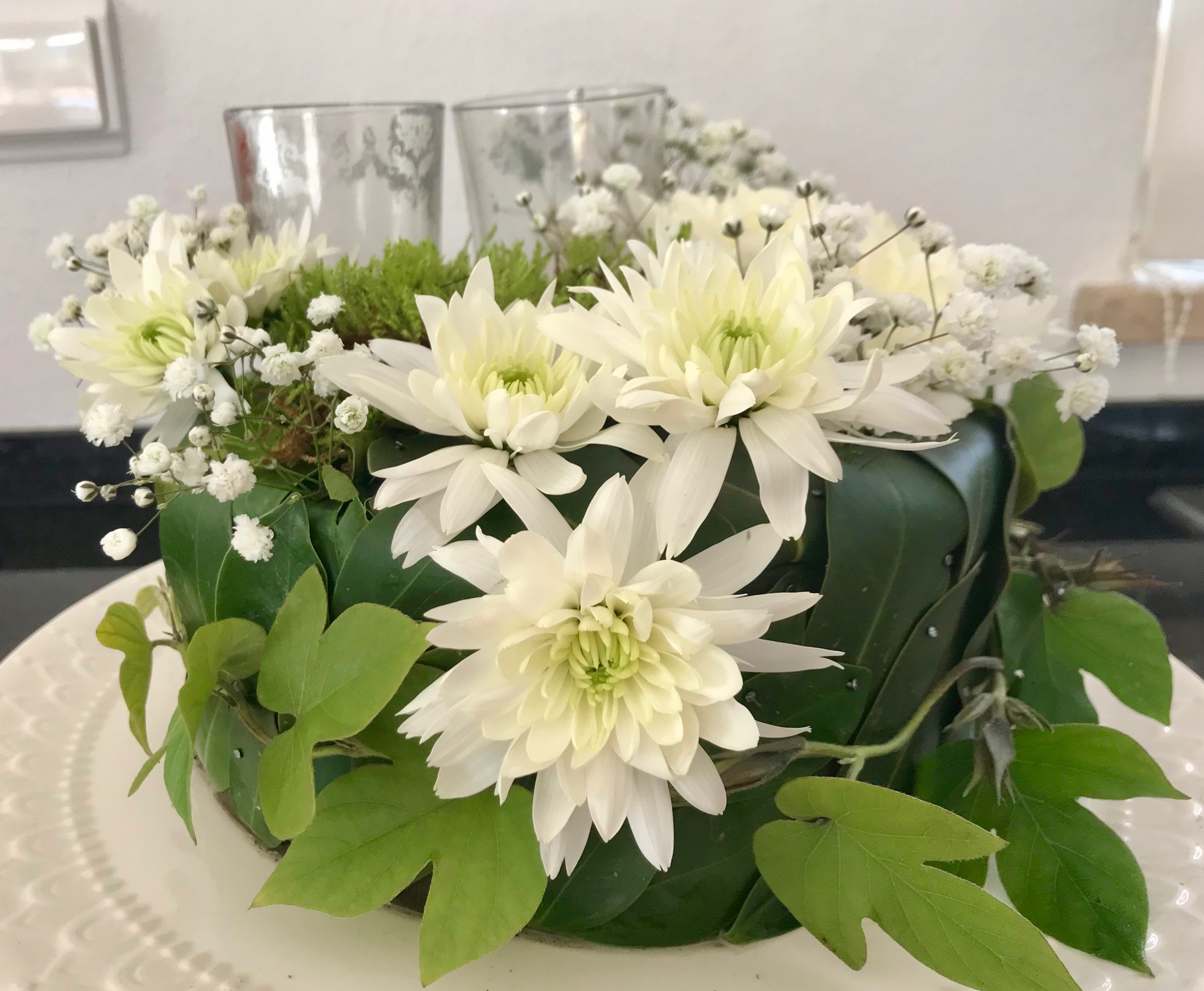 Leuk dat je weer aan de slag bent gegaan. Goed plan om eerst de oasis met groot blad weg te werken. Het bloementaartje kan je op zoveel manieren maken en is er leuk om cadeau te geven. Ik zou zeggen ga lekker door. Je leert er iedere keer weer van.