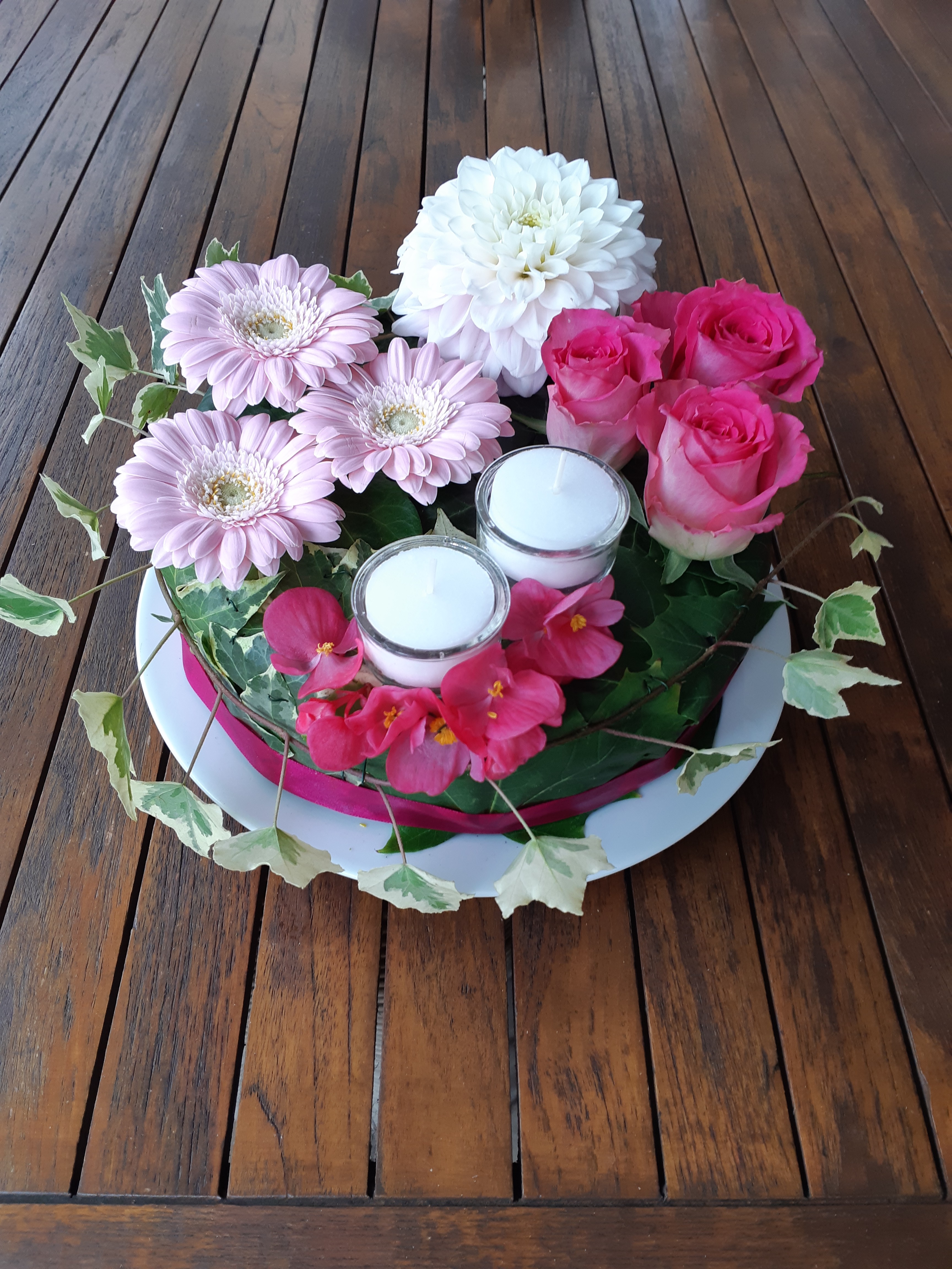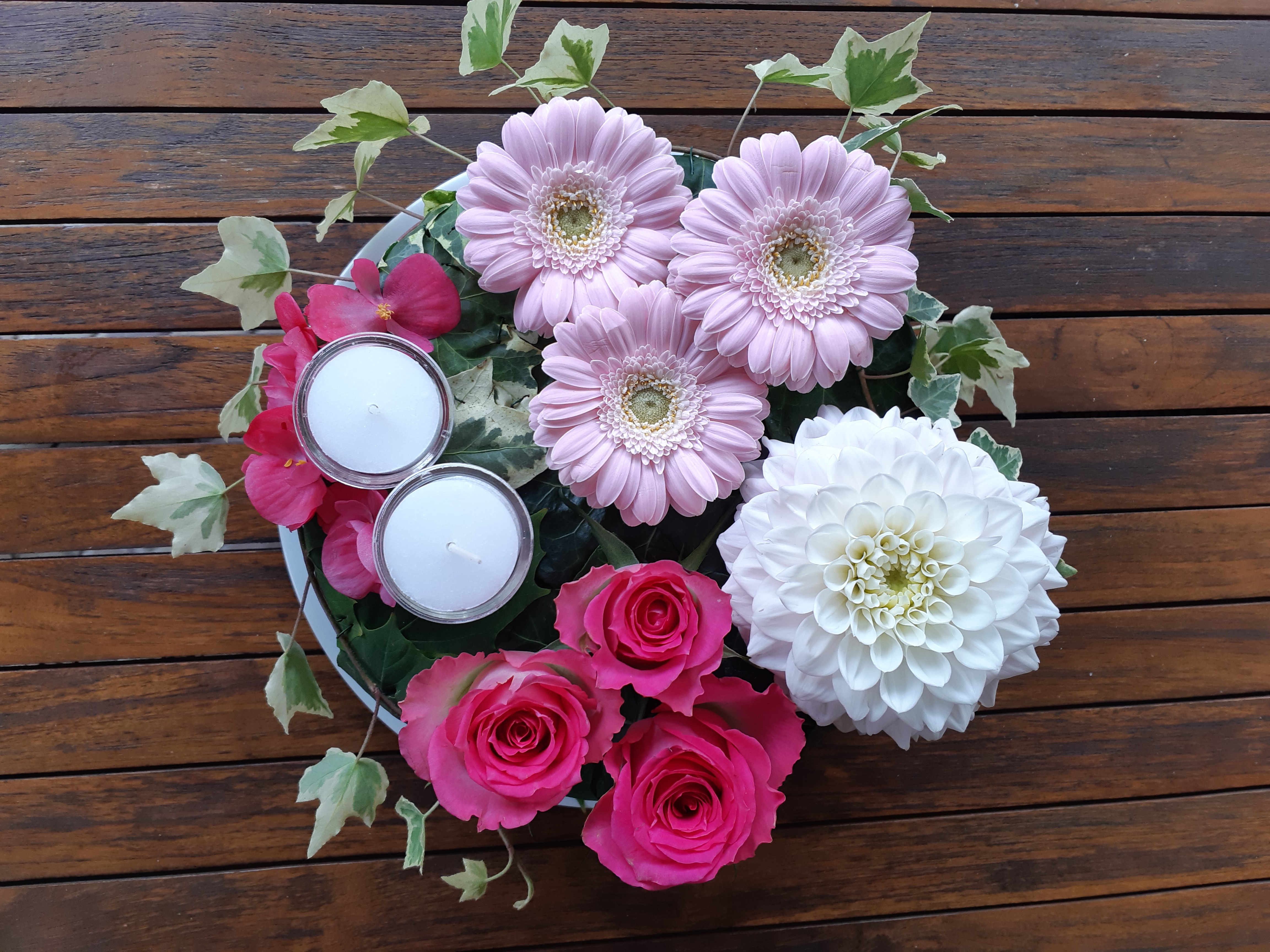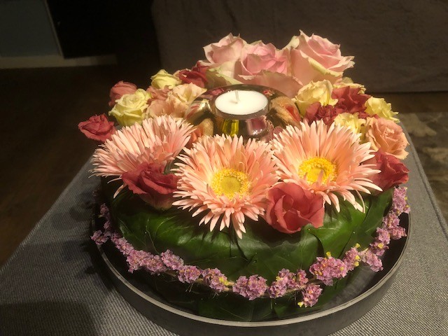 Hoi Nicolle, Hierbij ons taartje voor een verjaardag. Ik vond het taartje wel een klein beetje (drie)zijdig!! Ik denk vanwege de grote dahlia (verschillende hoogtes) en waxinahouders. Ik had geen speldjes dus maar met krammetjes gedaan. Het was leuk om te maken zeker samen met mijn zoon. De volgende taart voor oma is al gepland. Voor alles wat ik nog ga maken, hoor ik graag wat er beter kan. Ps ik mis de foto's van mijzelf en anderen, worden deze er nog opgezet. Zie graag de mooie bloemstukken en de bijbehorende feedback. Gr Simone