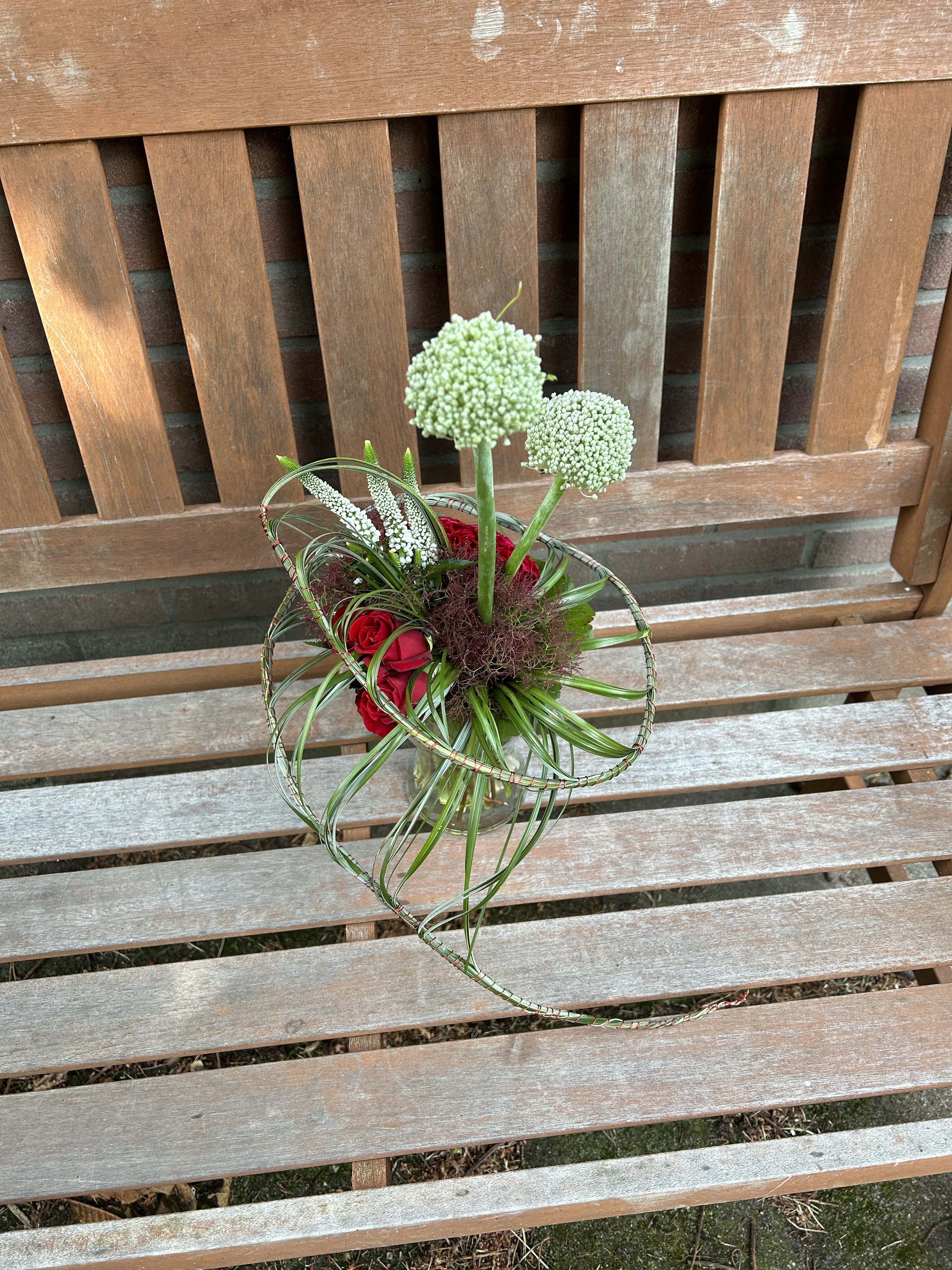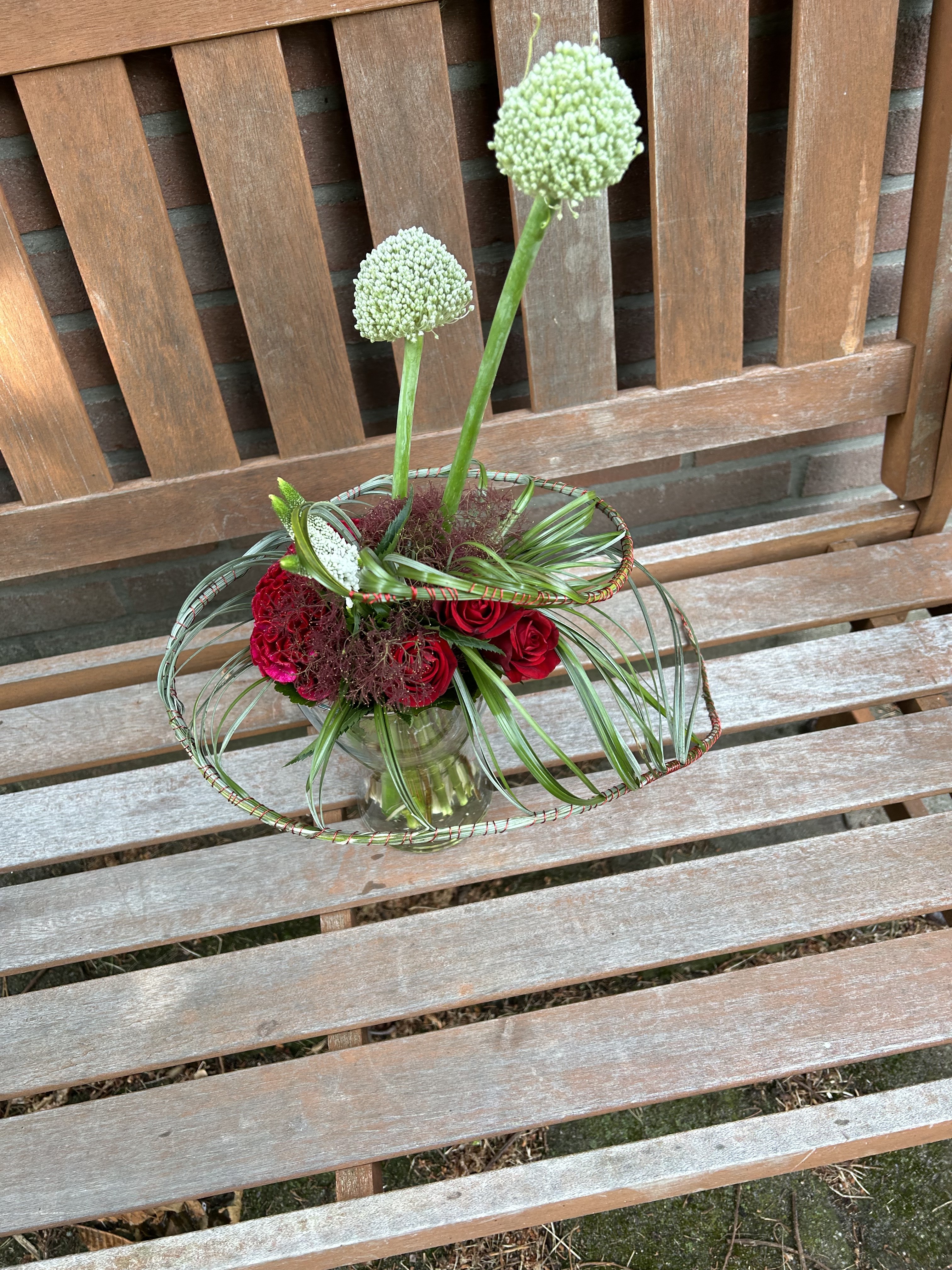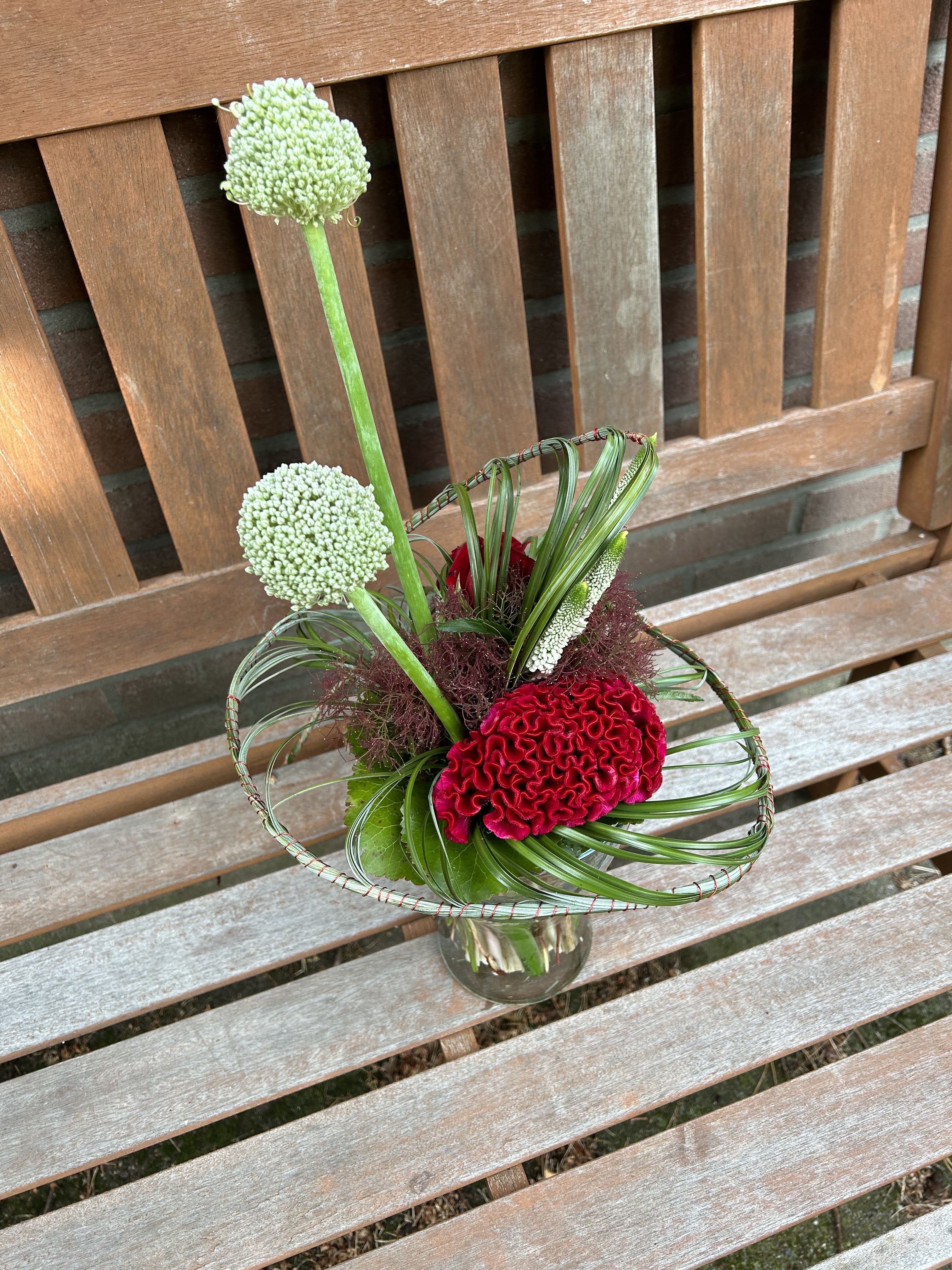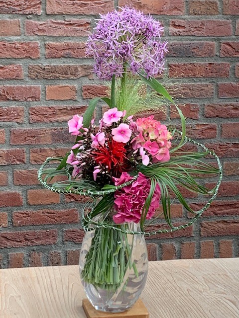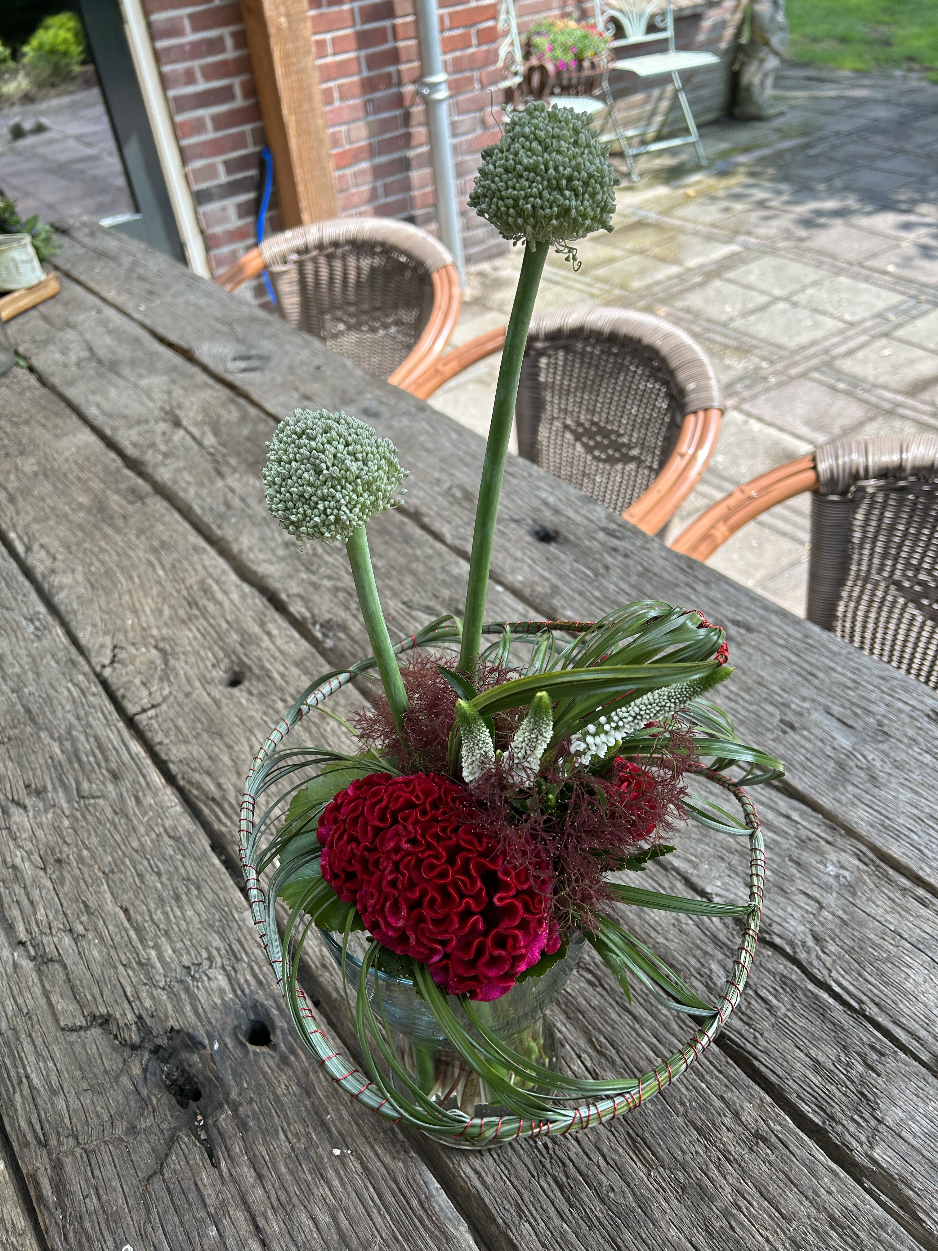 Je bent nog steeds goed bezig! Dit boeket is erg mooi geworden! Keurig frame. Ook de materialen zijn prachtig. In de les heb ik ook in de hoogte gewerkt, maar je Alliums hadden ook kort verwerkt mogen worden. Dan gaat je aandacht nog meer naar je frame, maar het kan alle twee. Mijn vingers jeuken ook weer als ik dit boeket zie.
