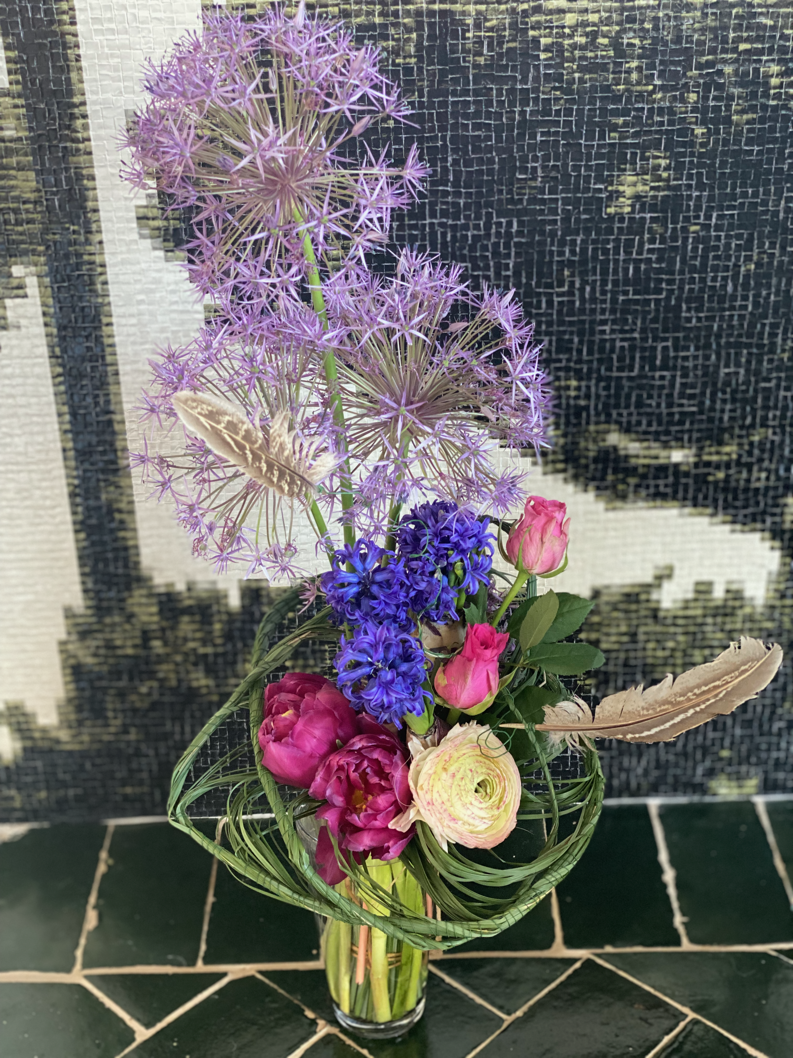 Zelf denk ik dat ik het mooier had gevonden als je de stijl van bovenin had voortgezet. Nu lijken het eigenlijk een beetje twee verschillende boeketten en maak je het ook nog lastiger. Als je onderin ook alleen drie alliums en wat tropisch blad had gebruikt was het meer één stijl en rustig geweest. Ook had je boeket waarschijnijk langer gestaan, omdat de materialen dan ongeveer even sterk zijn.