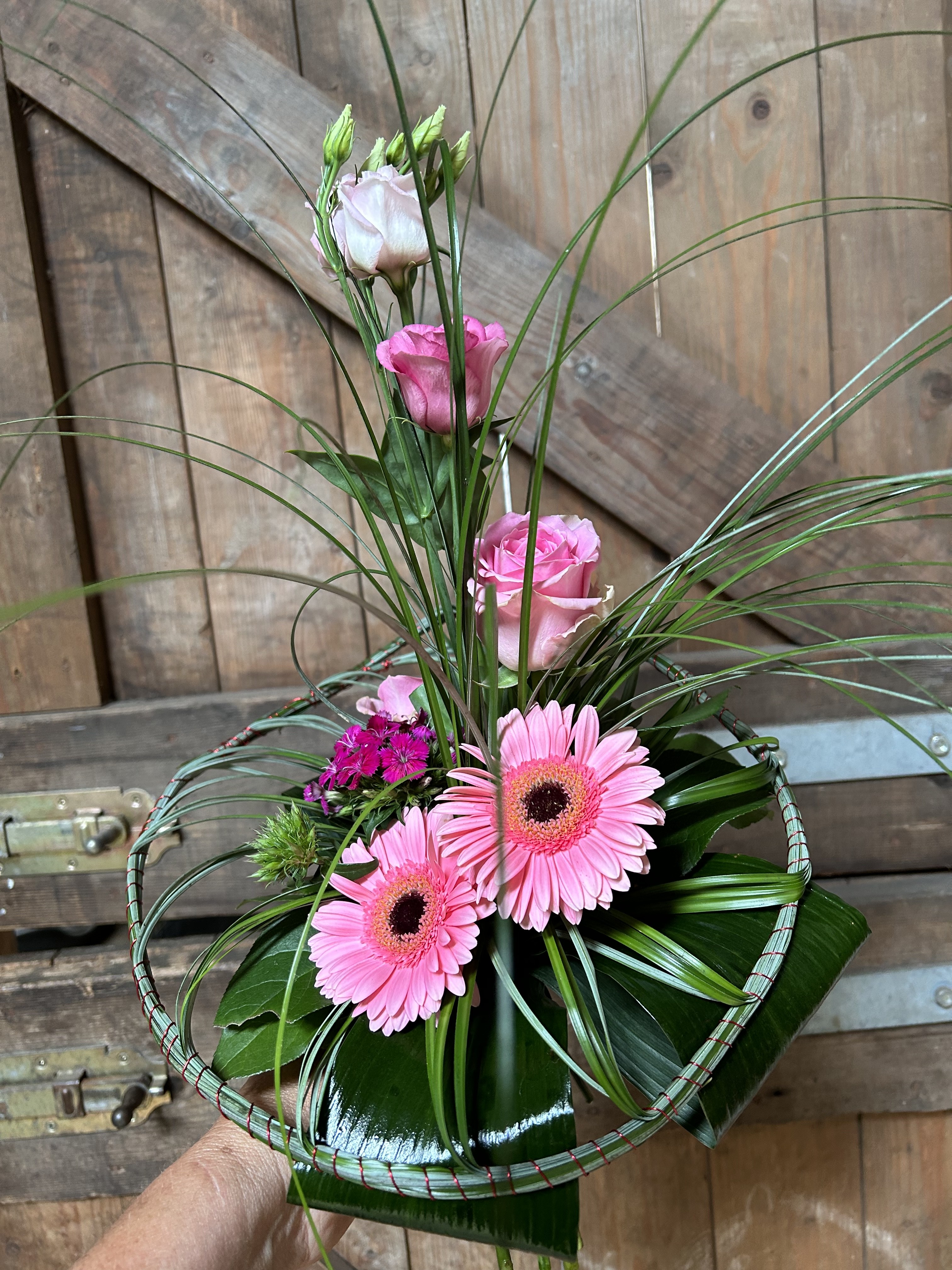 Het is een leuk en vrolijk boeket geworden en het was zeker een goede oefening. Ik begrijp je probleem onderin je boeket. Daar heb je materialen gebruikt die veel kwetsbaardere stelen hebben en die je dan moet binden om de dikke sterke stelen van bovenin. Het kan wel, maar makelijk is het zeker niet.