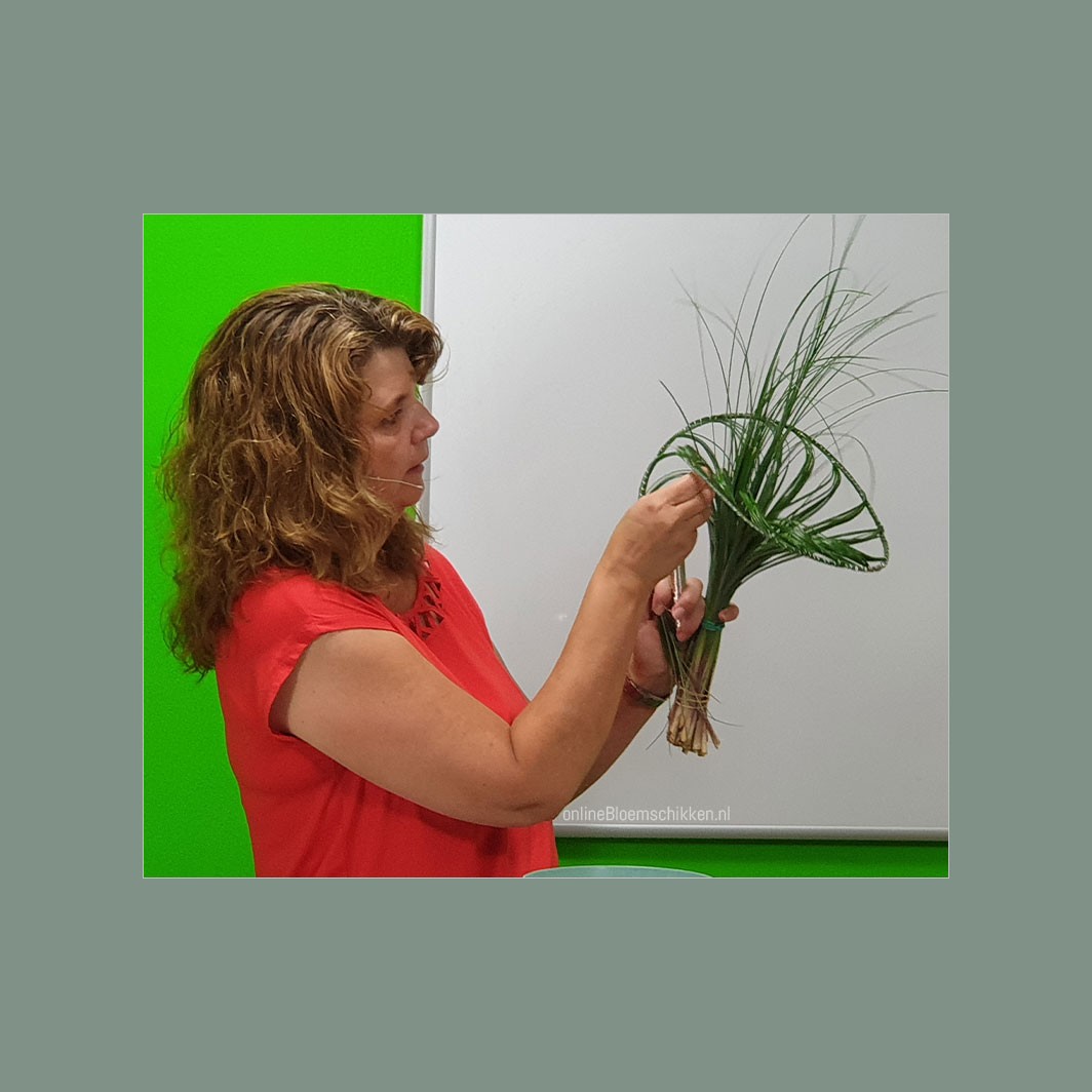 In plaats van een bos berengras kan je deze techniek ook toepassen op een heel groot palmblad: Chamaerops. Je begint dan net als in les BG-005 | Gevlochten boeket.