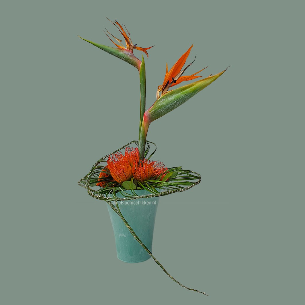 Dankjewel Nicolle, voor deze inspirerende les. Nu ik nog in opleiding ben, is het kopen van een Paradijsvogelbloem nogal een monetaire uitdaging. Want per stuk kosten ze 3,50 Euro. Vorige week in opdracht een lineaire schikking met maar liefst drie Strelitzia's mogen maken. Wauw, dat was leuk! Maar dit arrangement vind ik ook geschikt. Zeker nu ik weet, dat er nog meer bloemen verstopt zitten in de 'snavel'.