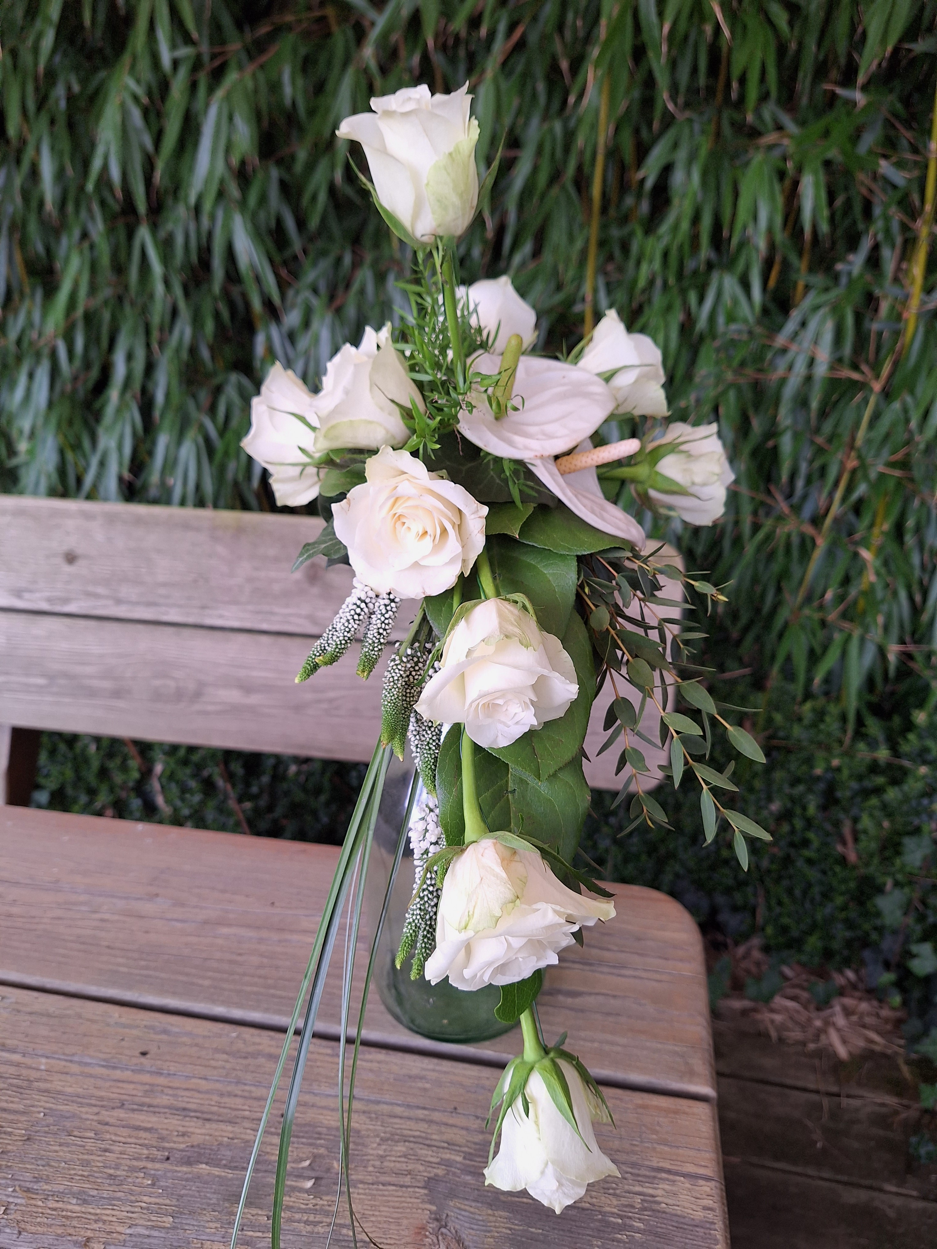 Hoi Liliane, Knap gedaan. Dit is ook geen makkelijk bruidsboeket om mee te beginnen. Beter gezegd: het is het moeilijkste boeket van de Vakopleiding. Ik raad je aan om met les één te gaan beginnen als je nog geen ervaring hebt. Als je alleen bruidswerk wil maken dan kan je ook beginnen aan de eerste les van de cursus Bruidsboeketten en Corsages. Het eerste bruidsboeket op draad is dan het Biedermeier Bruidsboeket op draad. Daar leg ik uitgebreid uit hoe je op draad moet zetten en moet draaien. De lessen zijn dan echt opvolgend. Ik vind je lineaire bruidsboeket er wel erg goed uit zien, zeker als het je eerste keer is. Je vorm en verdeling is prima. Je Gerberas in het hart hadden wat meer ruimte en horizontaler gemogen, dan komen ze beter uit. Ook je langste lijn had iets meer rond en naar beneden gebogen mogen zijn. De lijnen en verhoudingen worden ook uitgelegd in de eerste Lineaire Vaas les. Deze stijl gebruiken we in meerdere arrangementen. Verheug mij op je volgende werk. Veel plezier. Groetjes, Nicolle