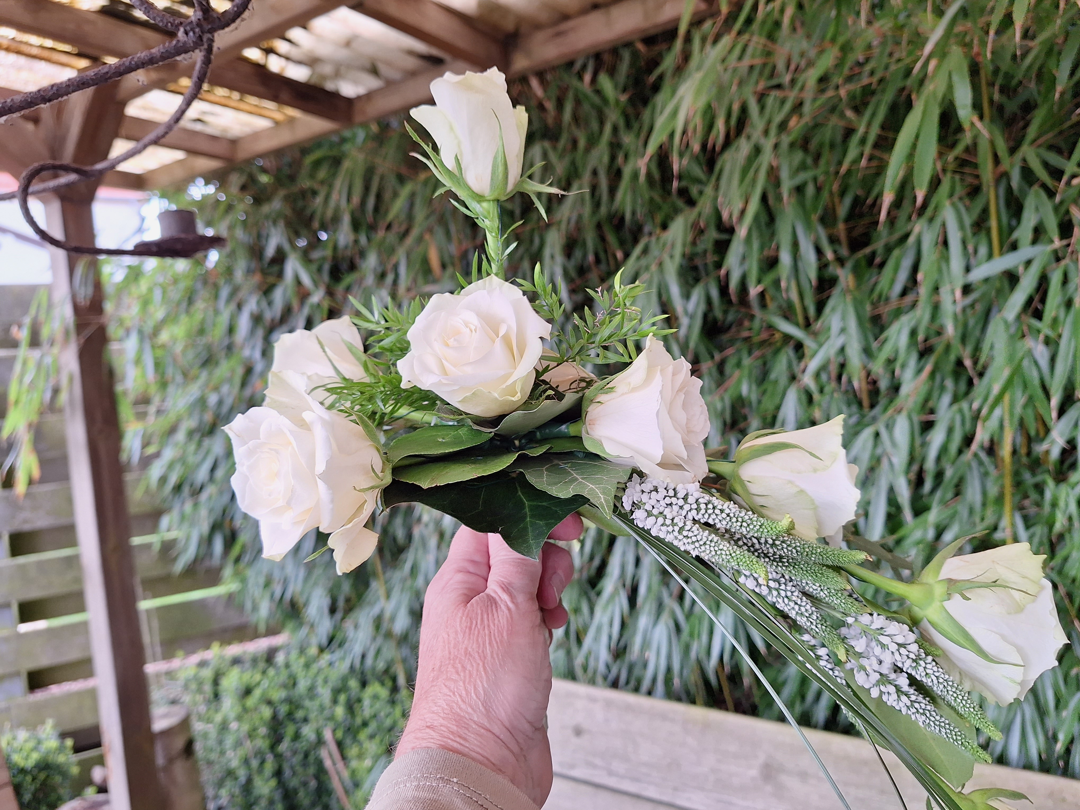 Het was een ingewikkelde maar erg leuke opdracht. Het resultaat vind ik persoonlijk lelijk, het is (nog) niet mijn ding. Ik ga het boeket de volgende wat voller maken. De middelste roos heb ik naar je regel net zolang gehouden als de achterste lijn, maar kreeg de steel niet weggewerkt. De bloemist had jammer genoeg niet de goede materialen, heb wat geprobeerd, maar zou voor het echie het met veel betere materialen gaan doen. Het ging mij voor de eerste keer ook even om de techniek. Kreeg de holle lijn er met mijn blad ook slecht in, ik ben met hedera begonnen en had de volgende groep liever met ronder blad gedaan, maar helaas. Uiteindelijk zie ik ook dat mijn gerbera's nog korter hadden gemogen.