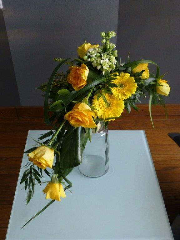 Daar zal ze zeker blij mee geweest zijn. Het is een prachtige druppel. Hij is mooi vol en valt heel mooi in een punt naar beneden. Heel knap van je dat je er zoveel bloemen in hebt gekregen. De Delphinium is een goede keuze geweest, want het is ook een van de weinige bloemen die echt blauw is. Er hadden aan deze kant nog een paar Delphinum's gemogen voor de verdeling, maar ik denk niet dat iemand ze gemist heeft.