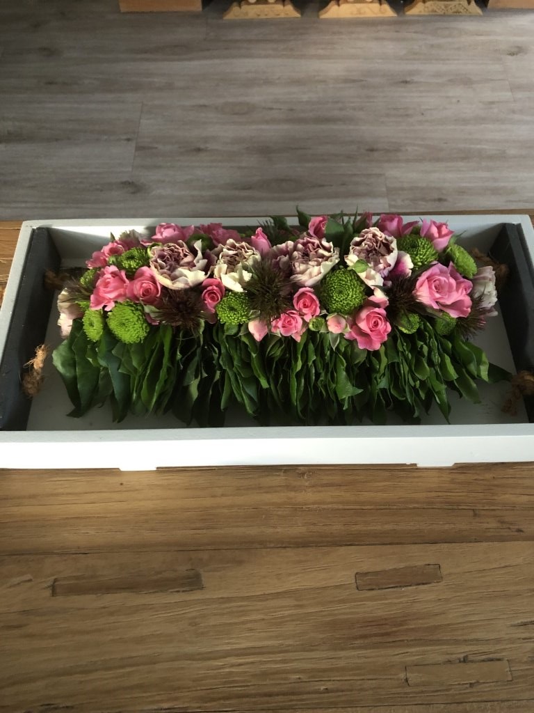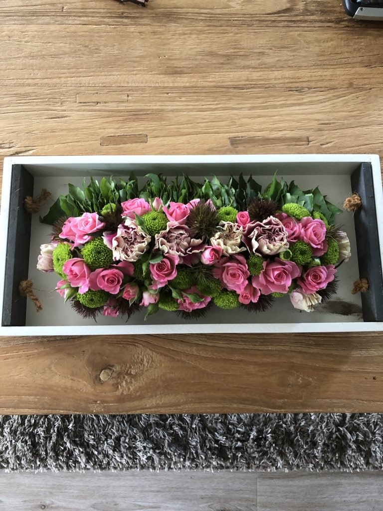 Met het snoeiafval van de buurvrouw en bloemen die over zijn dit arrangement gemaakt. Hier word ik blij van met restjes creatief bezig zijn.