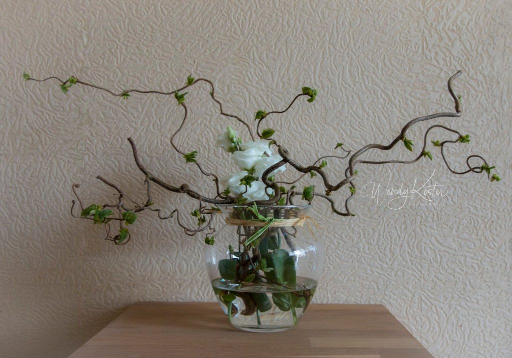 Leuk ook dat de Kronkel Hazelaar begint uit te komen. Denk er volgende keer wel om het blad van de Eustoma wat het water raakt eraf te halen. Dan blijft je water langer schoon en je bloemen langer goed.