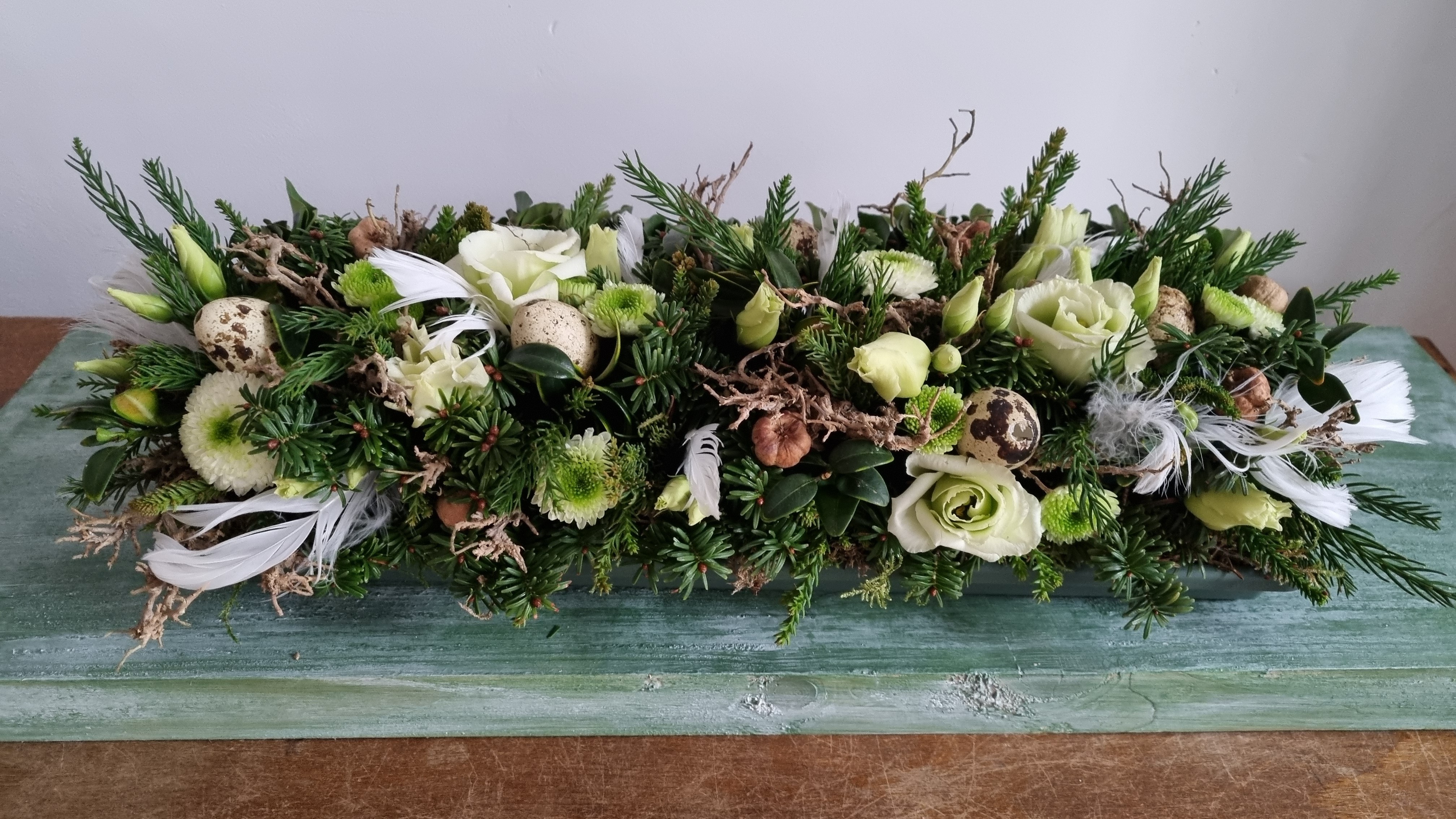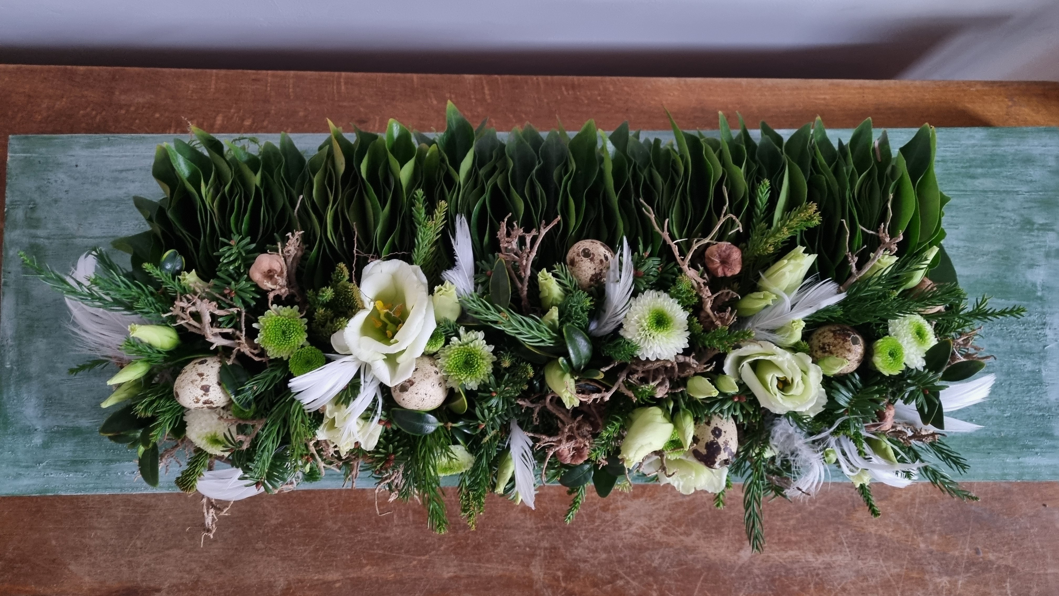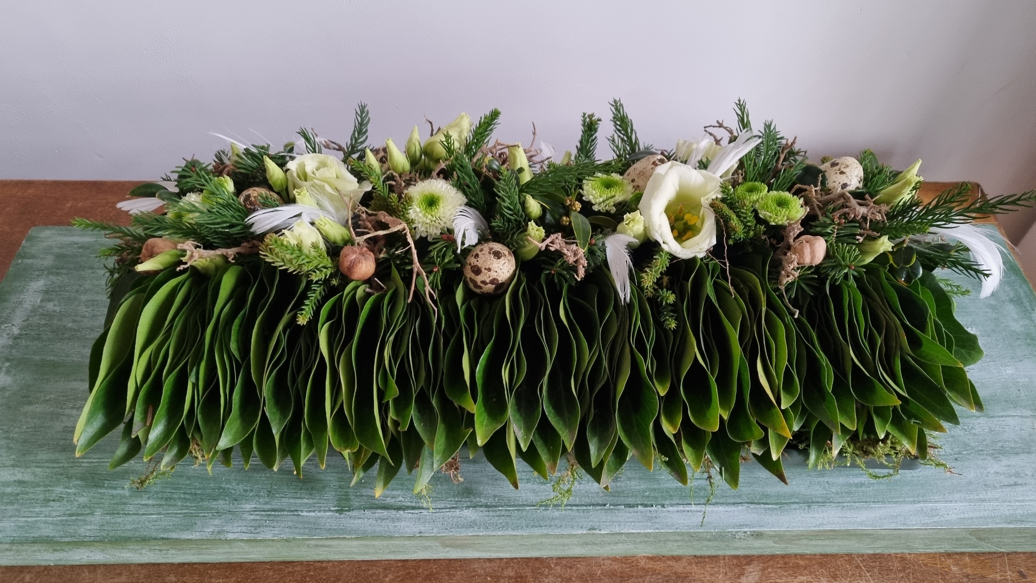 Voor dit arrangement zal je ook wat geduld moeten hebben om alle blaadjes te rijgen, maar het geeft een geweldig effect en is leuk om te doen. Dit arrangement kan ook het hele jaar door gemaakt worden.