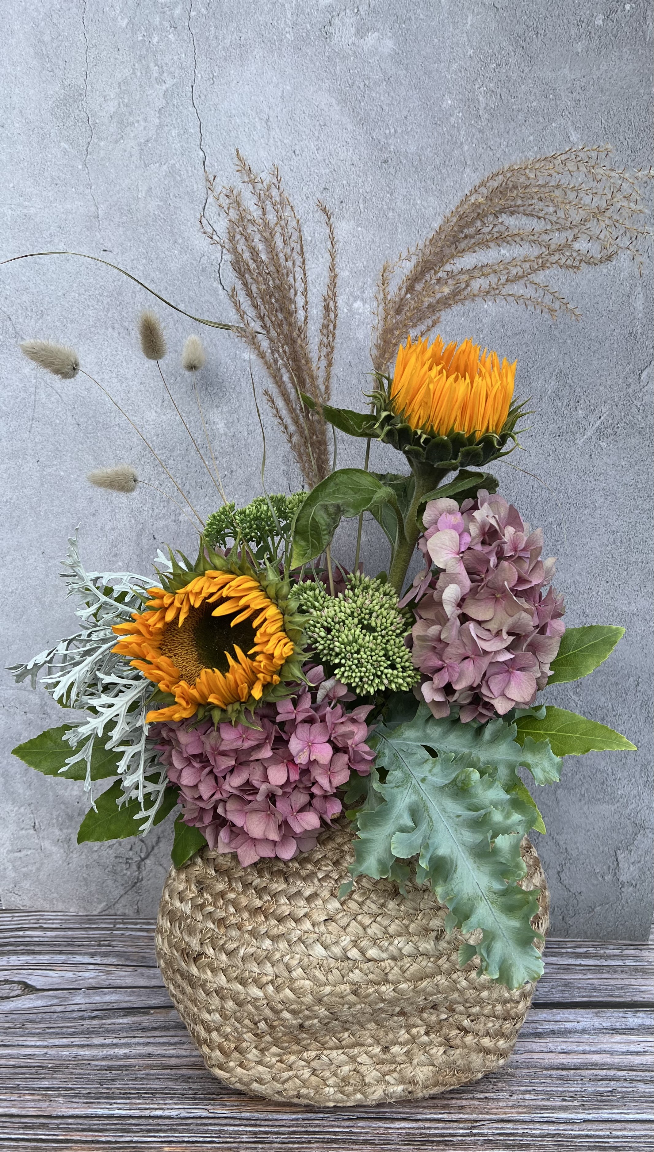 Ik heb in een leuke rieten 'vaas' (zit glazen vaas in uiteraard) een vaasschikking gemaakt. Deels met bloemen uit de tuin en deels uit de bloemenwinkel.