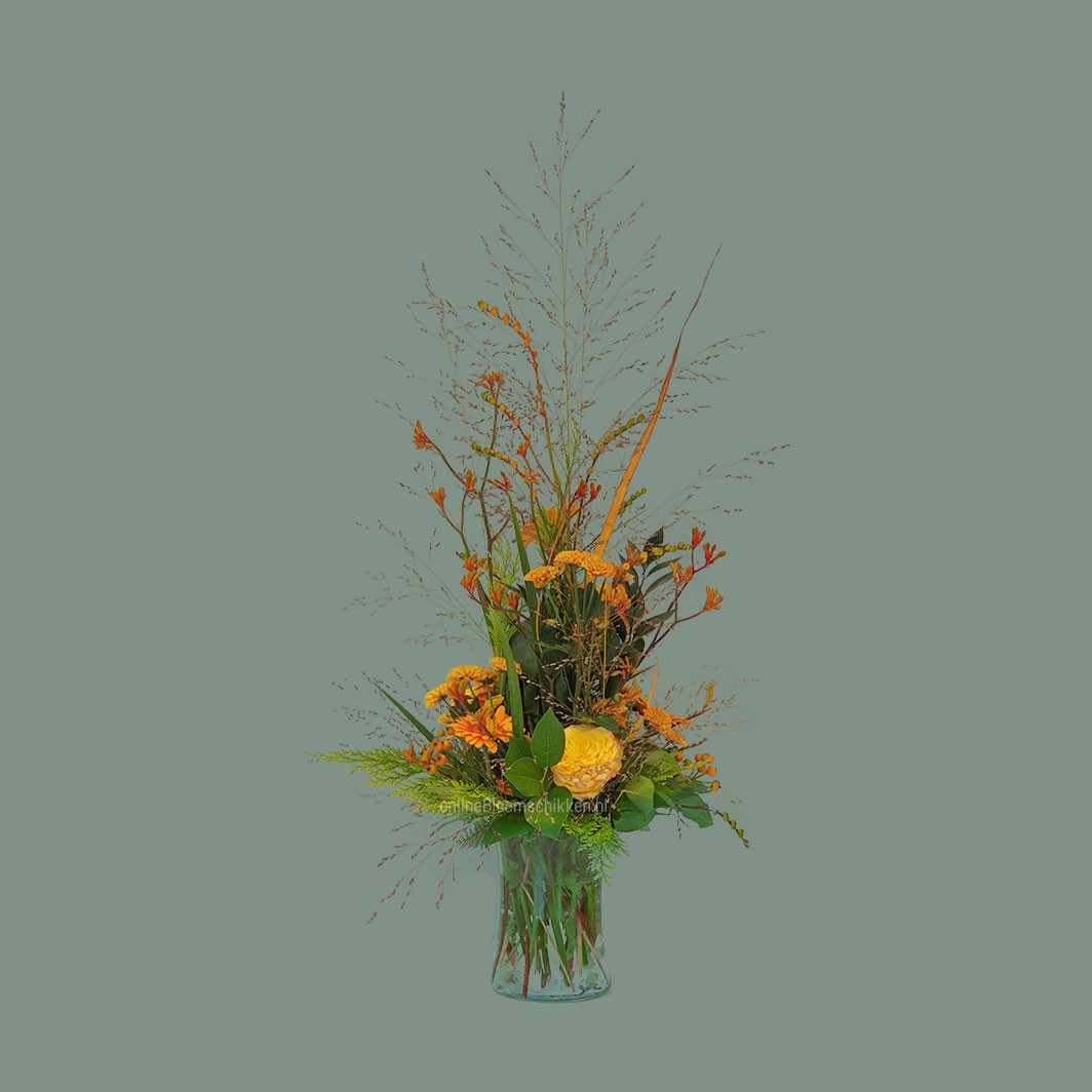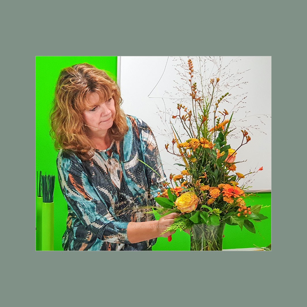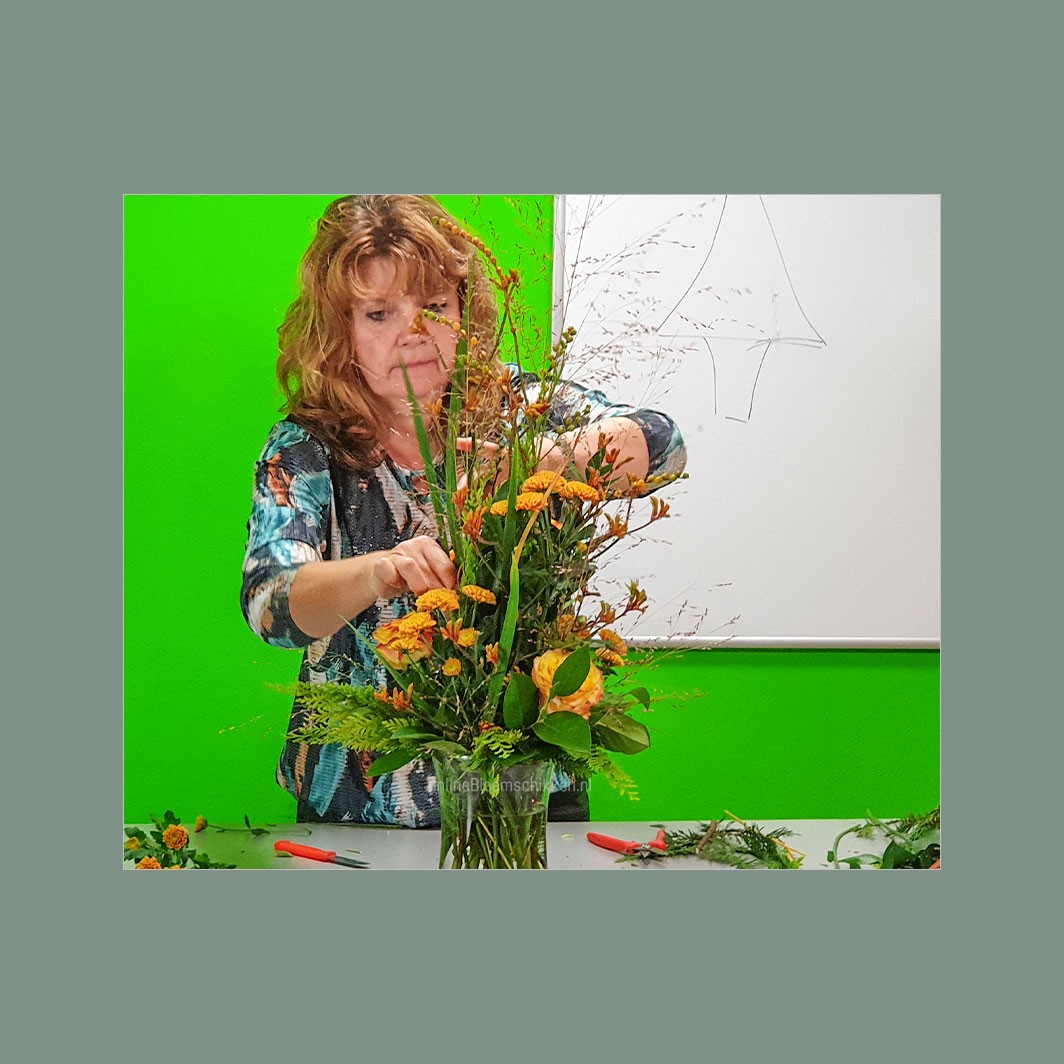 Wat een leuke creatie hebt gemaakt. Erg mooi zo met deze vaas en de materialen. Je zou ook nog wat meer of zwaardere materialen in de hoogte schikken, zoals Pampus gras ofzo, maar dat moet je natuurlijk maar in de buurt hebben. Je zal hem vast nog wel een keer maken met ook van deze mooie materialen in de nazomer. Geniet ervan.