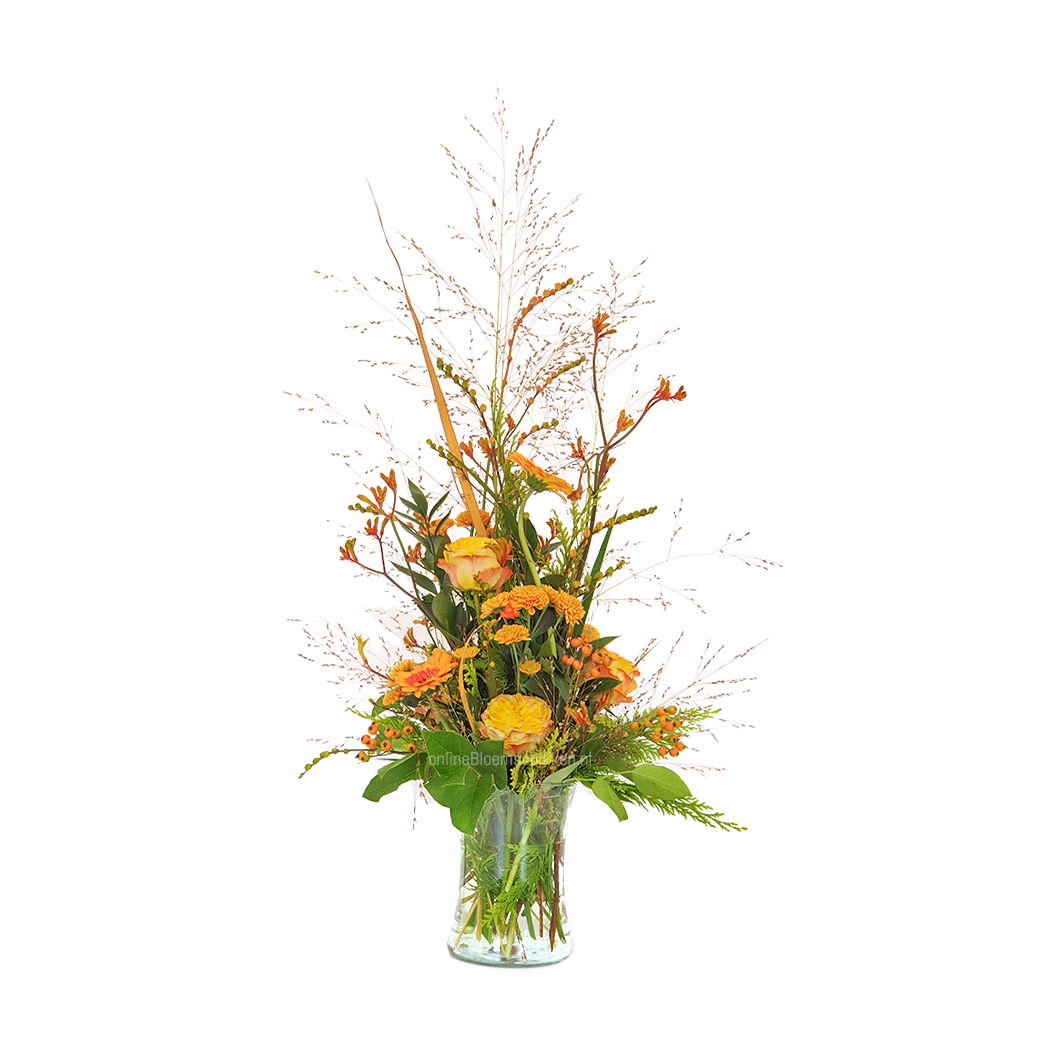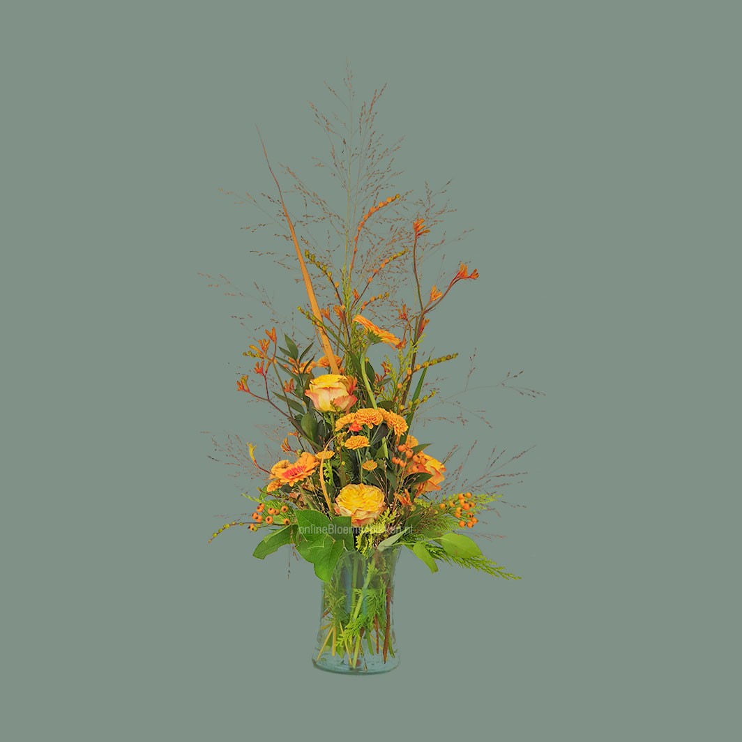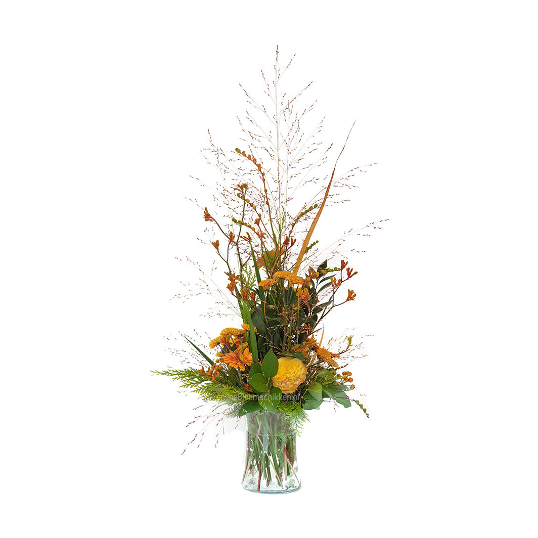 Wat een leuke creatie hebt gemaakt. Erg mooi zo met deze vaas en de materialen. Je zou ook nog wat meer of zwaardere materialen in de hoogte schikken, zoals Pampus gras ofzo, maar dat moet je natuurlijk maar in de buurt hebben. Je zal hem vast nog wel een keer maken met ook van deze mooie materialen in de nazomer. Geniet ervan.