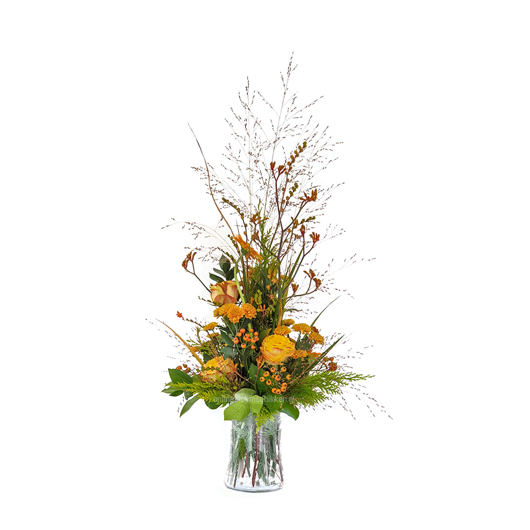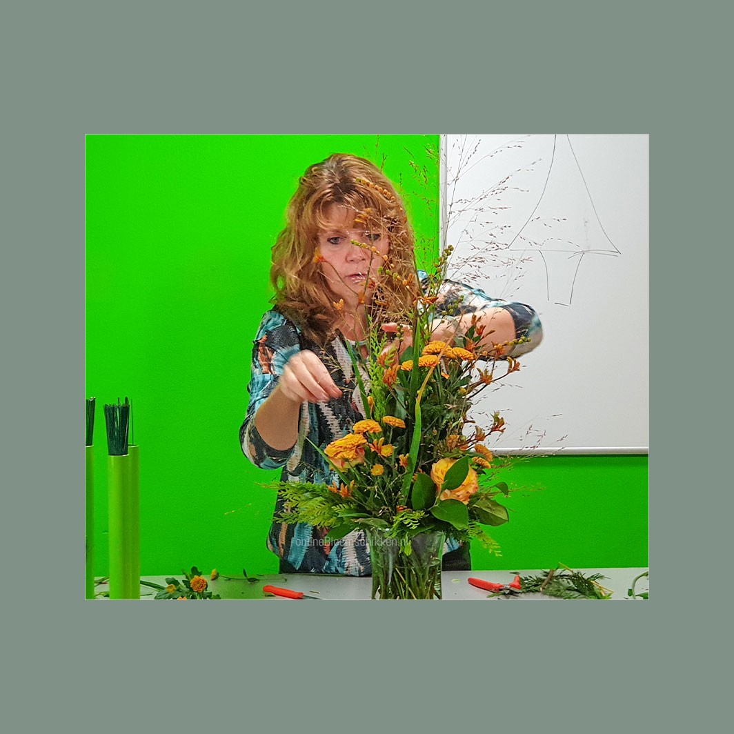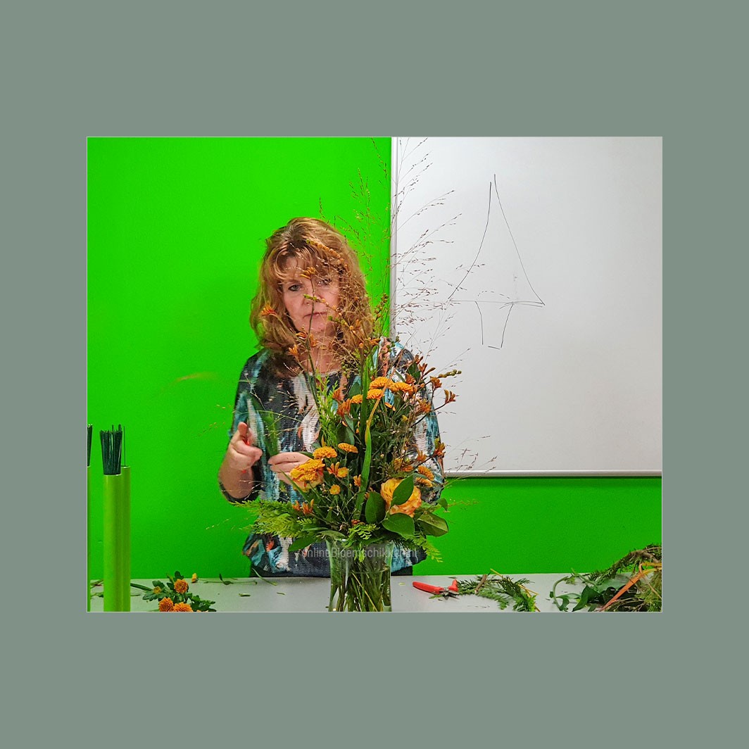 We zouden deze vaasschikking een Mille-fleurs kunnen noemen, omdat de verhoudingen en de verdeling hetzelfde zijn. Mille-fleurs is het Franse woord voor 'duizend bloemen' en we hebben dit keer juist geprobeerd met minder bloemen een alzijdig, open en elegant arrangement te maken. Die benaming zou dus niet helemaal kloppen. Het maakt niet uit hoe je de stijl noemt, maar belangrijk is dat je het vaker probeert, want het is moeilijker dan dat je zou verwachten.