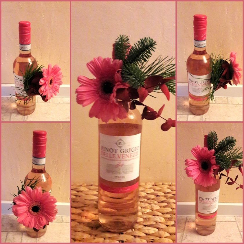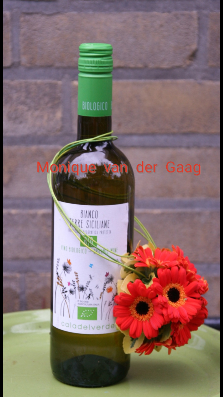 Je arrangement op de hals vind ik mooier dan op de fles zelf. Ik denk echt doordat de grote Gerbera je aankijkt. Op de hals had je hem ook naar boven kunnen laten wijzen. Als je niet de juiste bloemen hebt kan je je misschien beter aanpassen aan de bloemen die je wel hebt. Een glasversiering had goed gekund met deze materialen en dan zou je de fles er los bij kunnen doen.