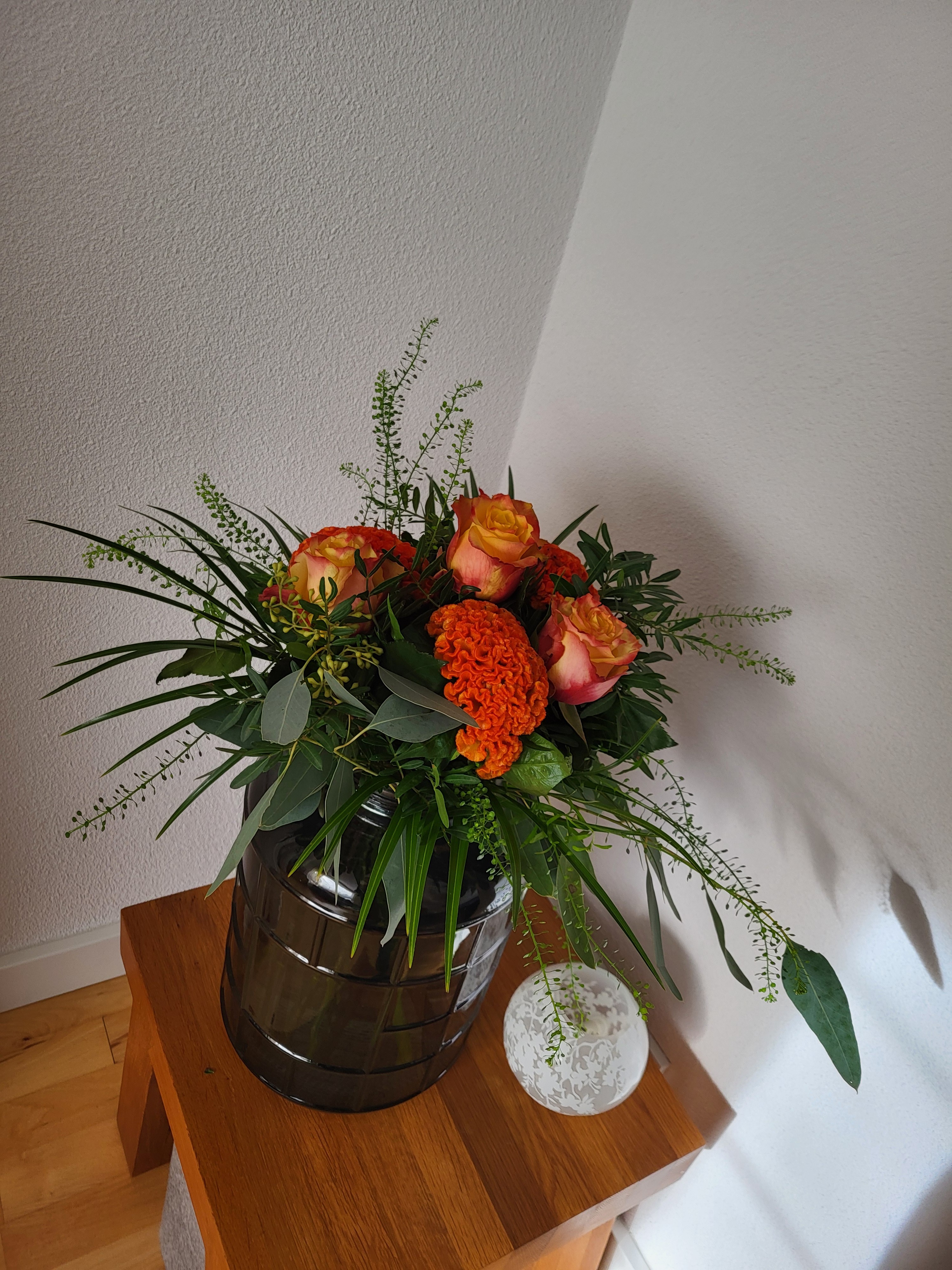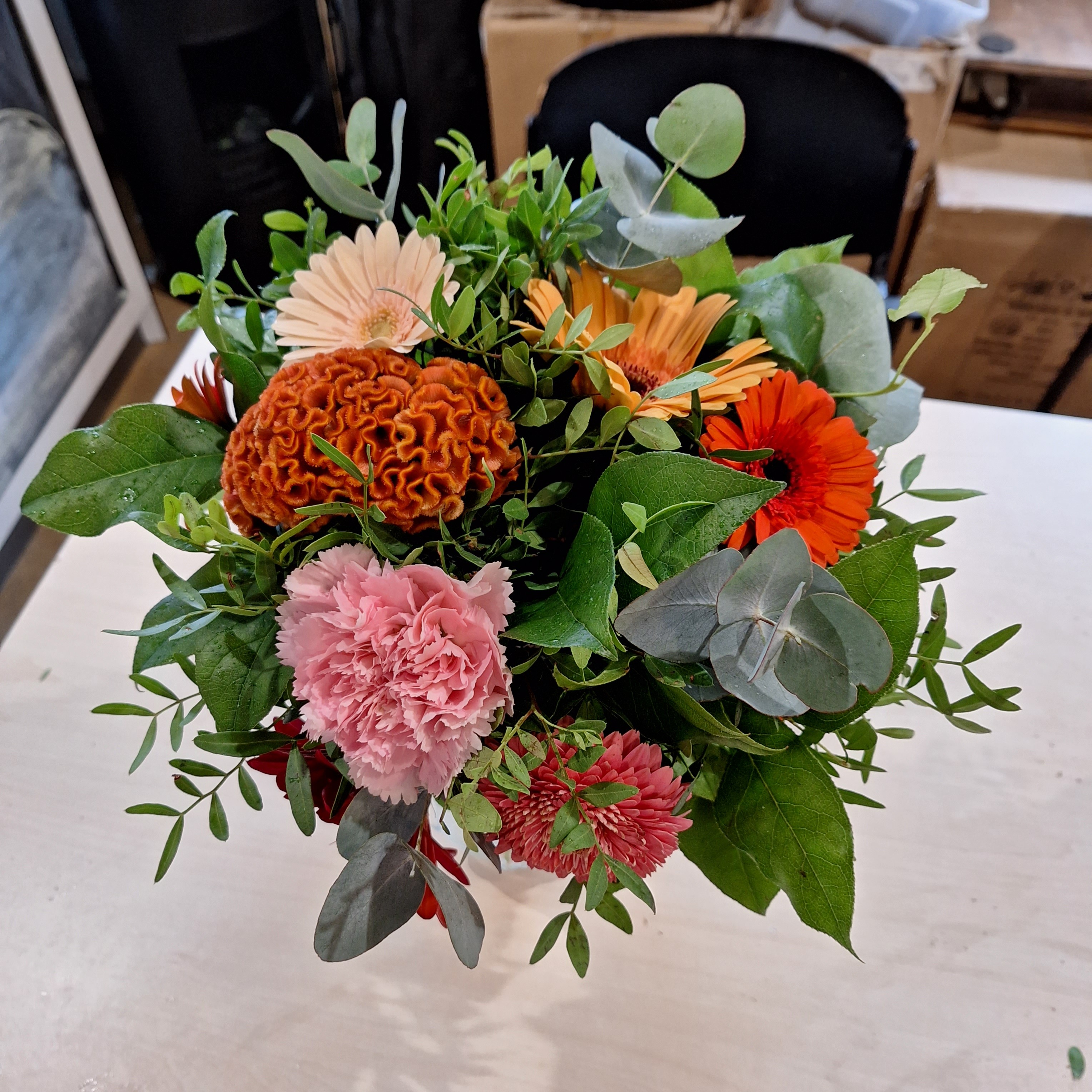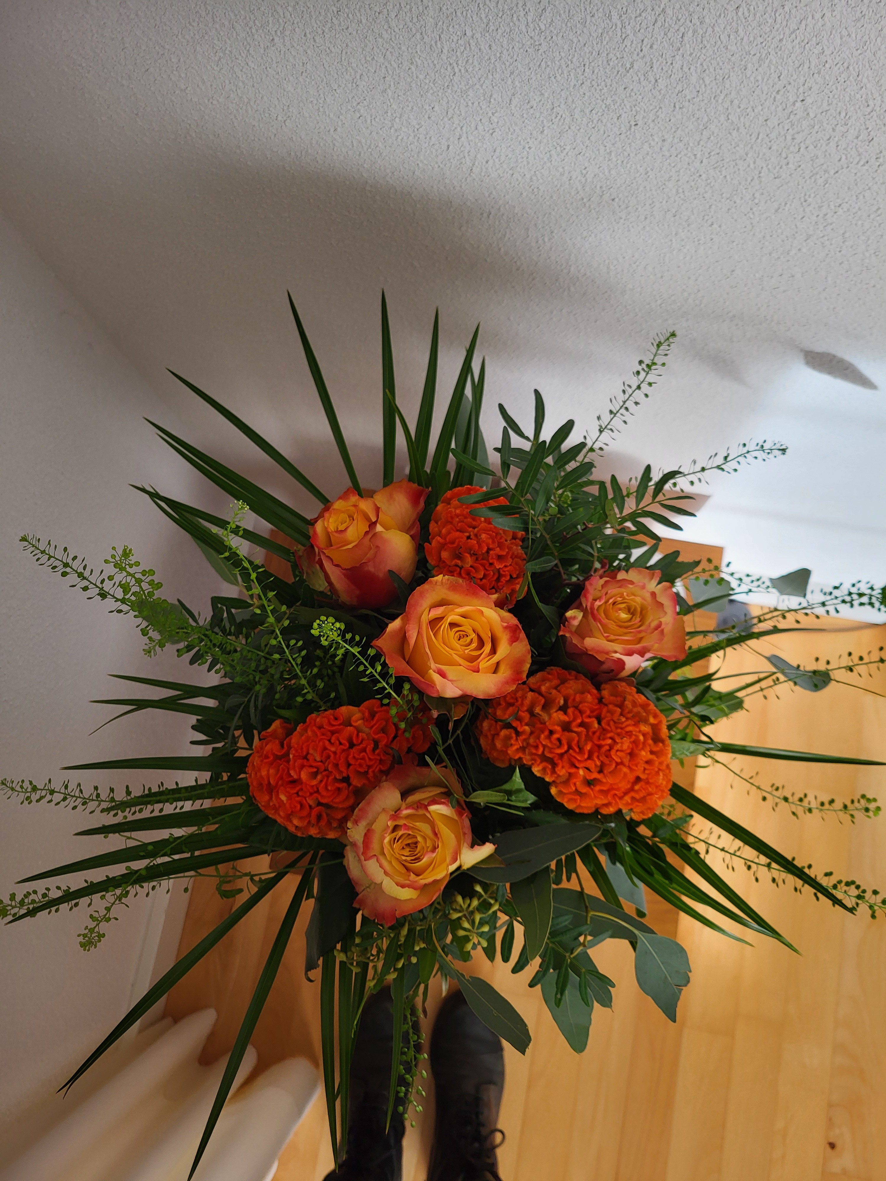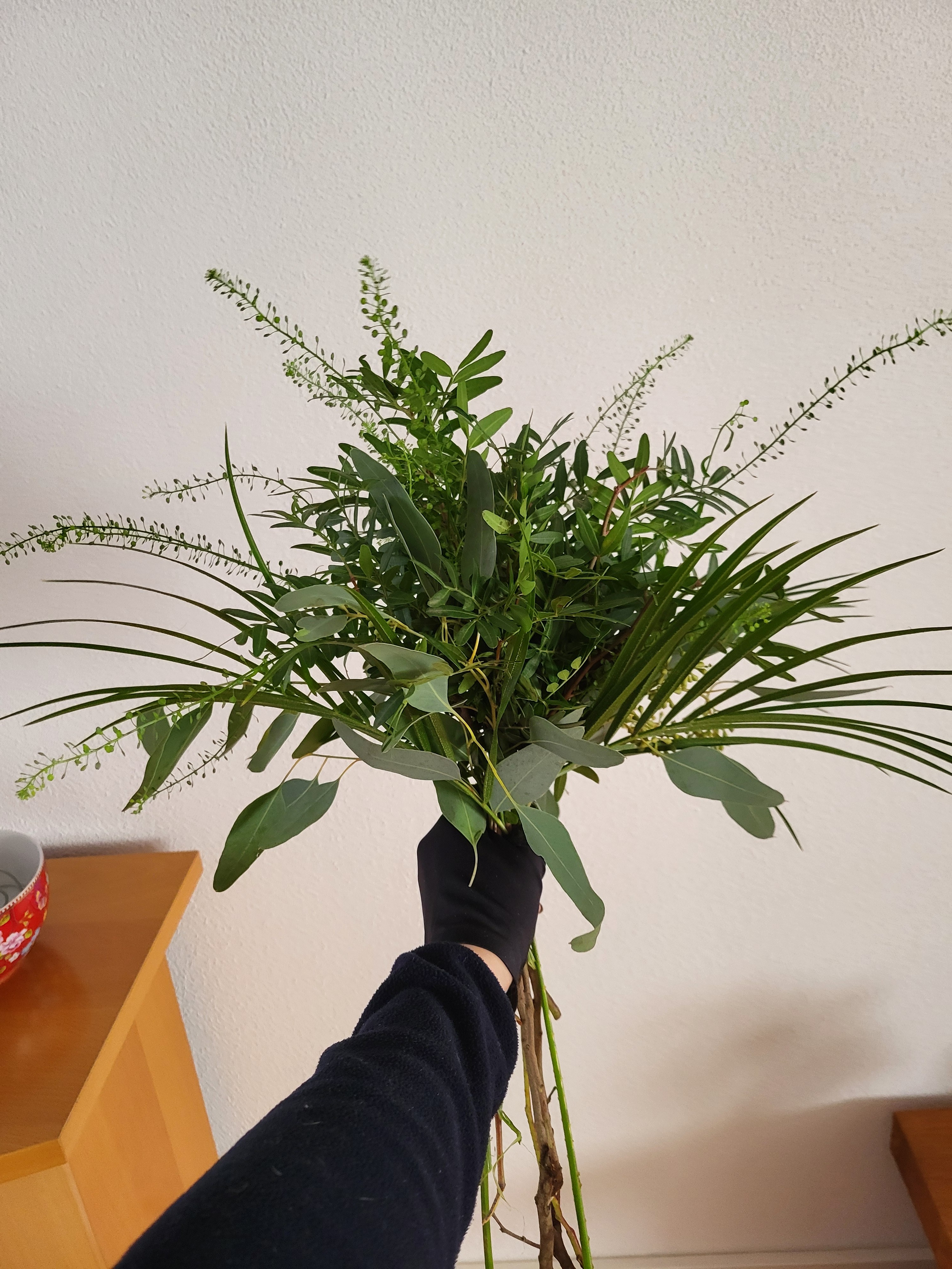 Ik heb dit boeket gemaakt met dezelfde, maar minder bloemen en met Eucalyptus, Pistache, Palmbladeren en Lepidium.