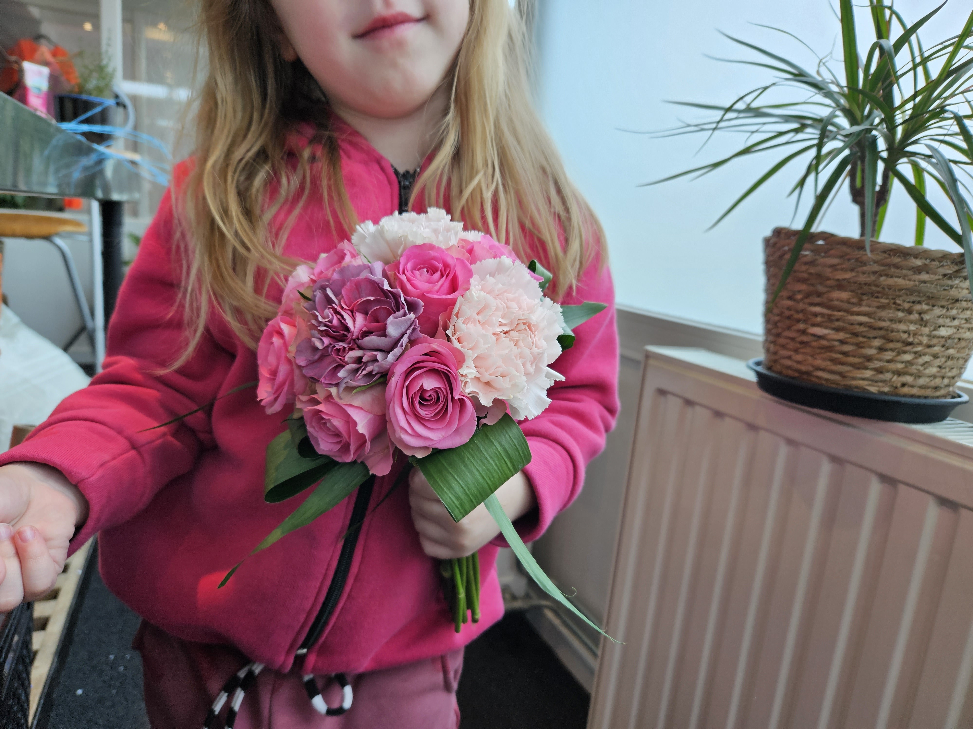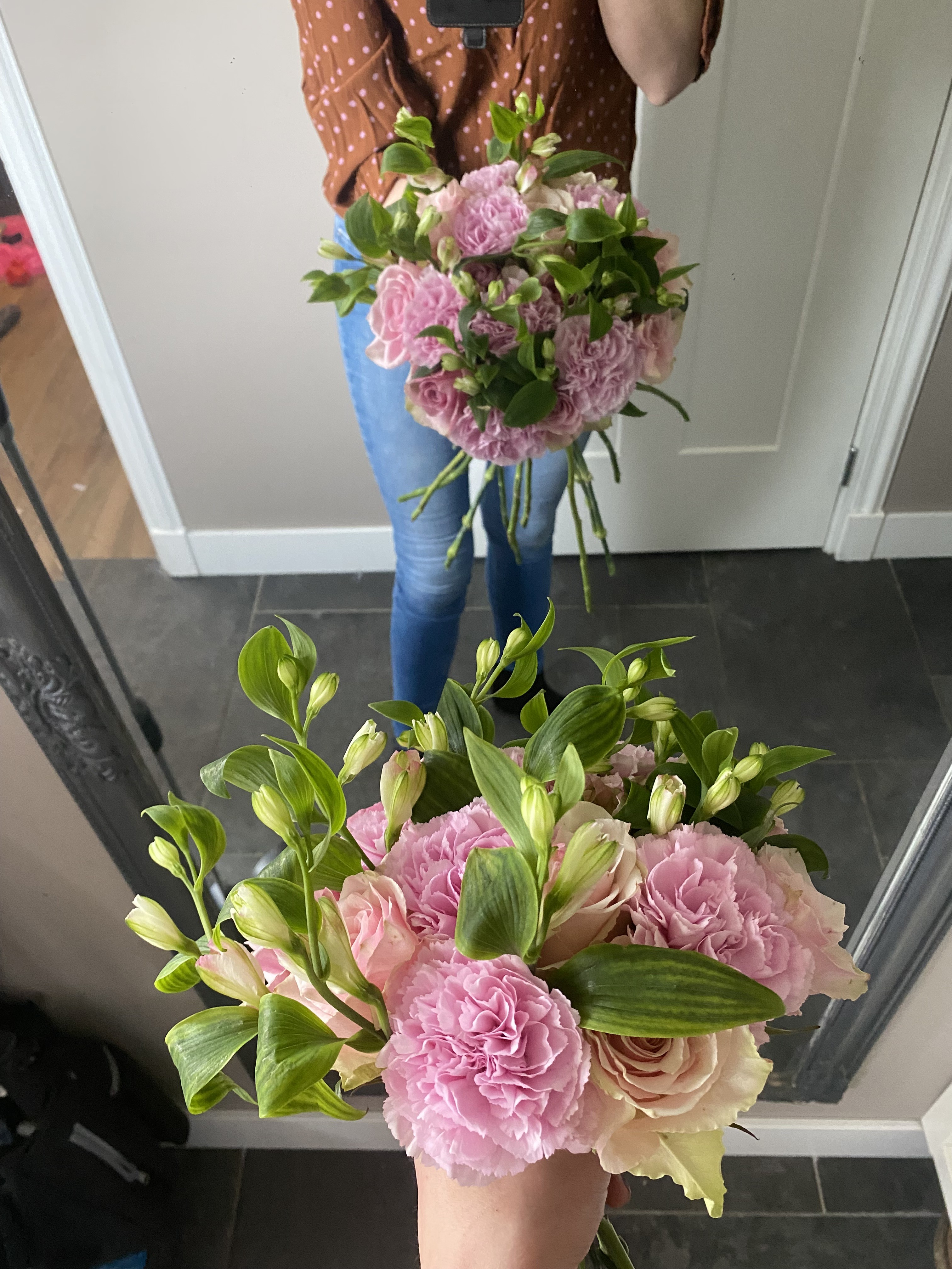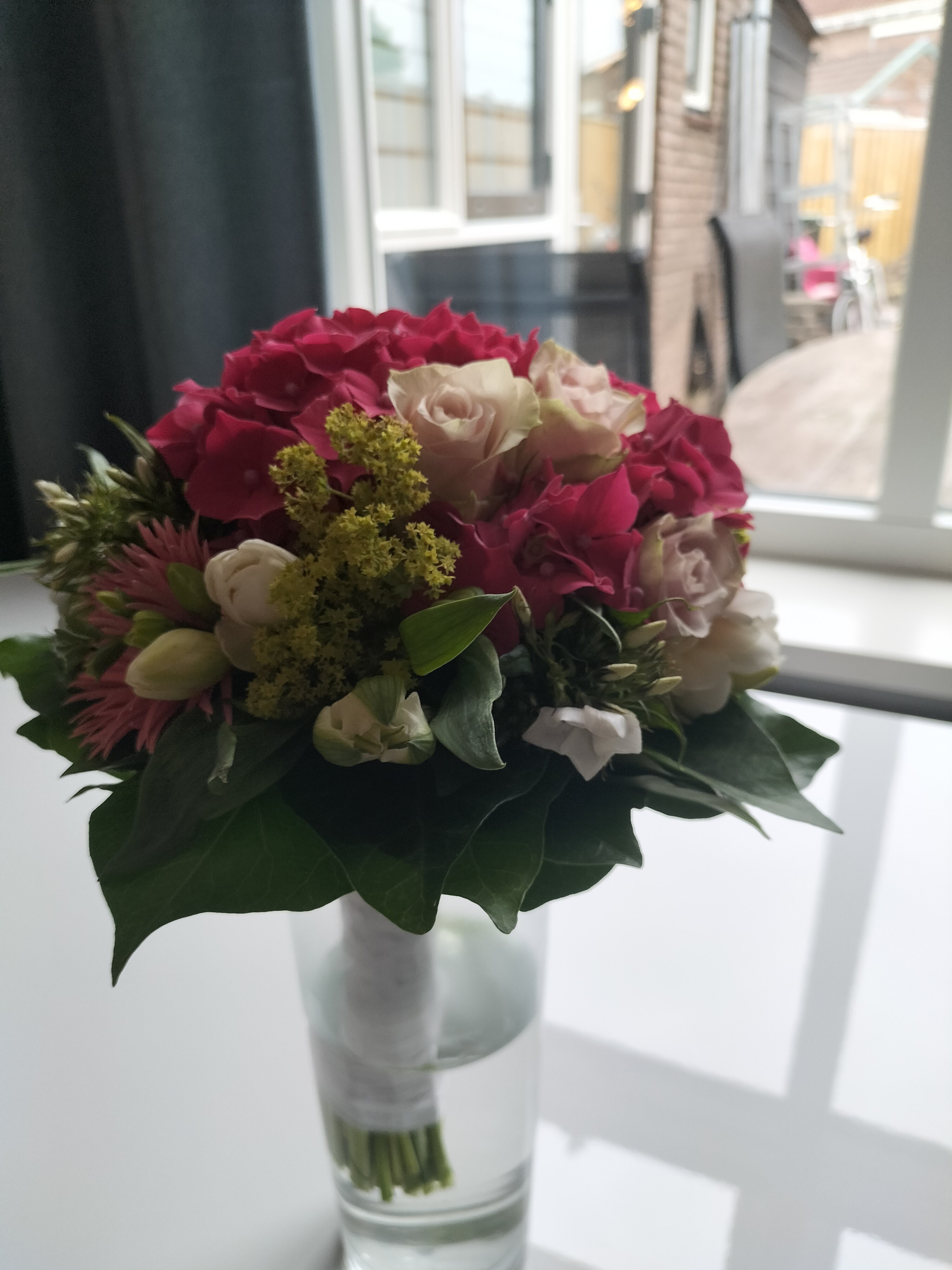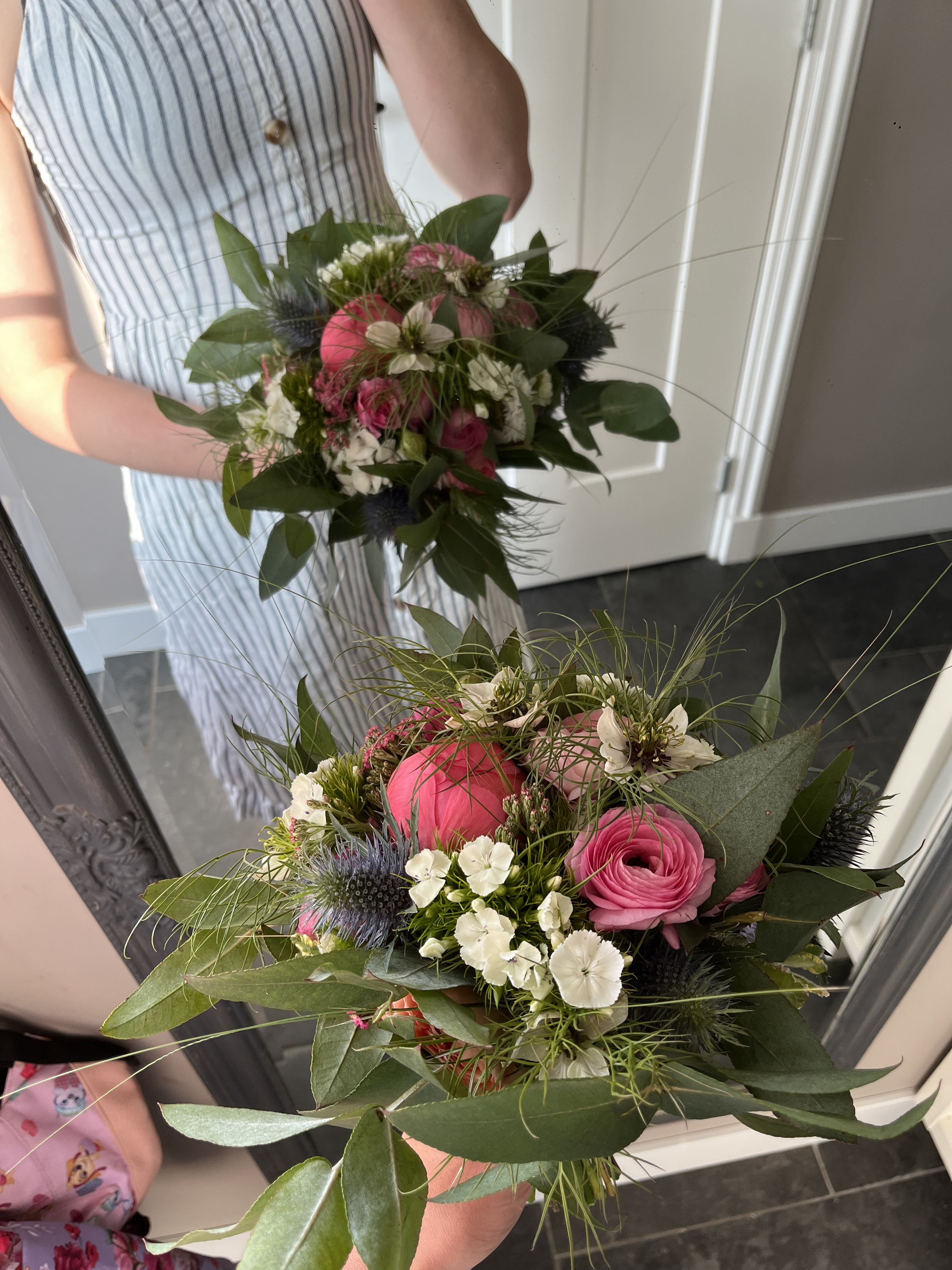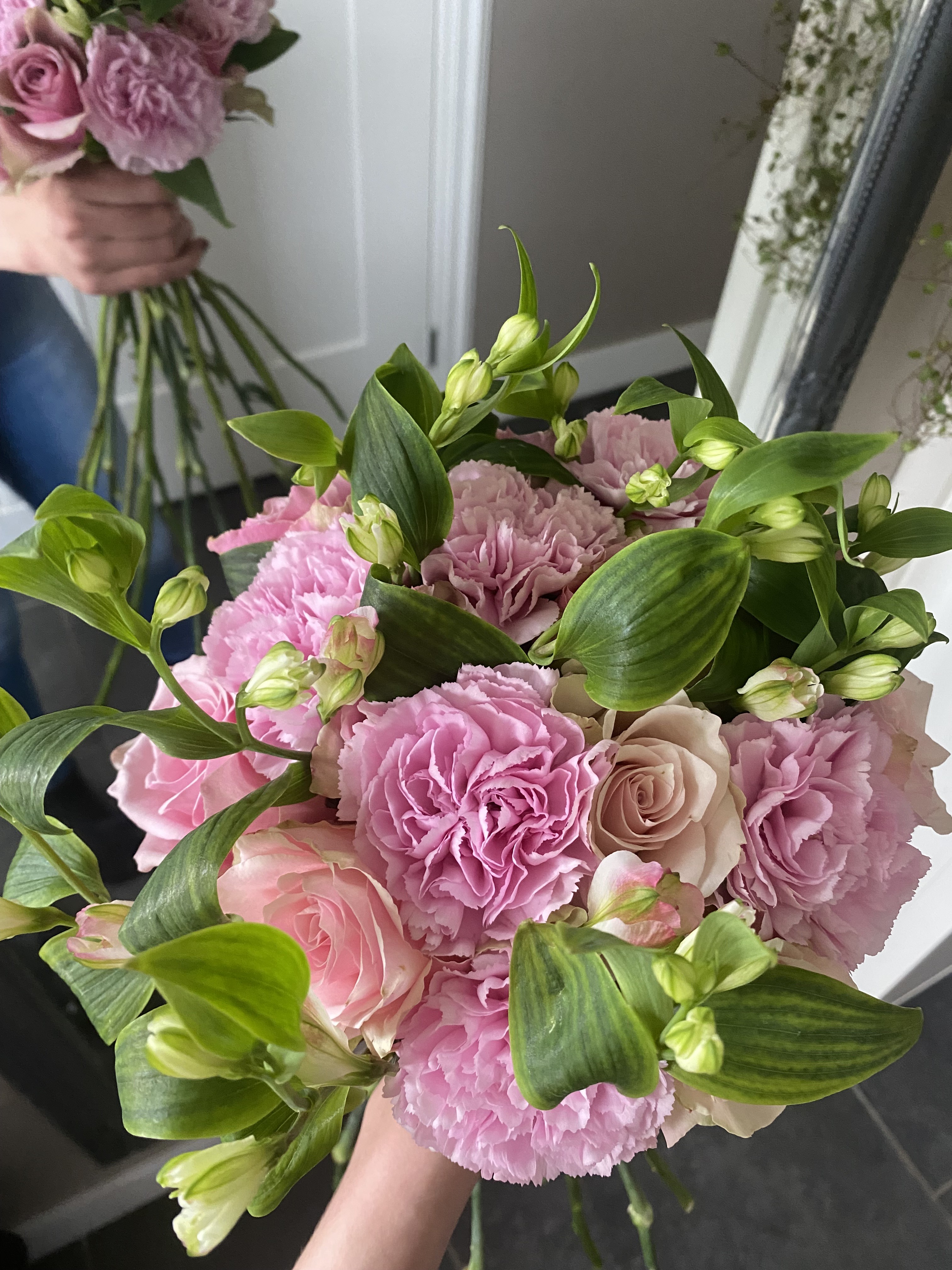 Het is zeker een mooi en lief boeket geworden! Hij heeft een klein deukje links zitten. Daar is je Dianthus net iets lager, maar ik weet zeker dat je hier een bruid heel gelukkig mee had kunnen maken. Als je hem wat speelser maakt met grassen en wat speelse bloemen past hij ook helemaal in de trend van nu. Geniet lekker van je boeket, je hebt hem echt heel mooi gemaakt en keurig afgewerkt.