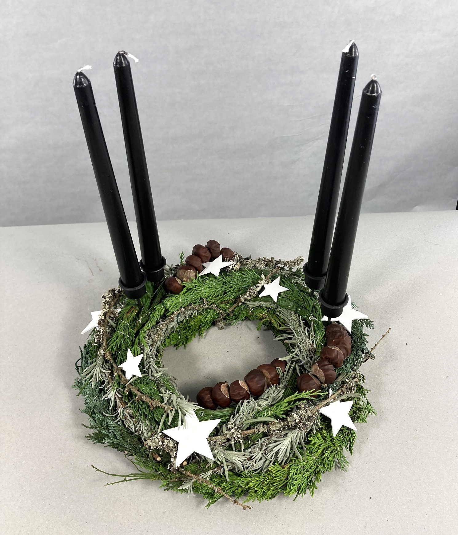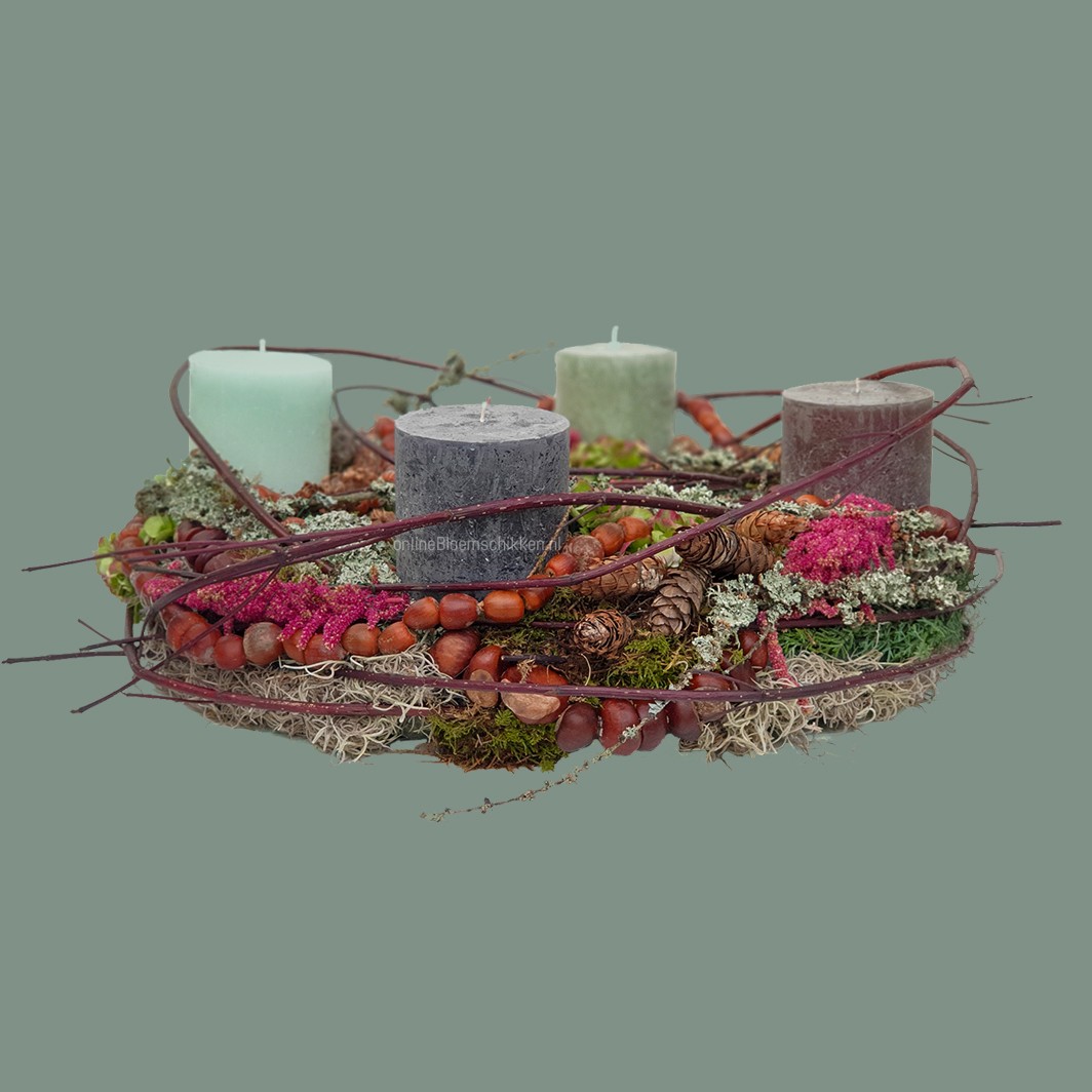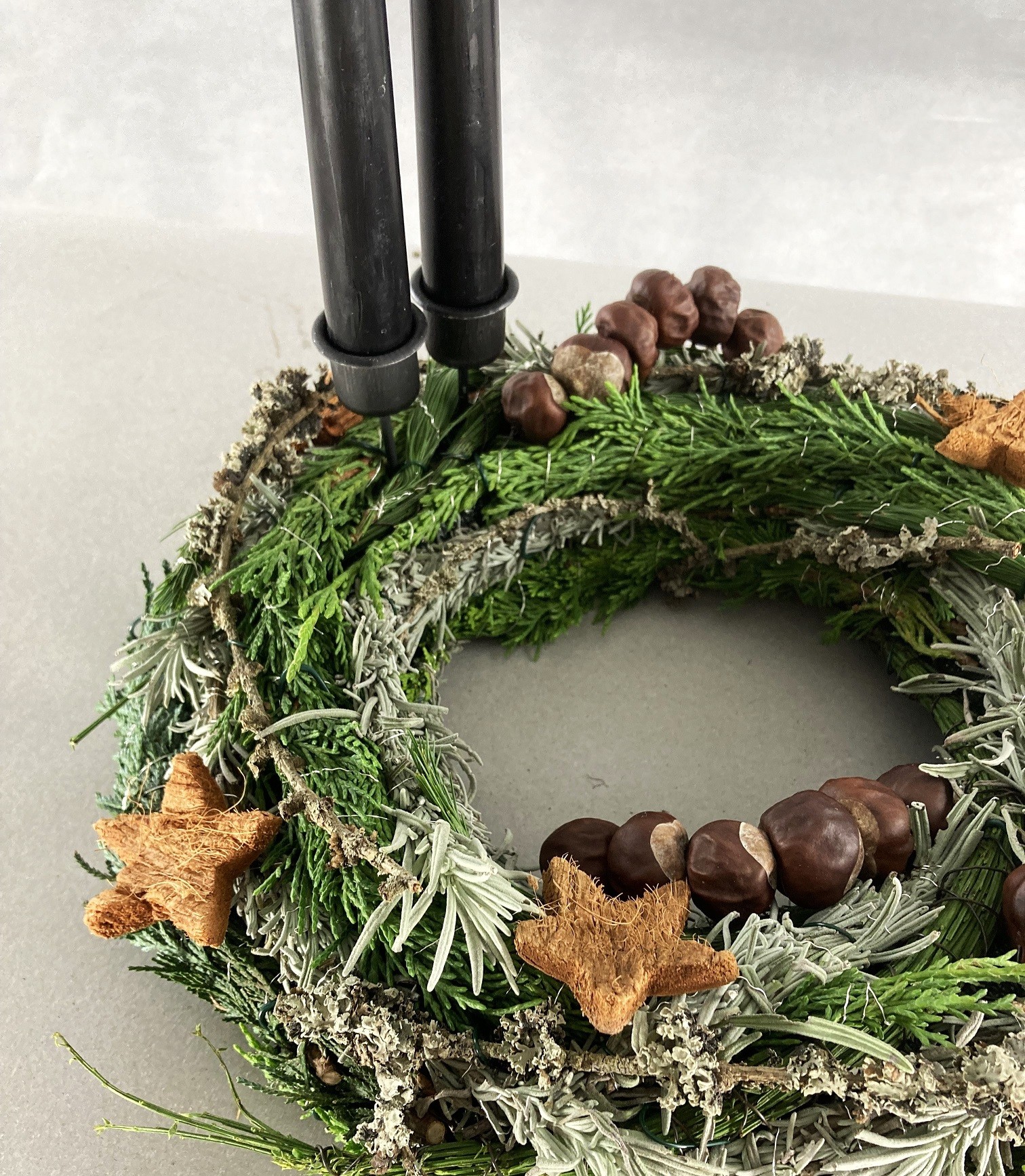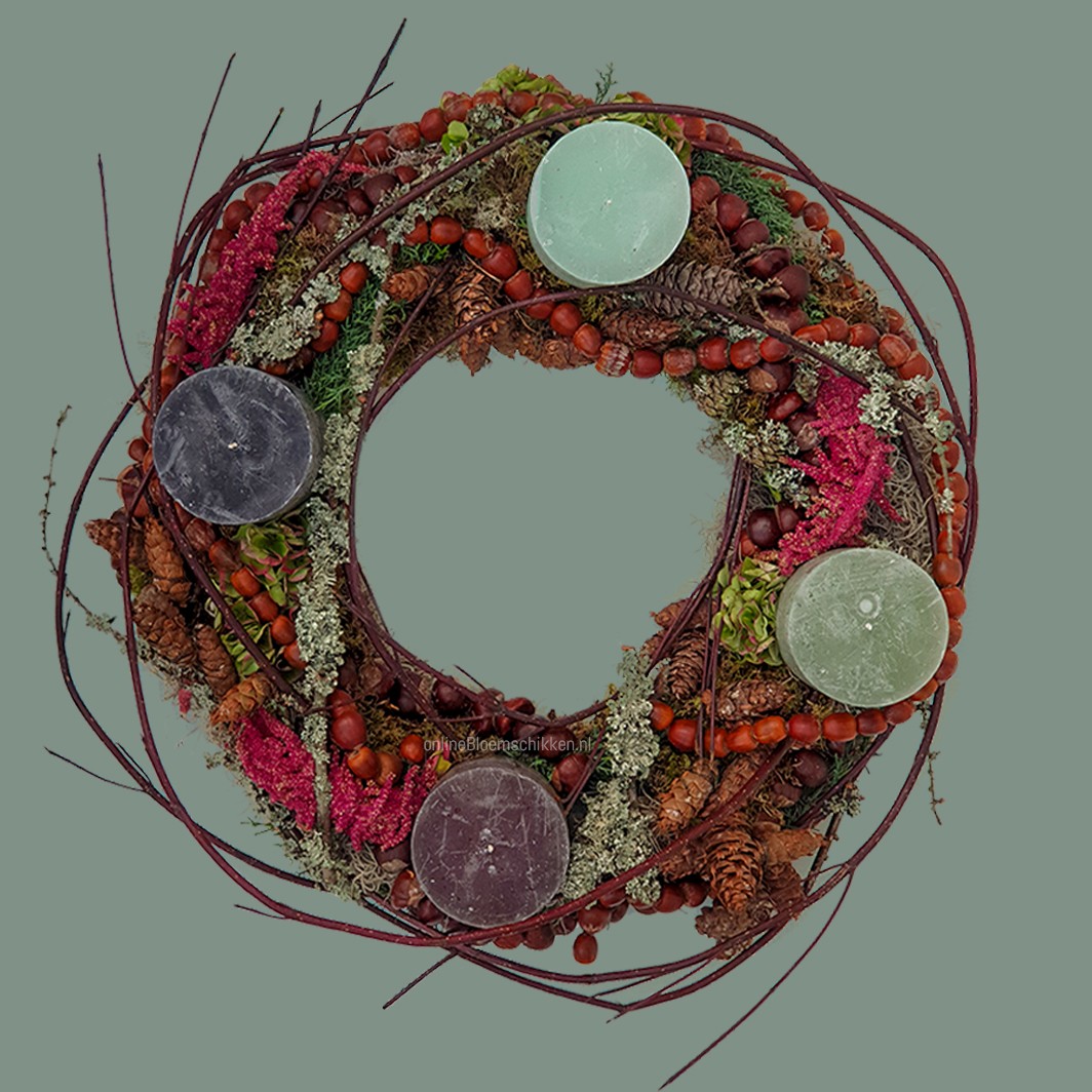 Naarmate we dichter bij de kerst komen kan je hem natuurlijk makkelijk met kerstmaterialen aanvullen. Dan is je Adventskrans helemaal compleet.