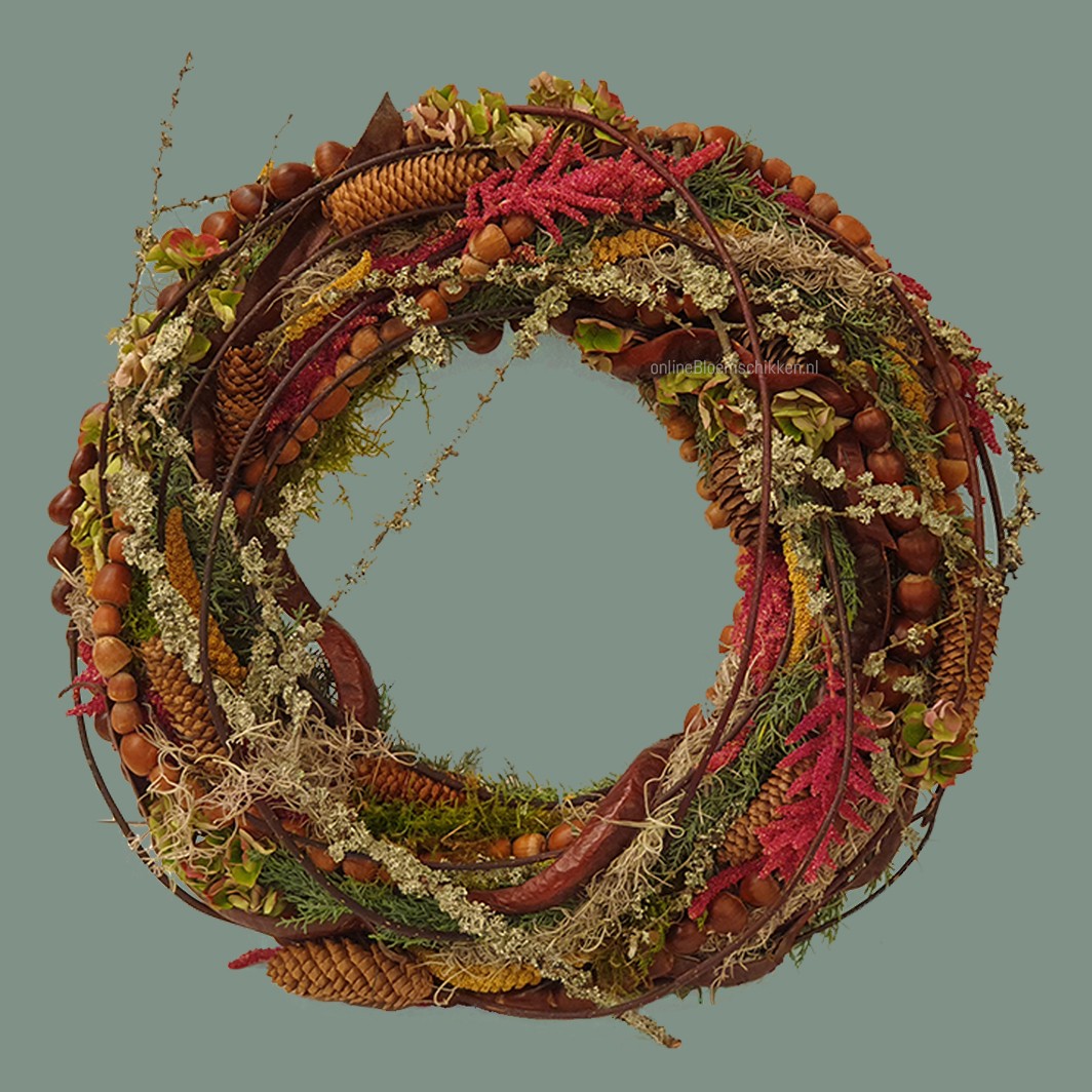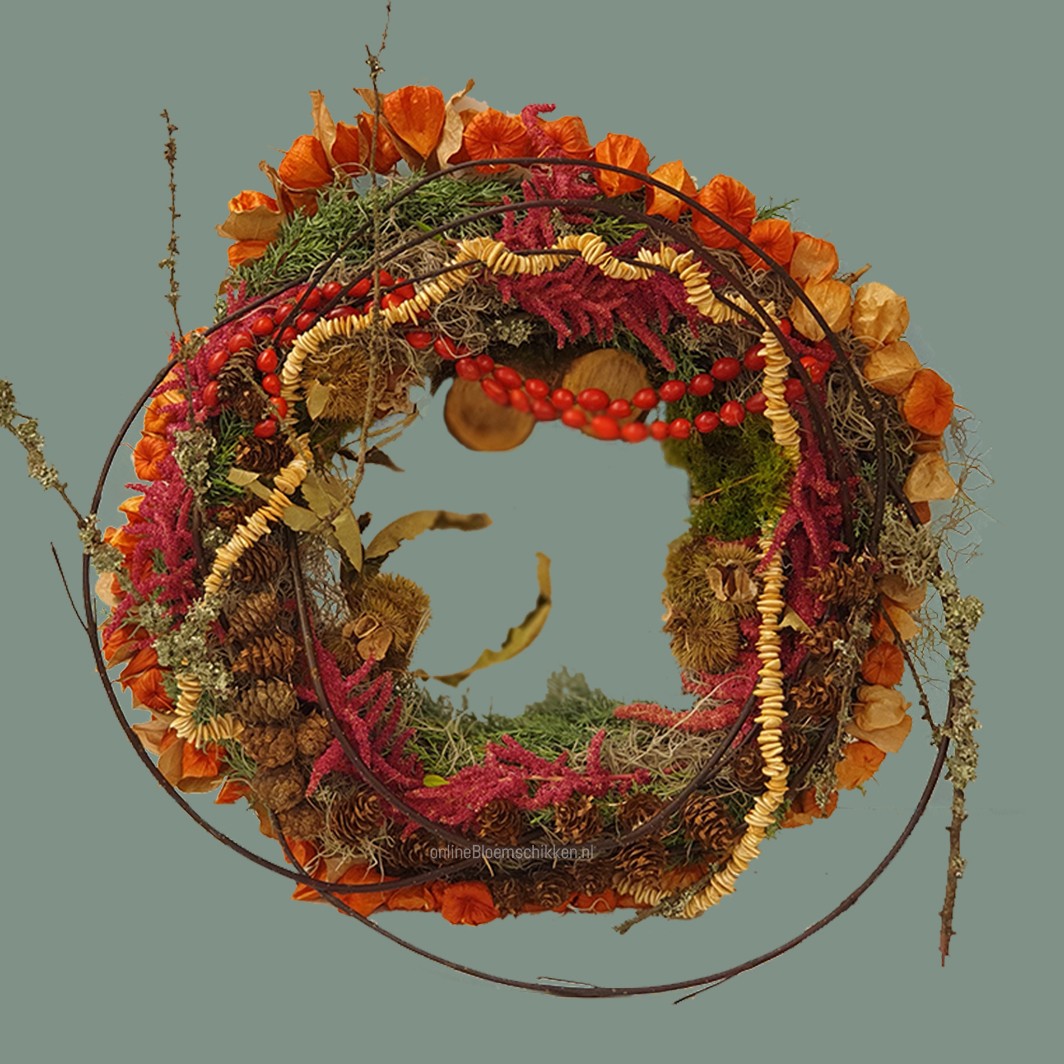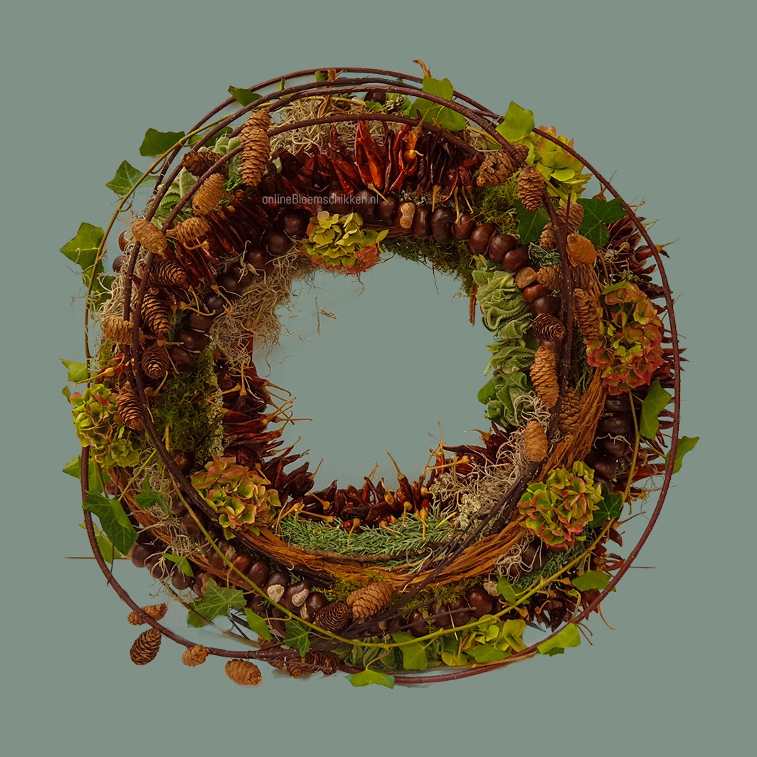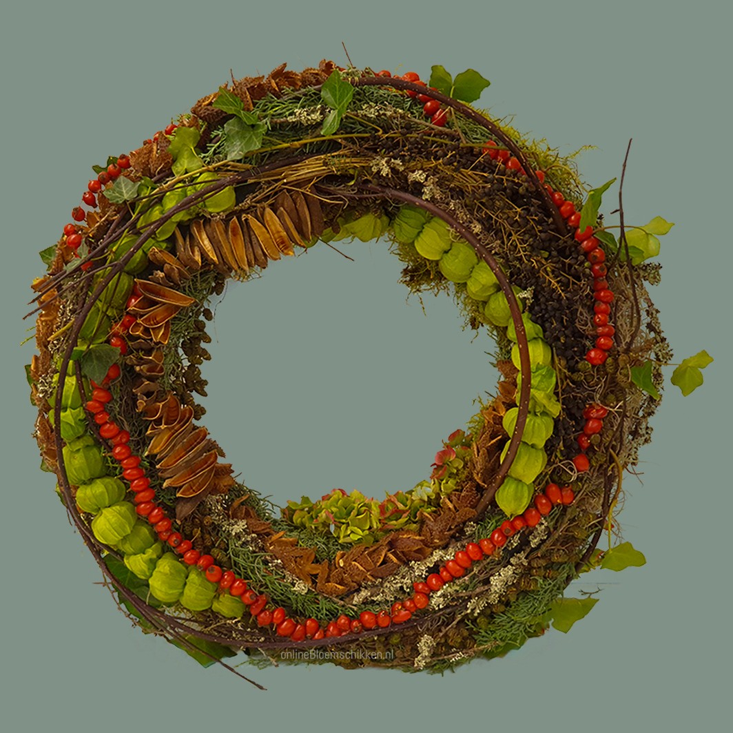 De ronde vorm van een krans symboliseert het oneindige. Nu zal deze krans niet oneindig mooi blijven, maar hij zal wel heel lang mooi blijven. Even op een heel andere manier gemaakt dan met de 'standaard' wikkeltechniek, waardoor je veel meer diepte krijgt.